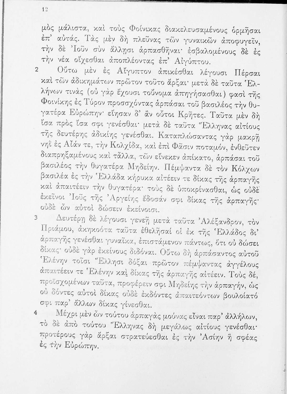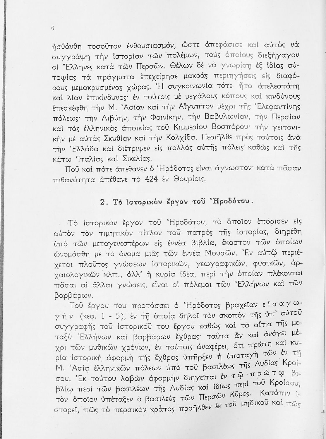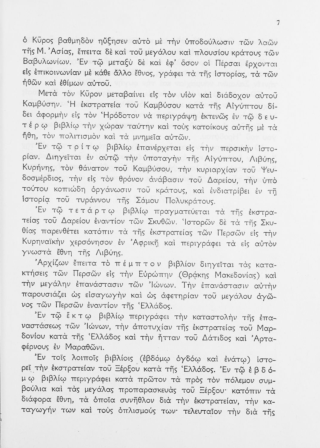 Σχολικό εγχειρίδιο Αρχαίων Ελληνικών Γ΄ Γυμνασίου που περιλαμβάνει εισαγωγή στη ζωή και το έργο του Ηρόδοτου, αποσπάσματα από την Ιστορία του, ερμηνευτικές σημειώσεις και τοπογραφικούς πίνακες με εικόνες και χάρτες. Φέρει το σύμβολο της δικτατορίας.