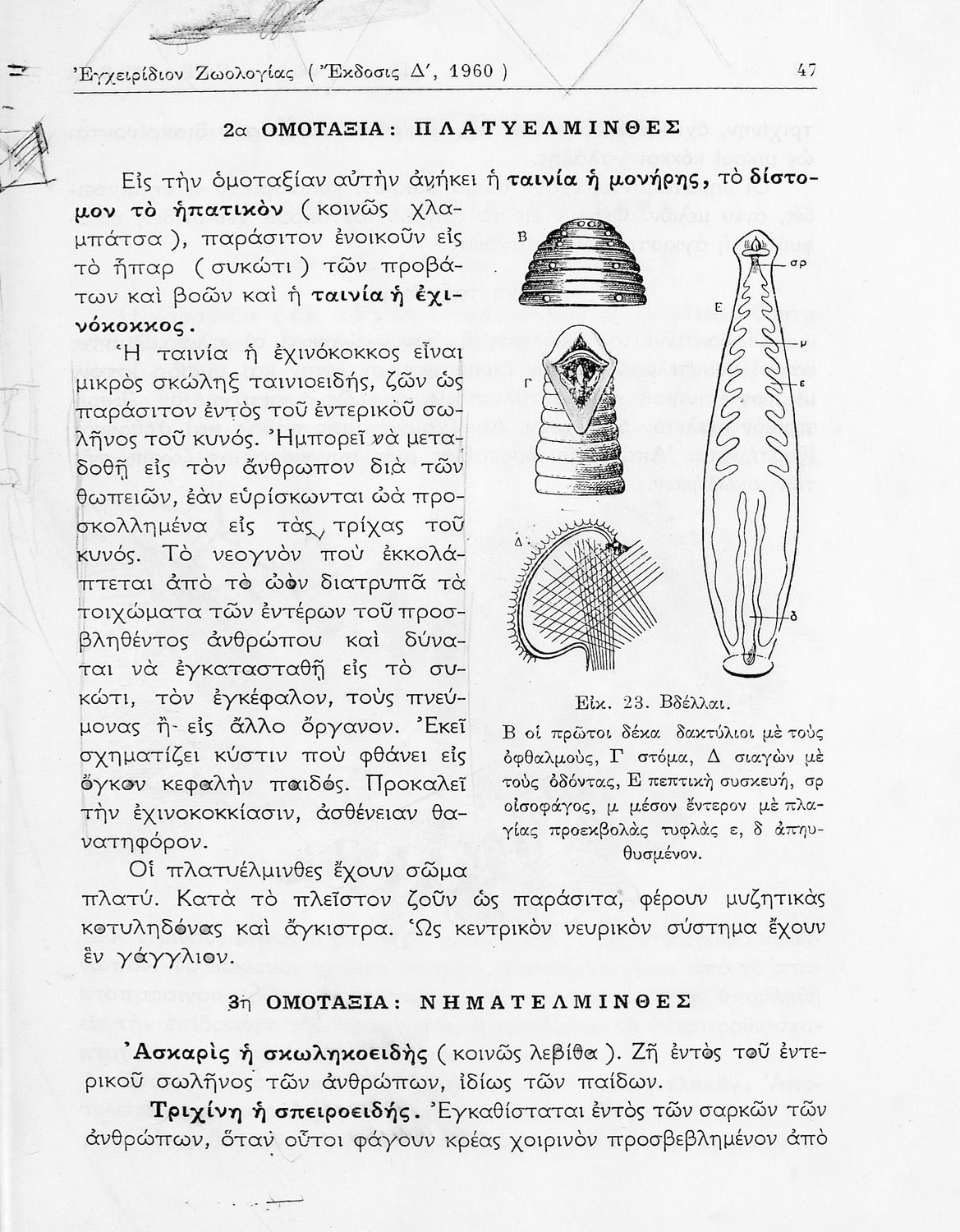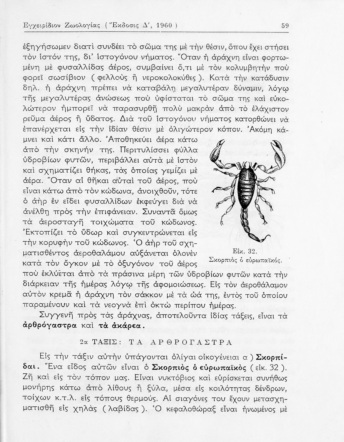 Σχολικό εγχειρίδιο Ζωολογίας για την Γ΄ τάξη των Εξαταξίων Γυμνασίων που παρουσιάζει τα διάφορα ζώα ανάλογα με την συνομοταξία στην οποία ανήκουν.