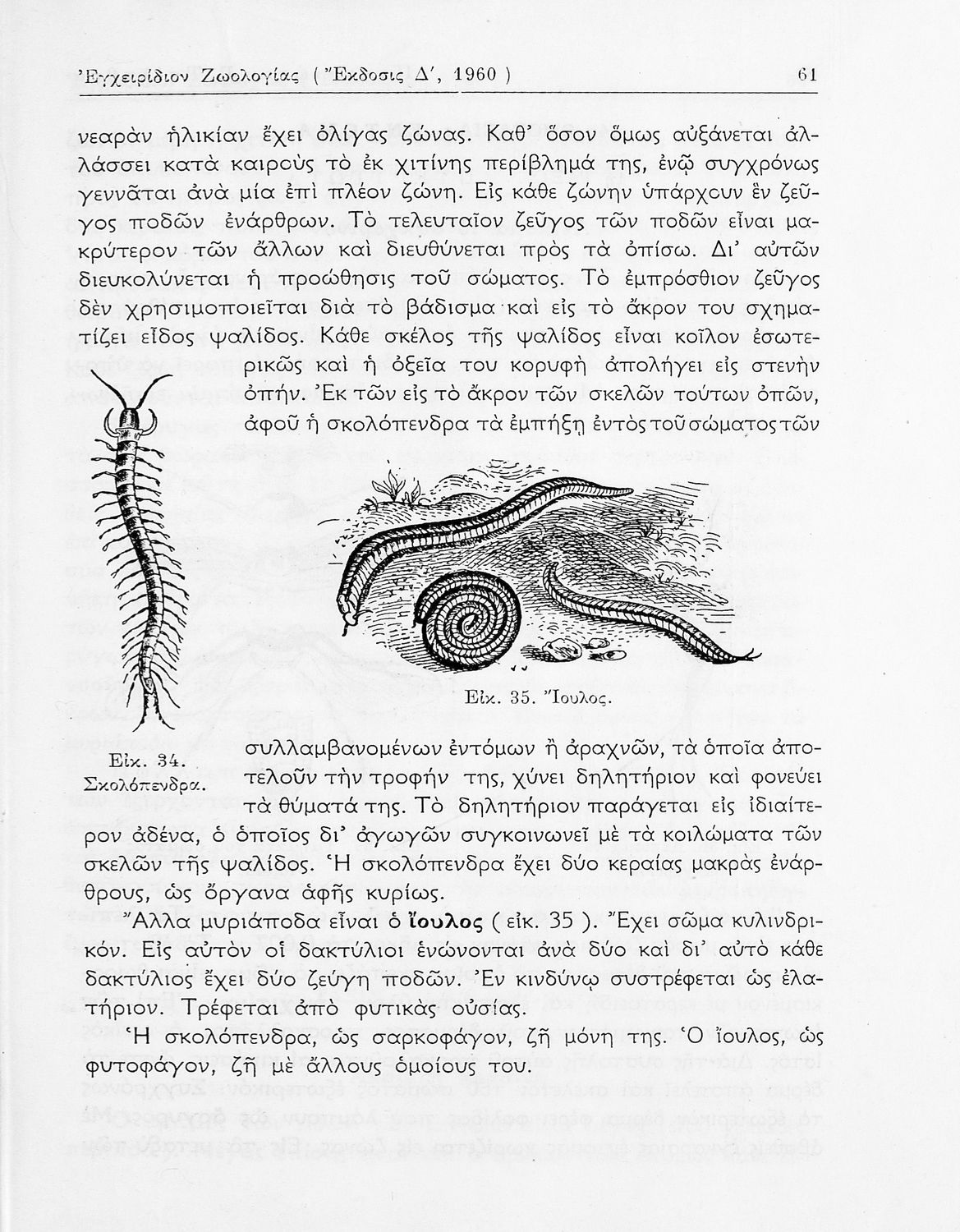 Σχολικό εγχειρίδιο Ζωολογίας για την Γ΄ τάξη των Εξαταξίων Γυμνασίων που παρουσιάζει τα διάφορα ζώα ανάλογα με την συνομοταξία στην οποία ανήκουν.