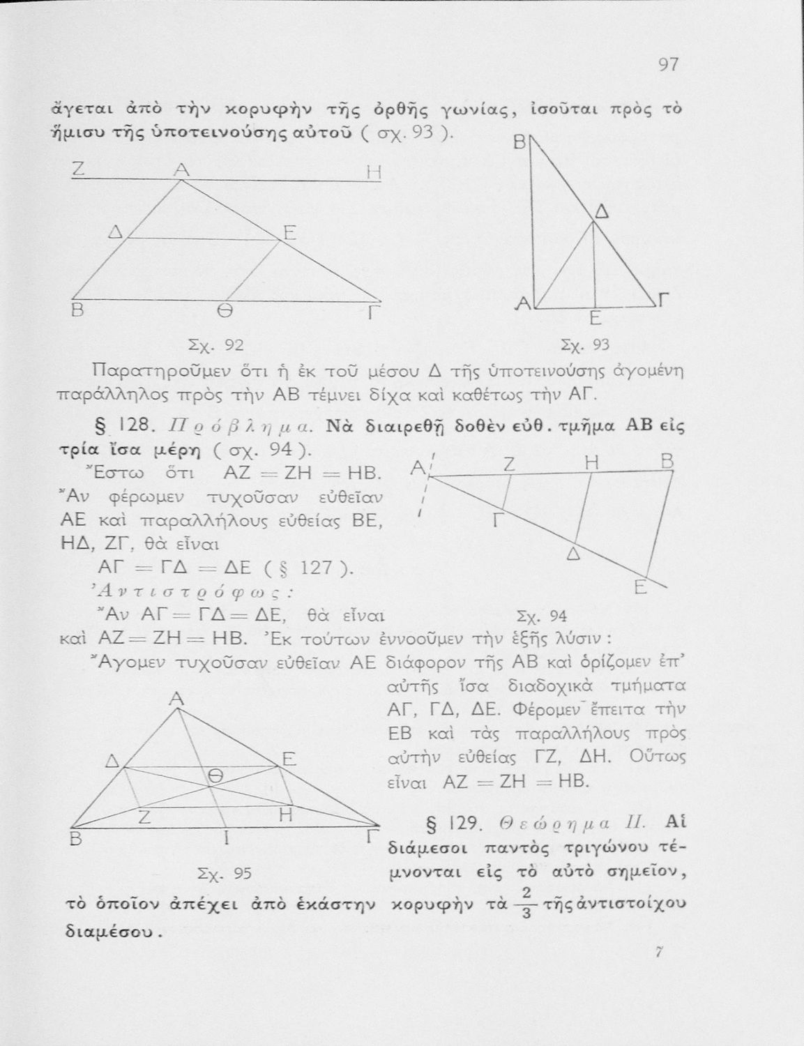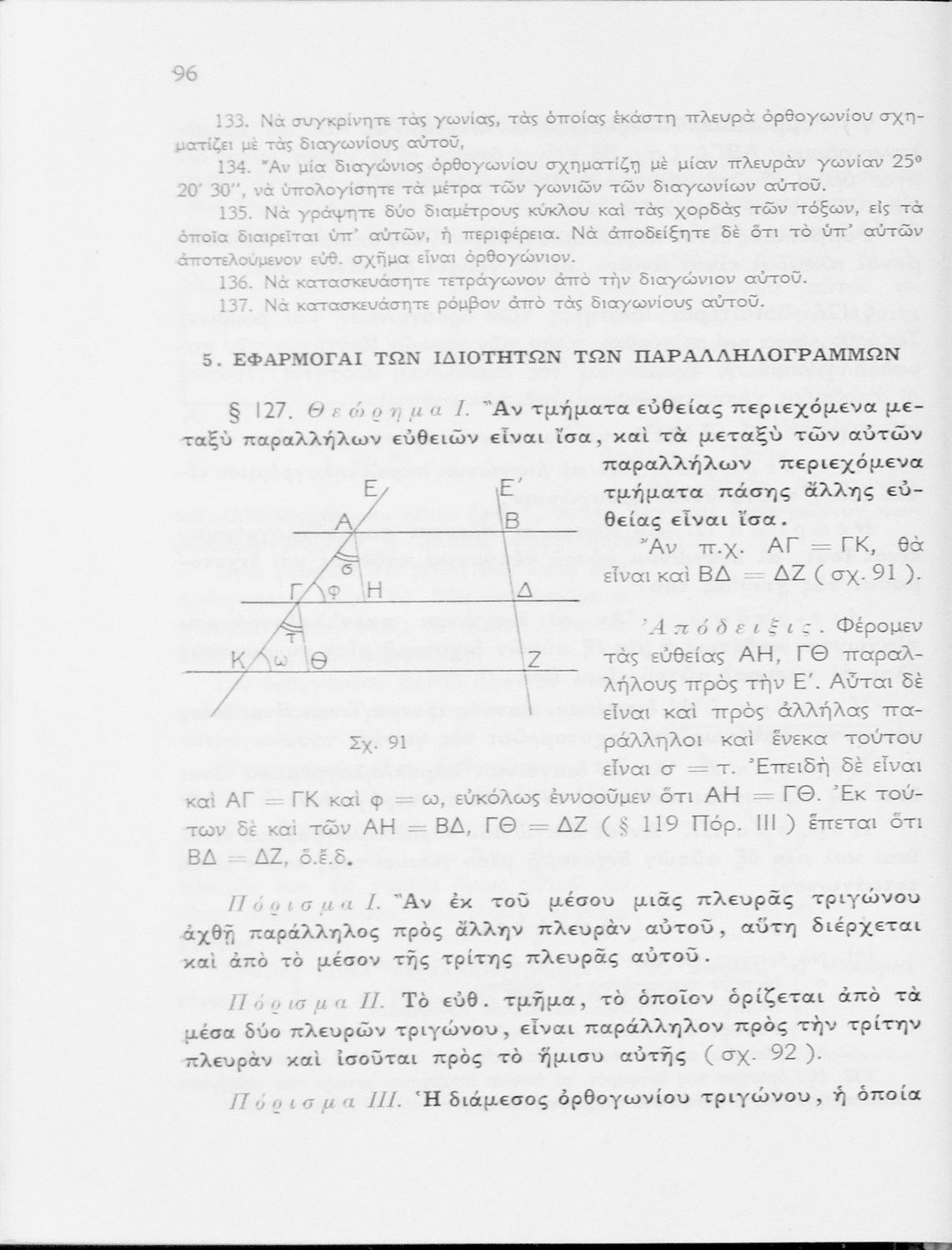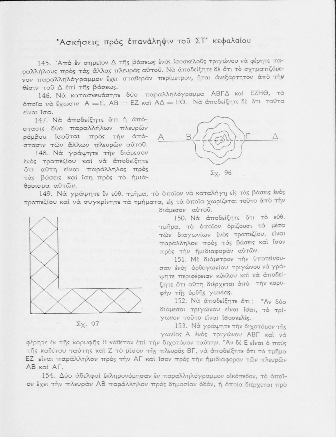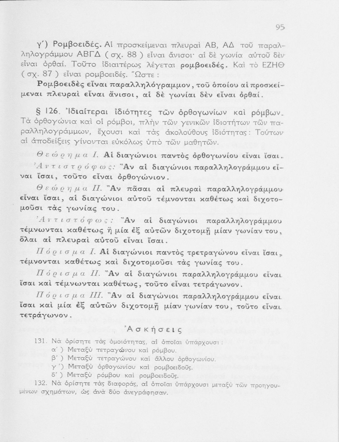 Σχολικό εγχειρίδιο Γεωμετρίας Γυμνασίου που είναι χωρισμένο σε θεωρήματα και ασκήσεις και εστιάζει στα βασικά θεωρήματα και ιδιότητες των γεωμετρικών σχημάτων. .
