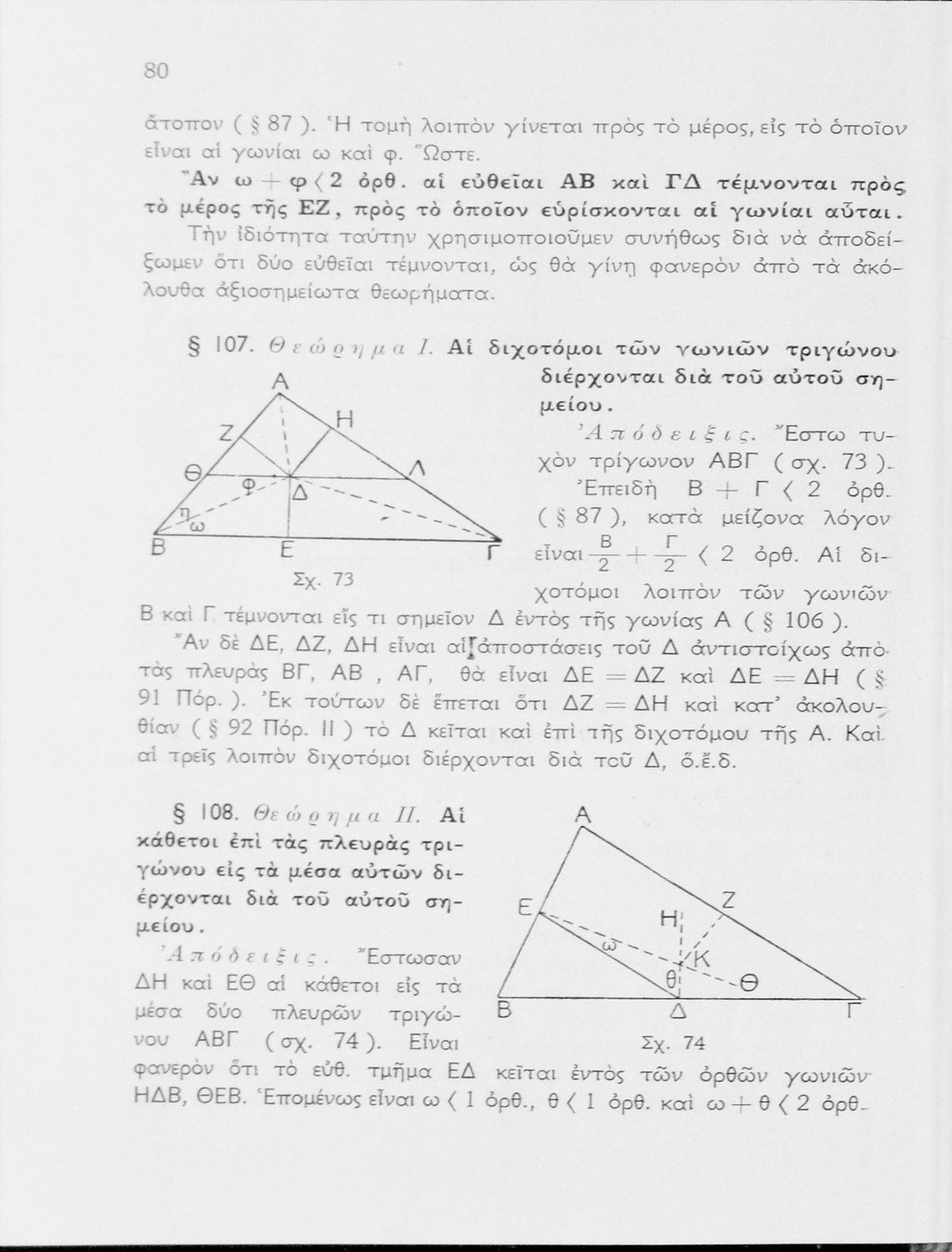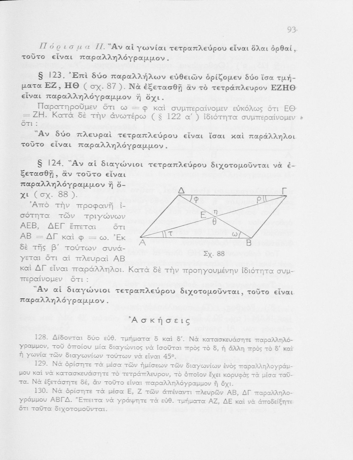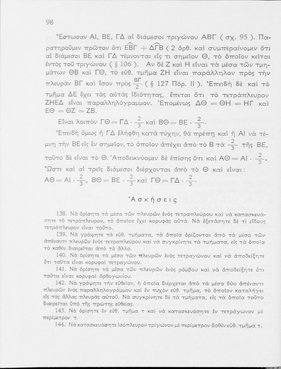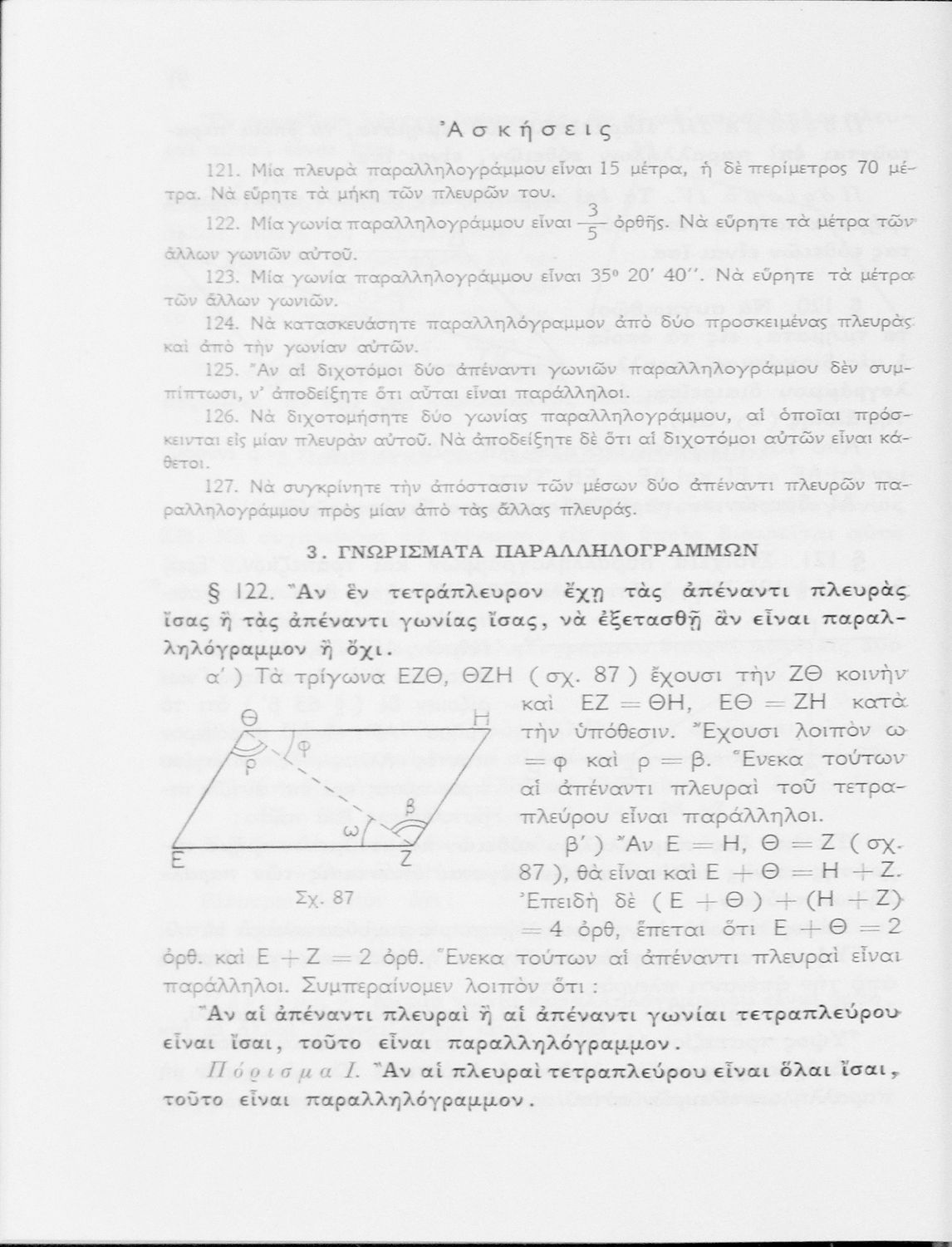 Σχολικό εγχειρίδιο Γεωμετρίας Γυμνασίου που είναι χωρισμένο σε θεωρήματα και ασκήσεις και εστιάζει στα βασικά θεωρήματα και ιδιότητες των γεωμετρικών σχημάτων. .
