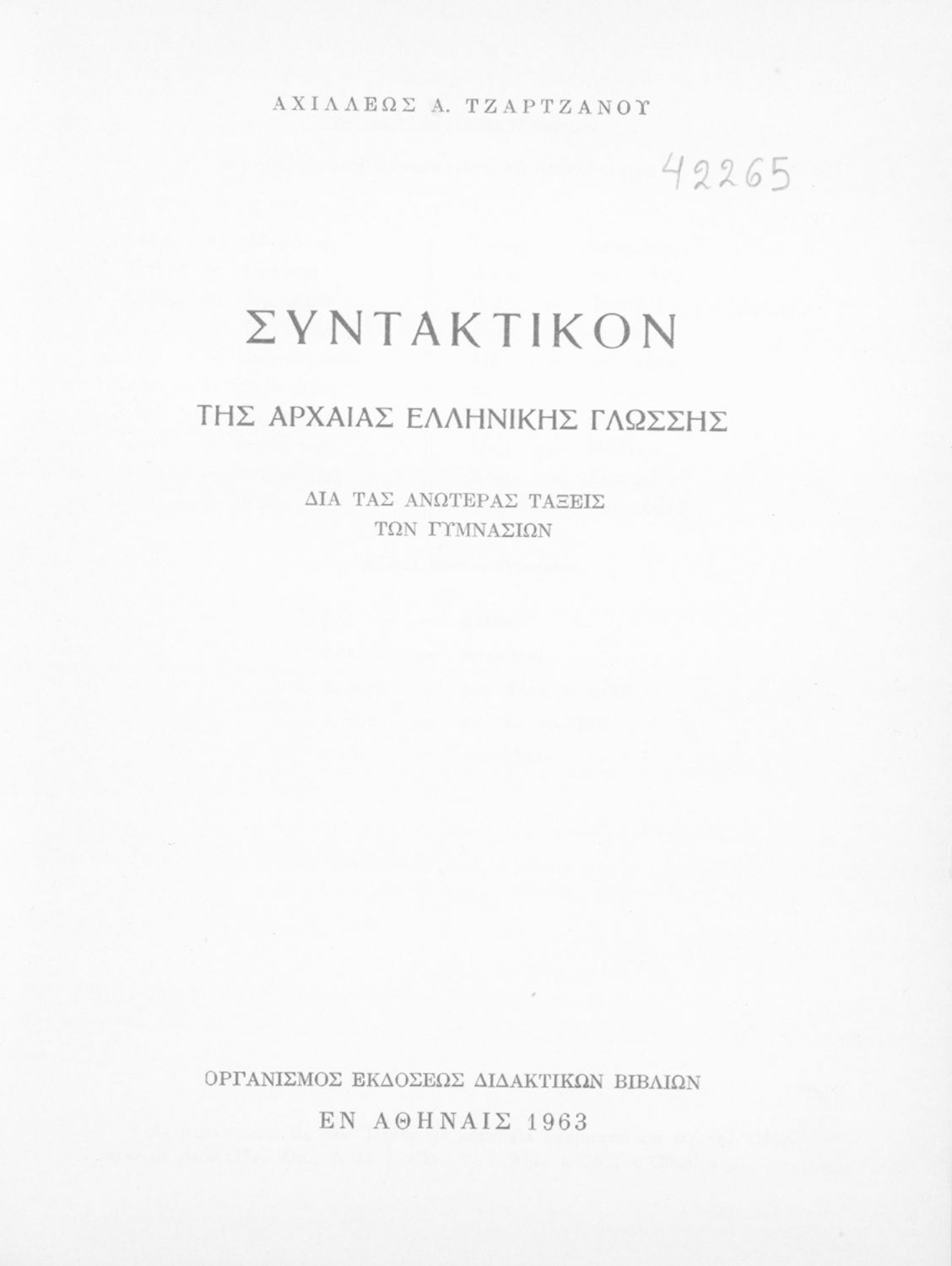 Τίτλος: Συντακτικόν της αρχαίας ελληνικής γλώσσης δια τα ς ανωτέρας Τάξεις των Γυμνασίων