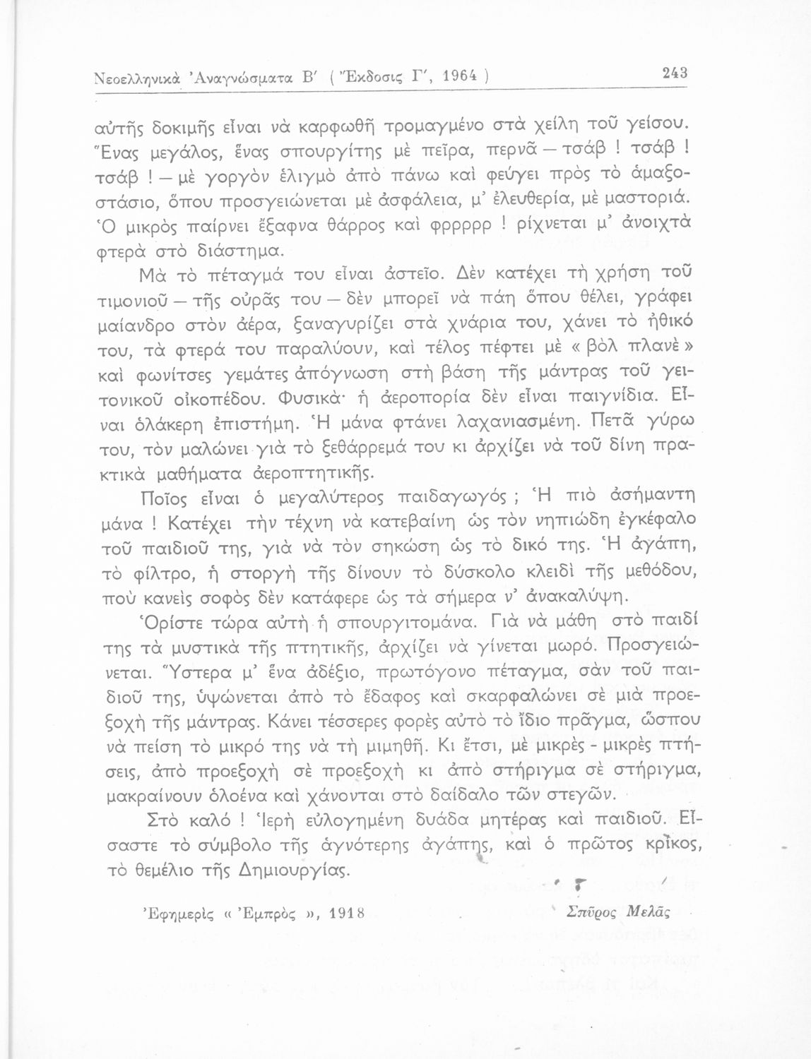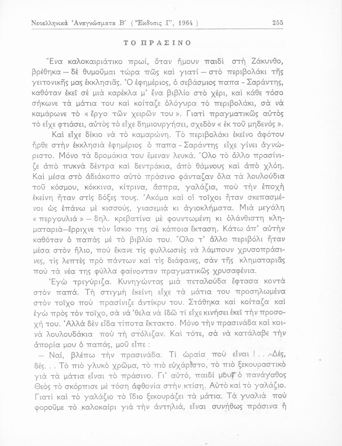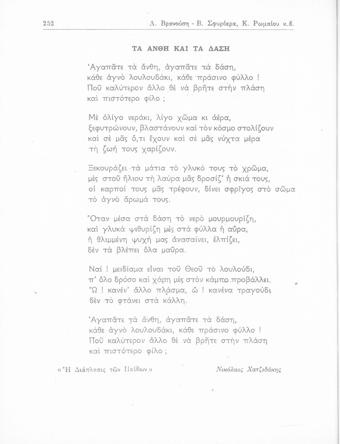 Σχολικό εγχειρίδιο Νέων Ελληνικών Β' Γυμνασίου που περιέχει ποιήματα και πεζά Ελλήνων συγγραφέων εμπνευσμένα από τη θρησκευτική, εθνική, οικογενειακή και κοινωνική ζωή και την ελληνική φύση. Περιέχει παράρτημα