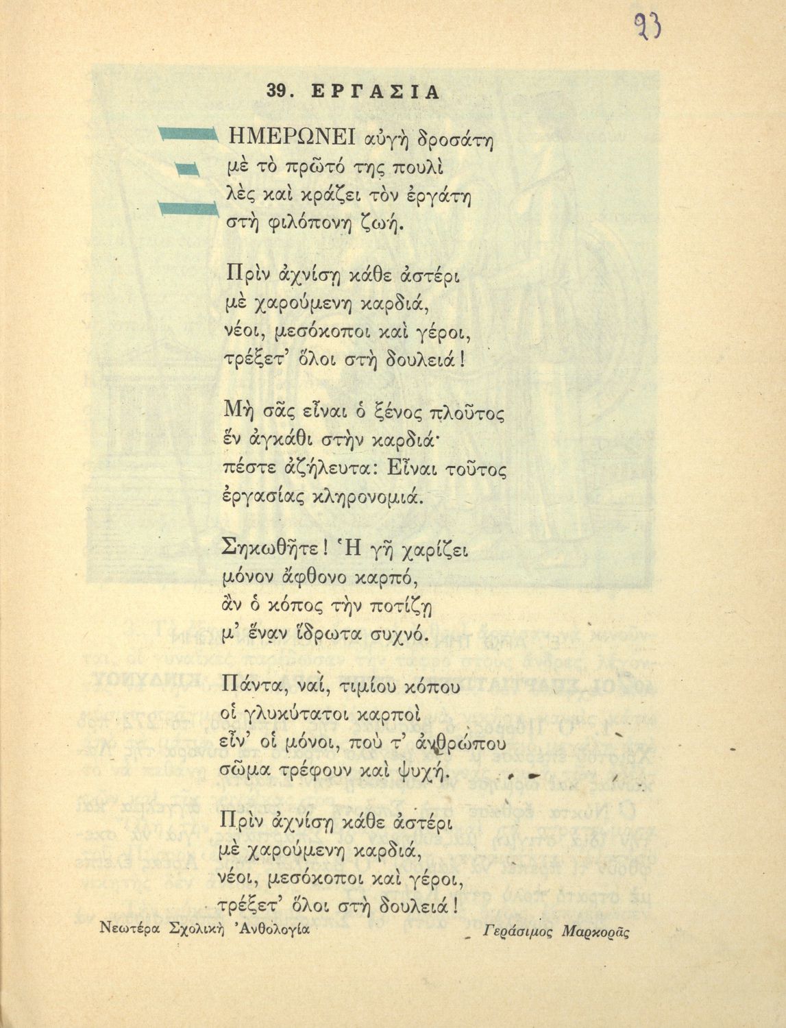 Αναγνωστικό Δ' Δημοτικού που είναι χωρισμένο σύμφωνα με τις εποχές του χρόνου και περιλαμβάνει ποιήματα και πεζά εμπνευσμένα από τη ζωή στην ύπαιθρο, την εθνική, οικογενειακή και κοινωνική ζωή, τη θρησκευτική παράδοση, τις ασχολίες των ανθρώπων, και την ελληνική φύση, ιστορία και μυθολογία.