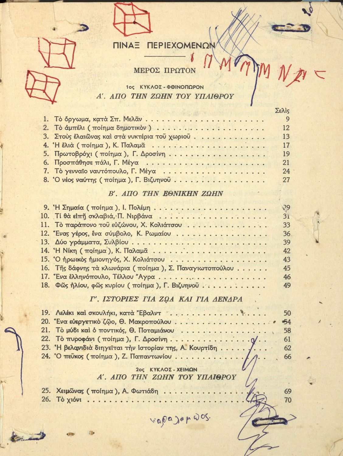 Αναγνωστικό Δ' Δημοτικού που είναι χωρισμένο σύμφωνα με τις εποχές του χρόνου και περιλαμβάνει ποιήματα και πεζά εμπνευσμένα από τη ζωή στην ύπαιθρο, την εθνική, οικογενειακή και κοινωνική ζωή, τη θρησκευτική παράδοση, τις ασχολίες των ανθρώπων, και την ελληνική φύση, ιστορία και μυθολογία.
