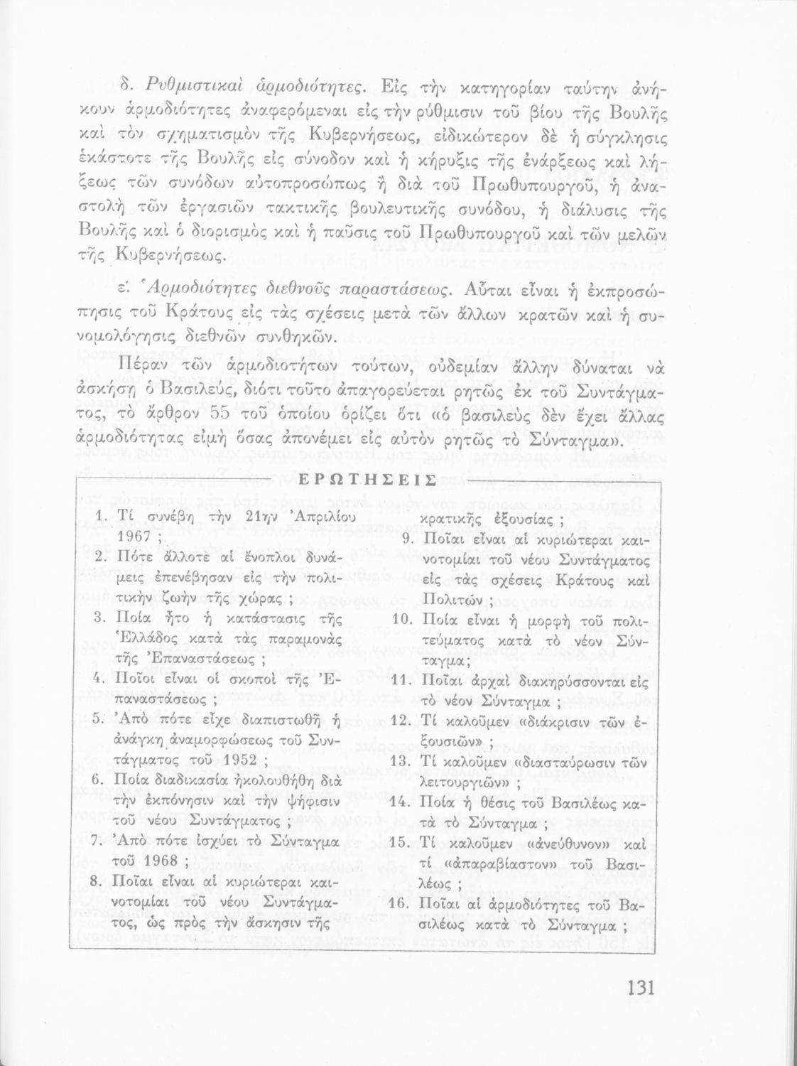 Σχολικό εγχειρίδιο της ΣΤ΄ Γυμνασίου για το μάθημα της Πολιτικής Αγωγής. Αναφέρεται στις γενικές έννοιες του δικαίου, τις μορφές των πολιτευμάτων, τους θεσμούς και το διαχωρισμό των εξουσιών. Συνεχίζει με τη διοίκηση και τις εξουσίες στο ελληνικό κράτος. Έπειτα παρουσιάζει τα οικονομικά του κράτους και τους διάφορους τομείς της κοινωνικής ζωής. Αναφέρει την απειλή του Κομμουνισμού και επισημαίνει τα εθνικά σύμβολα. Τέλος γίνεται αναφορά στους Διεθνείς Οργανισμούς. Σκοπός του μαθήματος είναι να αποκτήσουν οι μαθητές ως πολίτες ειδικές αναμορφωμένες στα κοινά γνώσεις, καθώς και την καλλιέργειά της εθνικής συνείδησής.