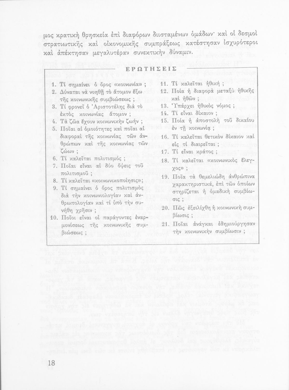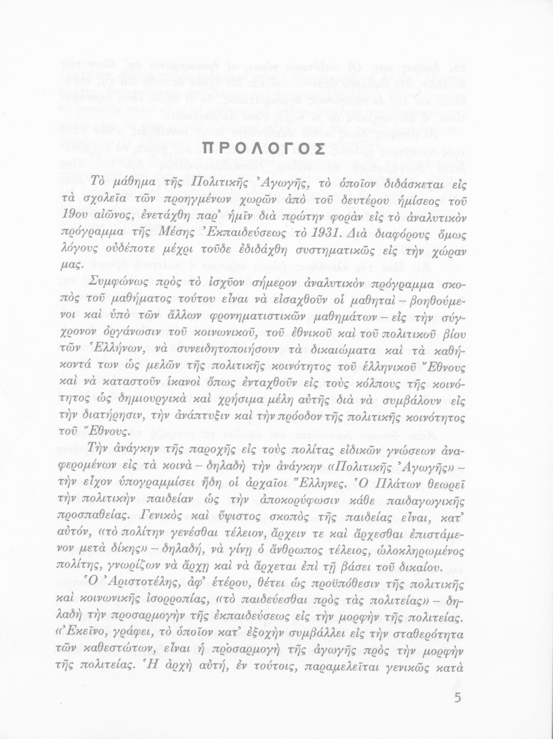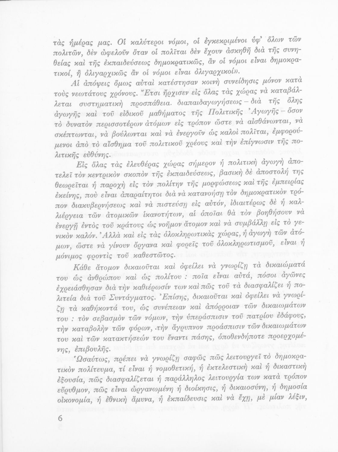 Σχολικό εγχειρίδιο της ΣΤ΄ Γυμνασίου για το μάθημα της Πολιτικής Αγωγής. Αναφέρεται στις γενικές έννοιες του δικαίου, τις μορφές των πολιτευμάτων, τους θεσμούς και το διαχωρισμό των εξουσιών. Συνεχίζει με τη διοίκηση και τις εξουσίες στο ελληνικό κράτος. Έπειτα παρουσιάζει τα οικονομικά του κράτους και τους διάφορους τομείς της κοινωνικής ζωής. Αναφέρει την απειλή του Κομμουνισμού και επισημαίνει τα εθνικά σύμβολα. Τέλος γίνεται αναφορά στους Διεθνείς Οργανισμούς. Σκοπός του μαθήματος είναι να αποκτήσουν οι μαθητές ως πολίτες ειδικές αναμορφωμένες στα κοινά γνώσεις, καθώς και την καλλιέργειά της εθνικής συνείδησής.