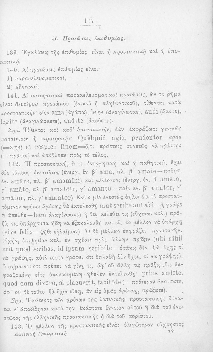 Σχολικό εγχειρίδιο Λατινικών Α΄, Β΄, Γ' Γυμνασίου που περιλαμβάνει γραμματική και συντακτικό και είναι χωρισμένο σε φθογγολογικό, τυπολογικό και ετυμολογικό μέρος.