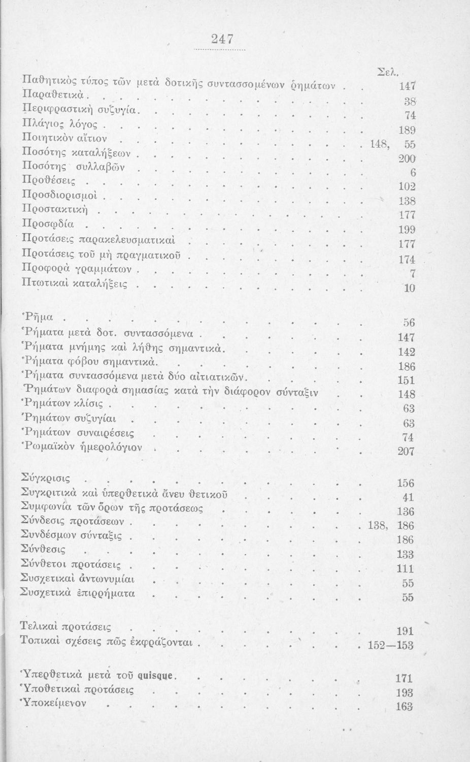 Γραμματικής της λατινικής γλώσσας για τα Ελληνικά Σχολεία και Γυμνάσια που περιέχει δύο τμήματα: το τεχνολογικό που εστιάζει στα μέρη του λόγου και το συντακτικό που ασχολείται με τις πτώσεις, τις εγκλίσεις, ...