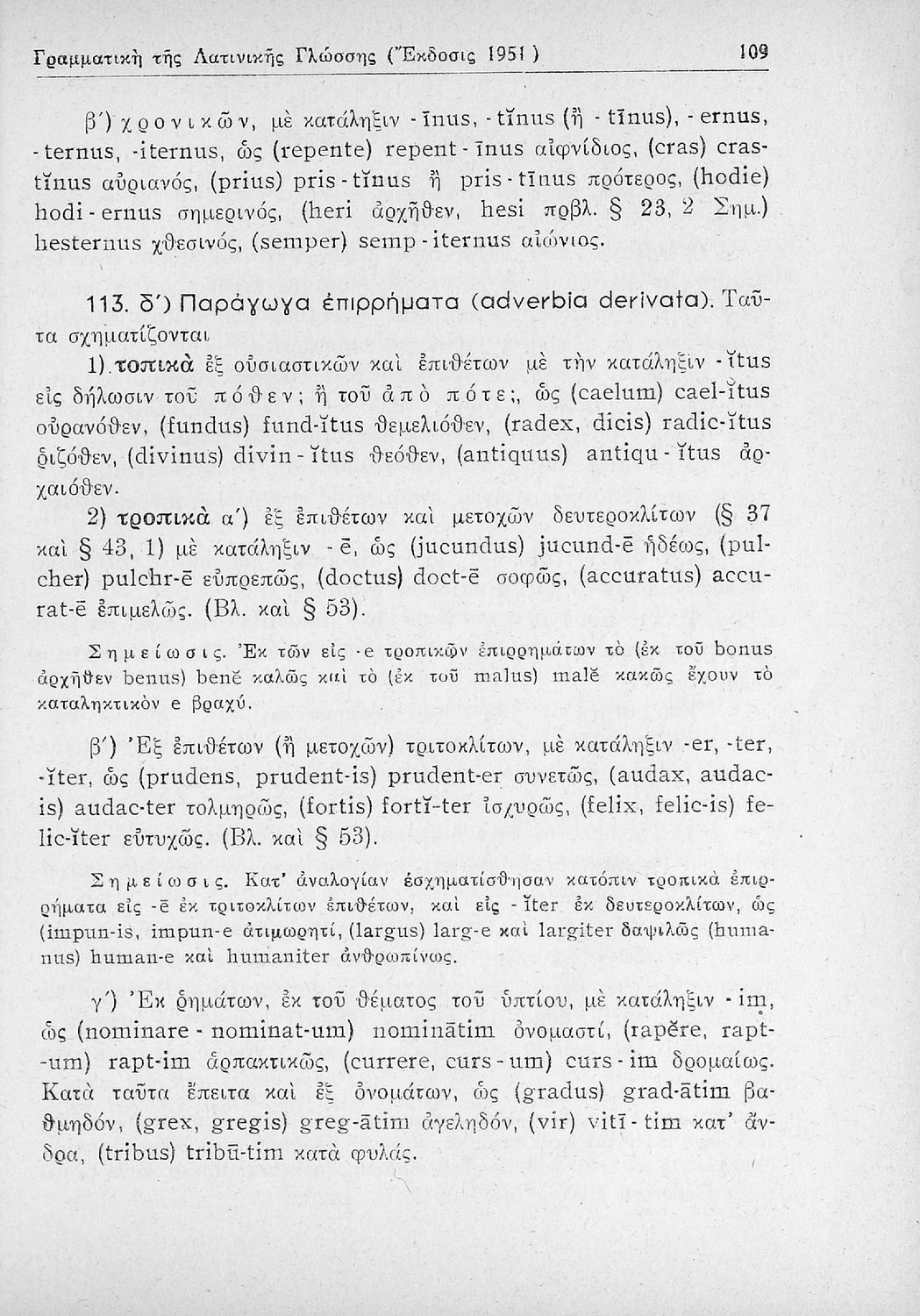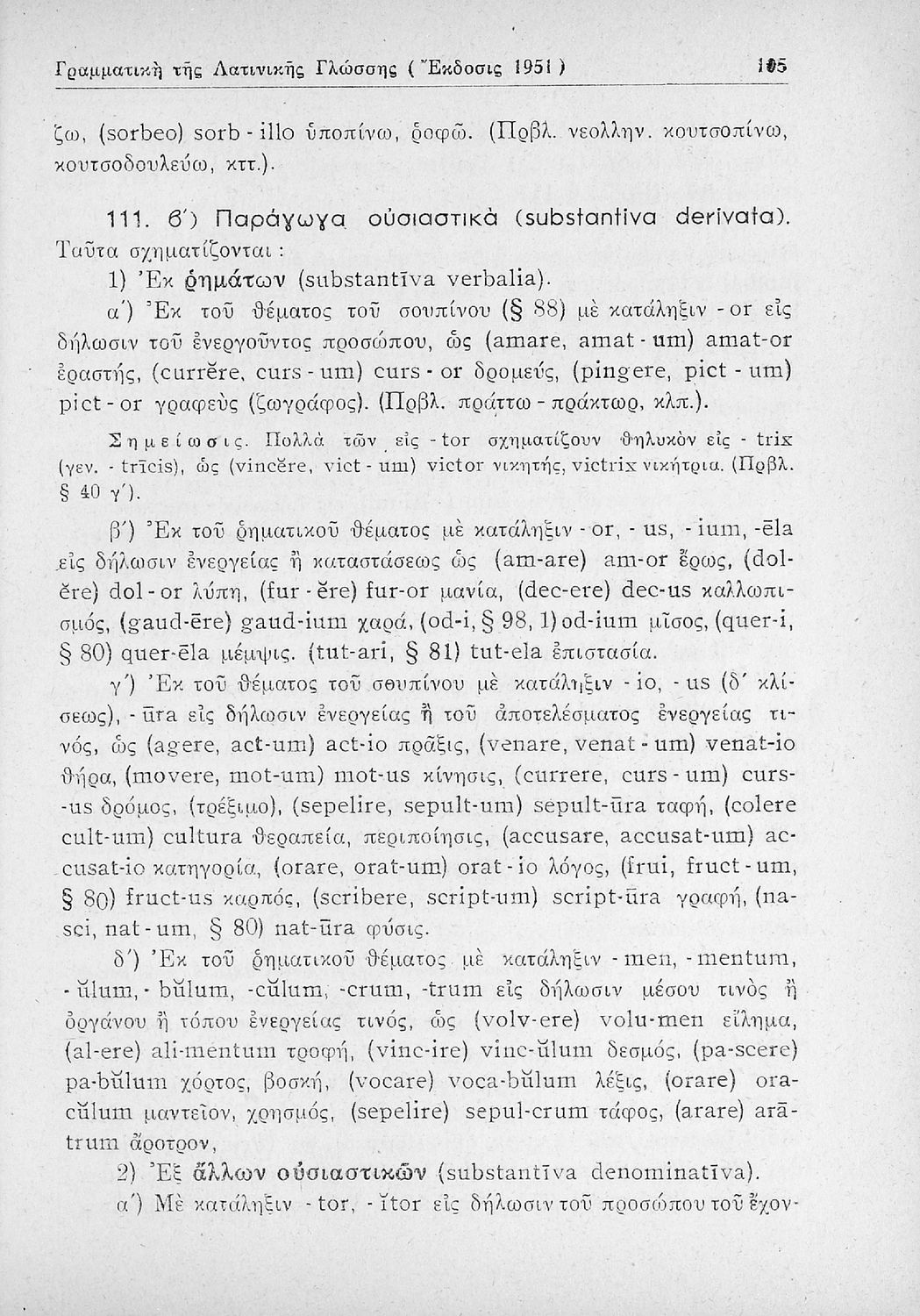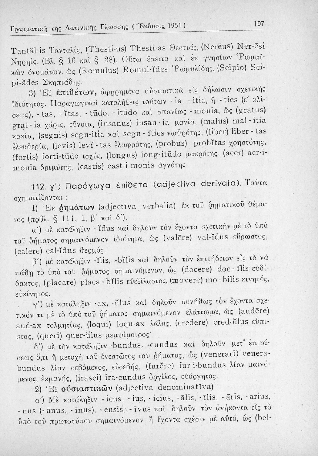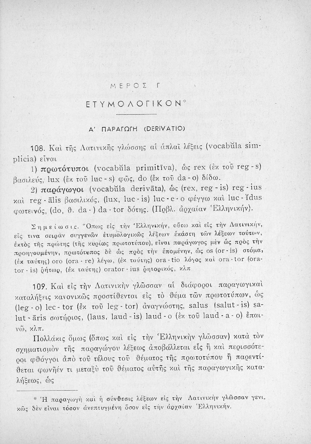 Σχολικό εγχειρίδιο Λατινικών Γυμνασίου που περιλαμβάνει γραμματική και συντακτικό και είναι χωρισμένο σε φθογγολογικό, τυπολογικό και ετυμολογικό μέρος.
