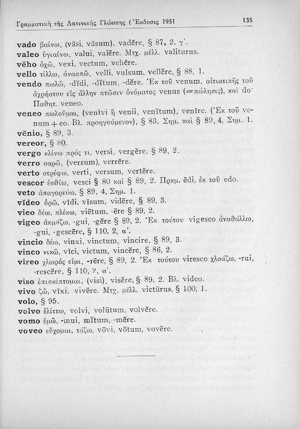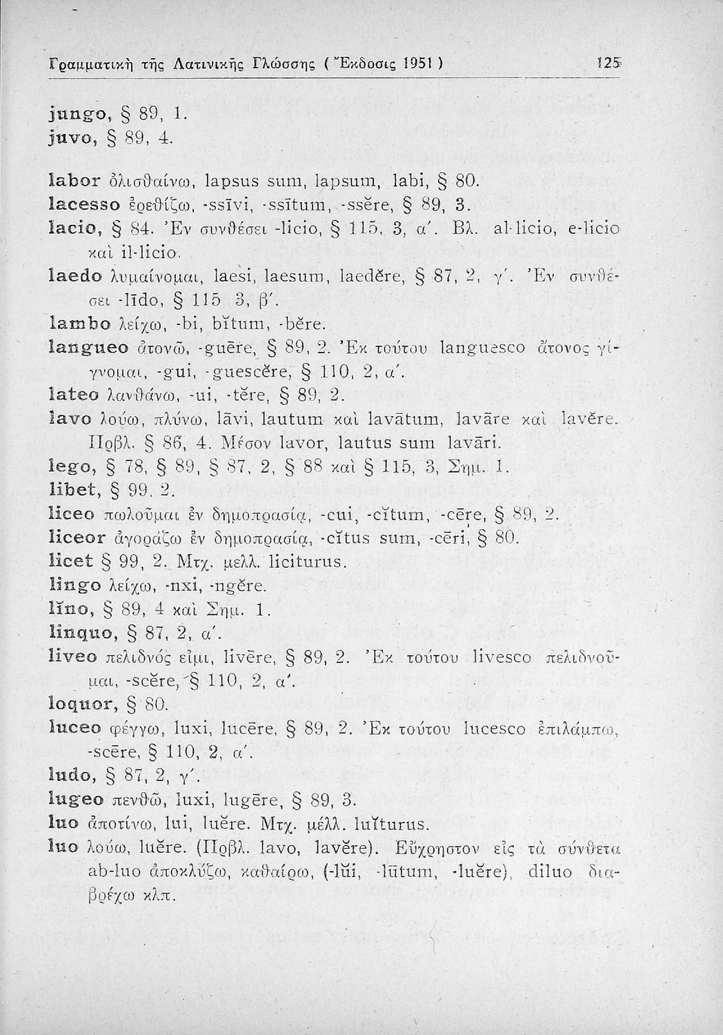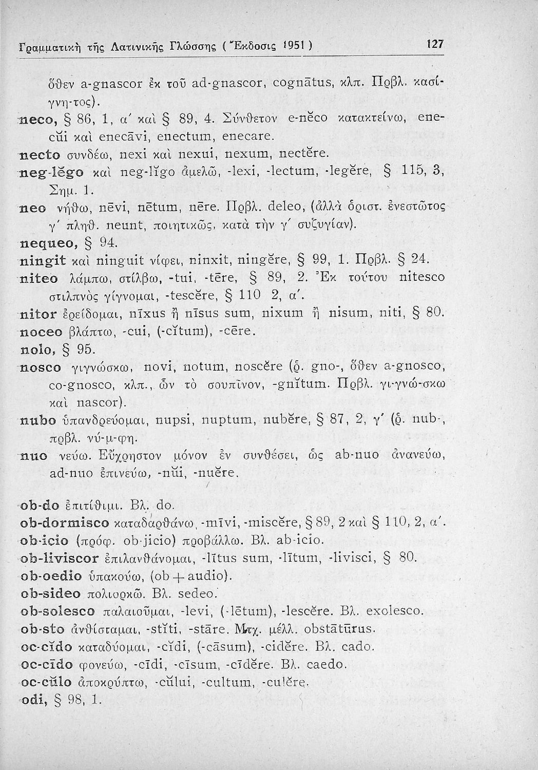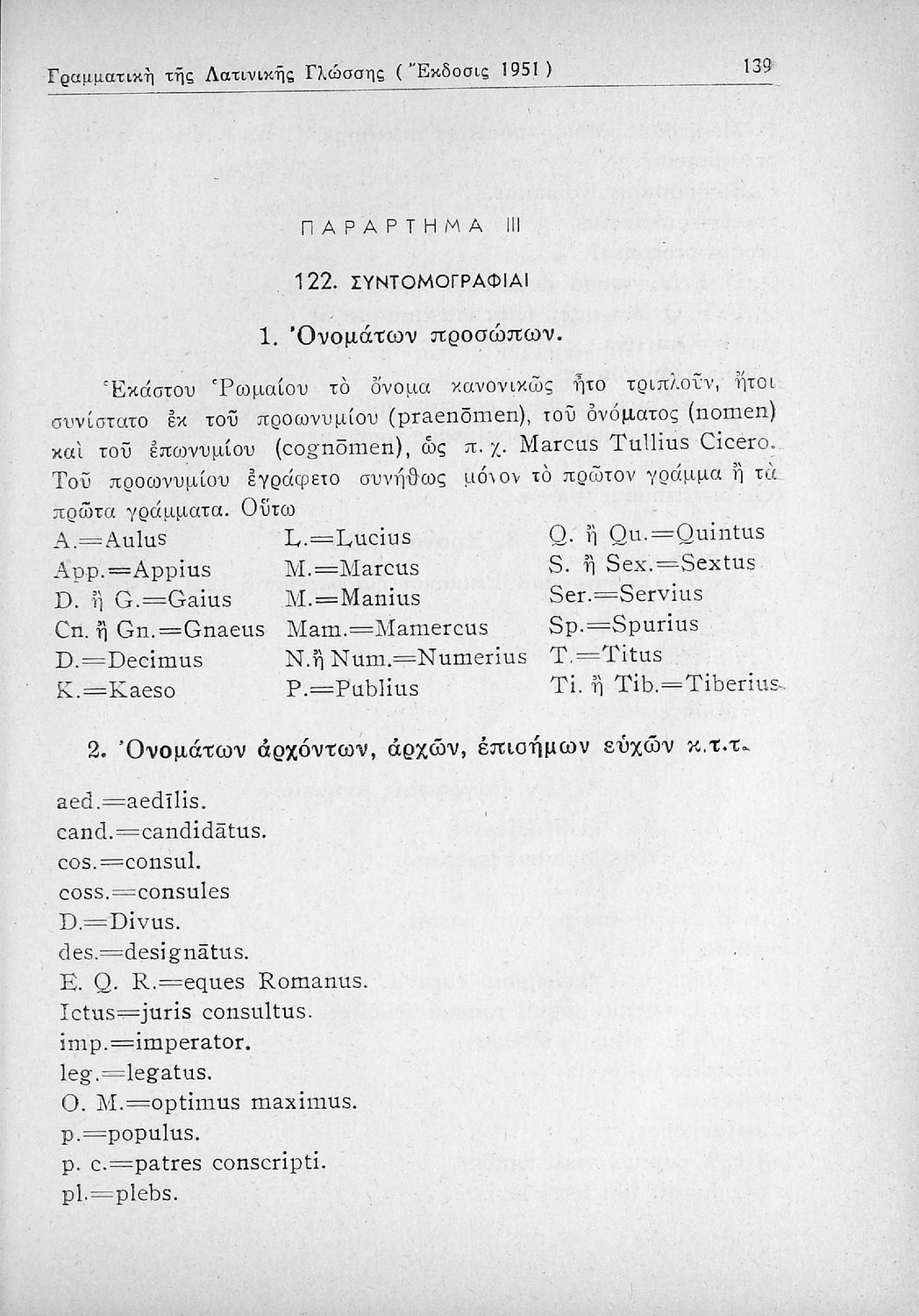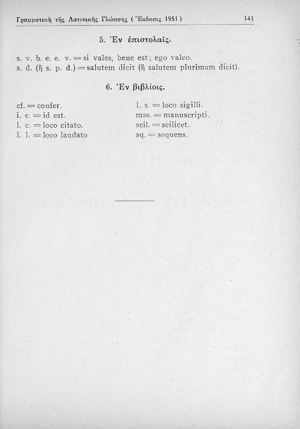 Σχολικό εγχειρίδιο Λατινικών Γυμνασίου που περιλαμβάνει γραμματική και συντακτικό και είναι χωρισμένο σε φθογγολογικό, τυπολογικό και ετυμολογικό μέρος.