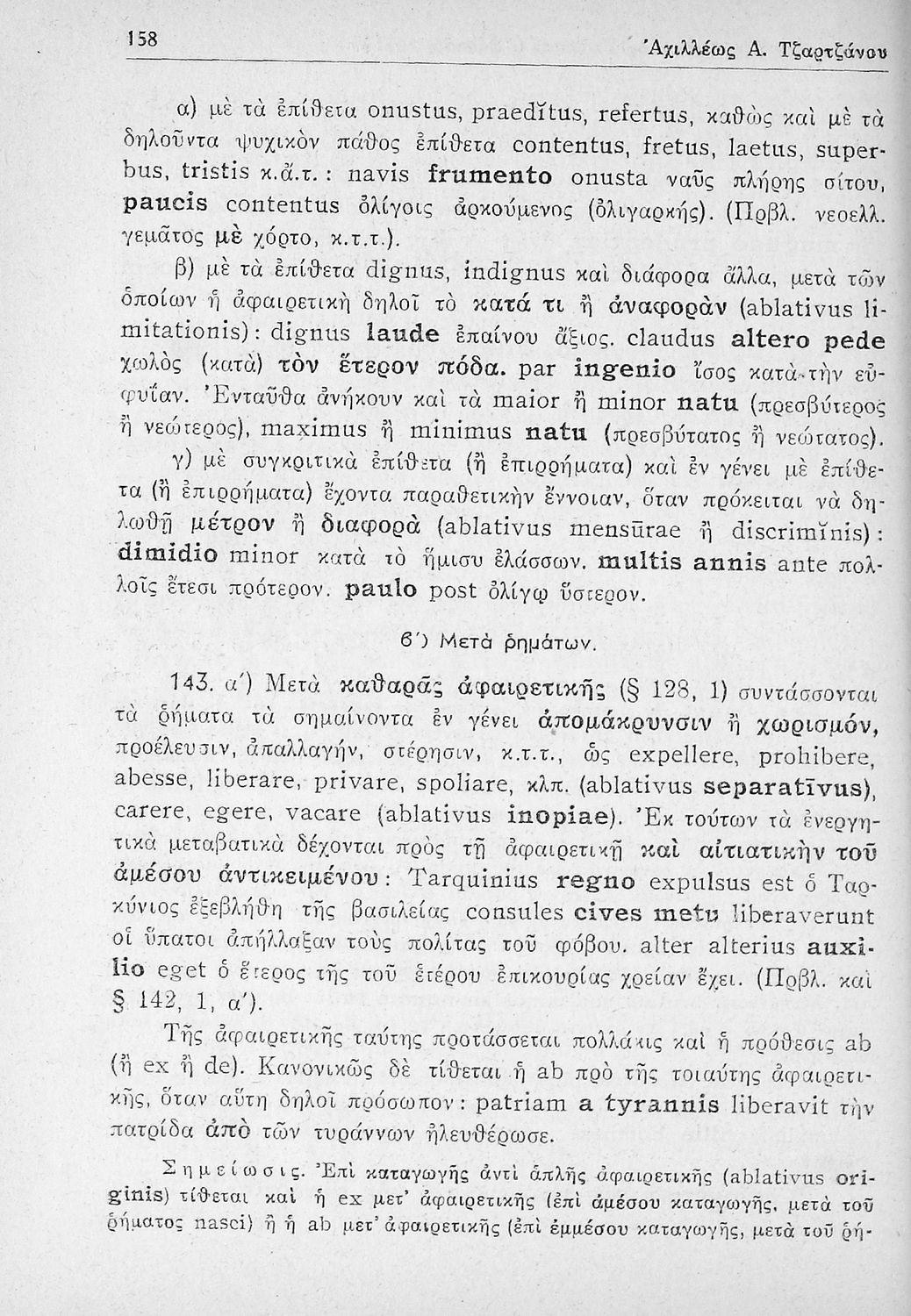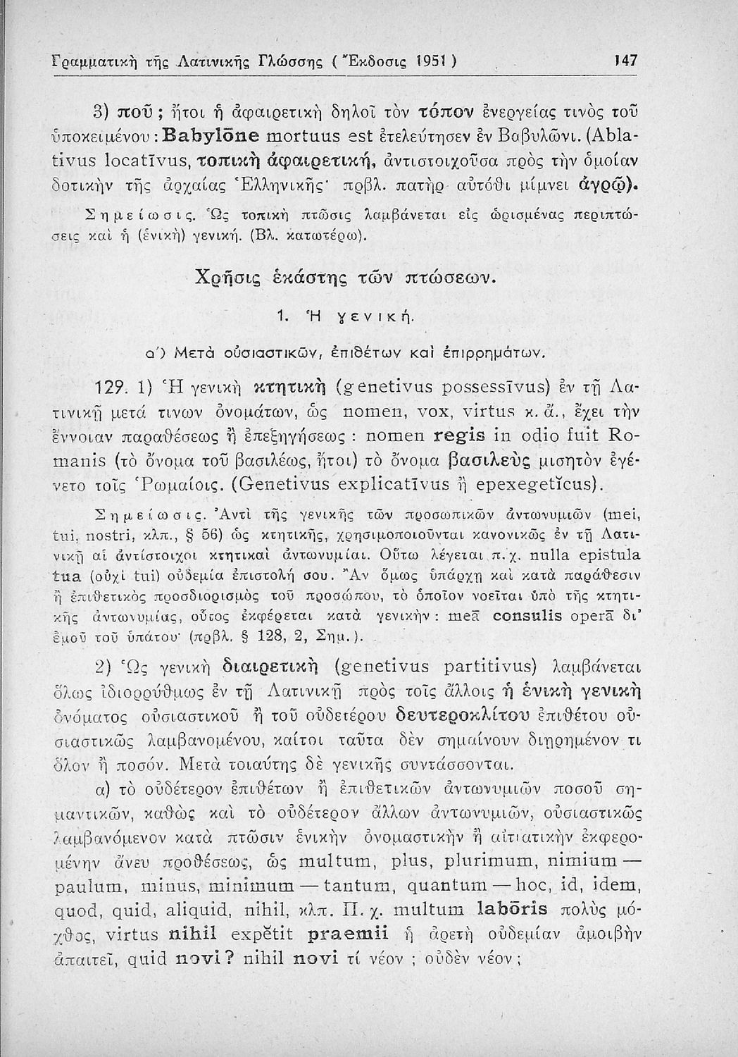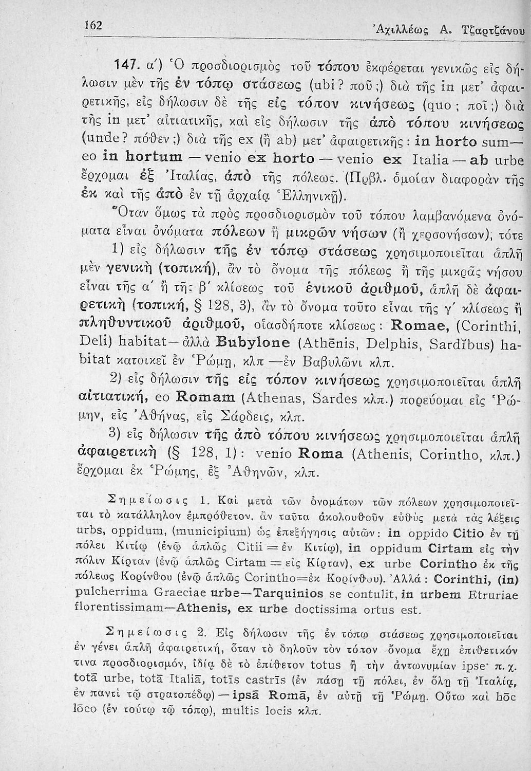 Σχολικό εγχειρίδιο Λατινικών Γυμνασίου που περιλαμβάνει γραμματική και συντακτικό και είναι χωρισμένο σε φθογγολογικό, τυπολογικό και ετυμολογικό μέρος.