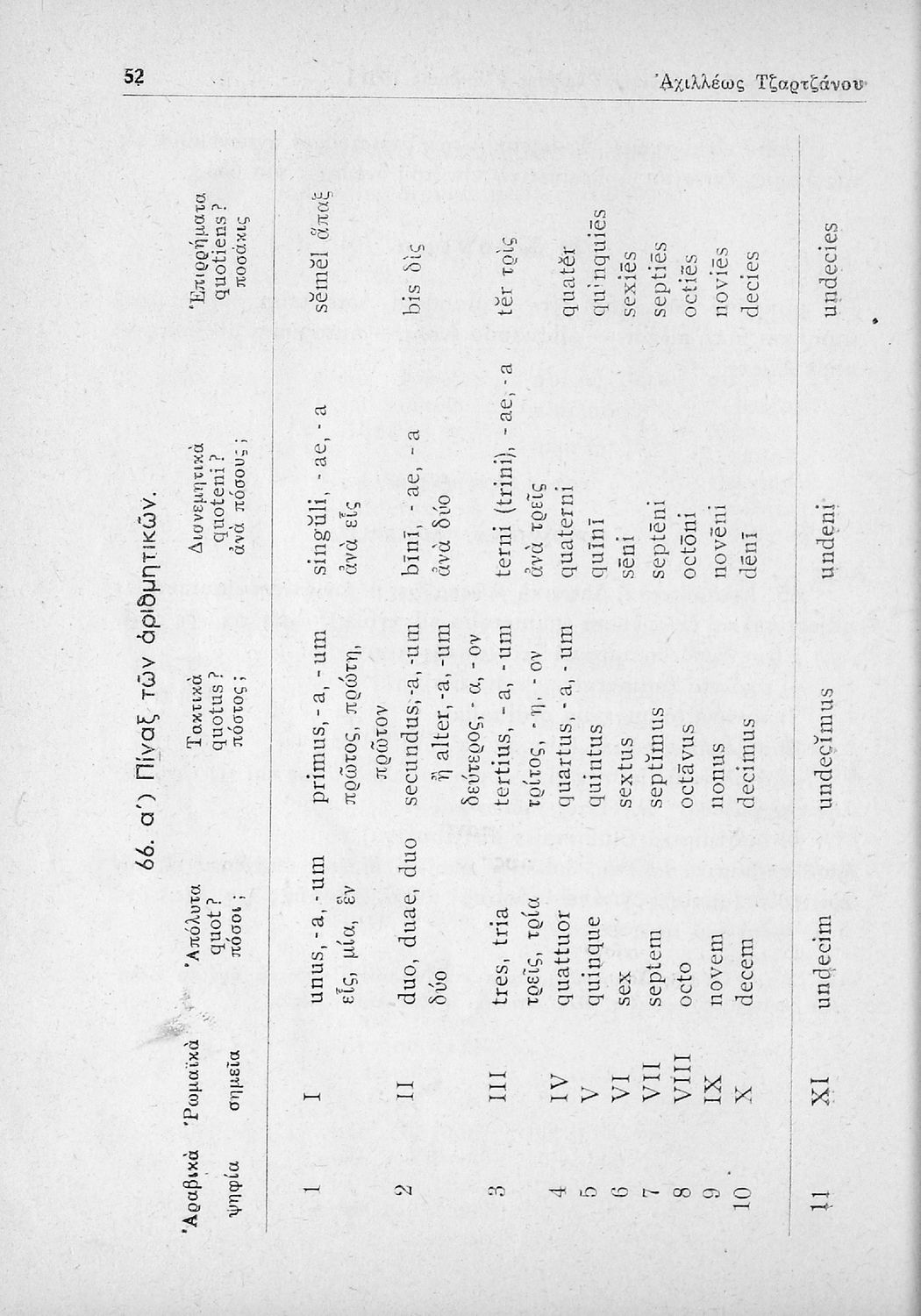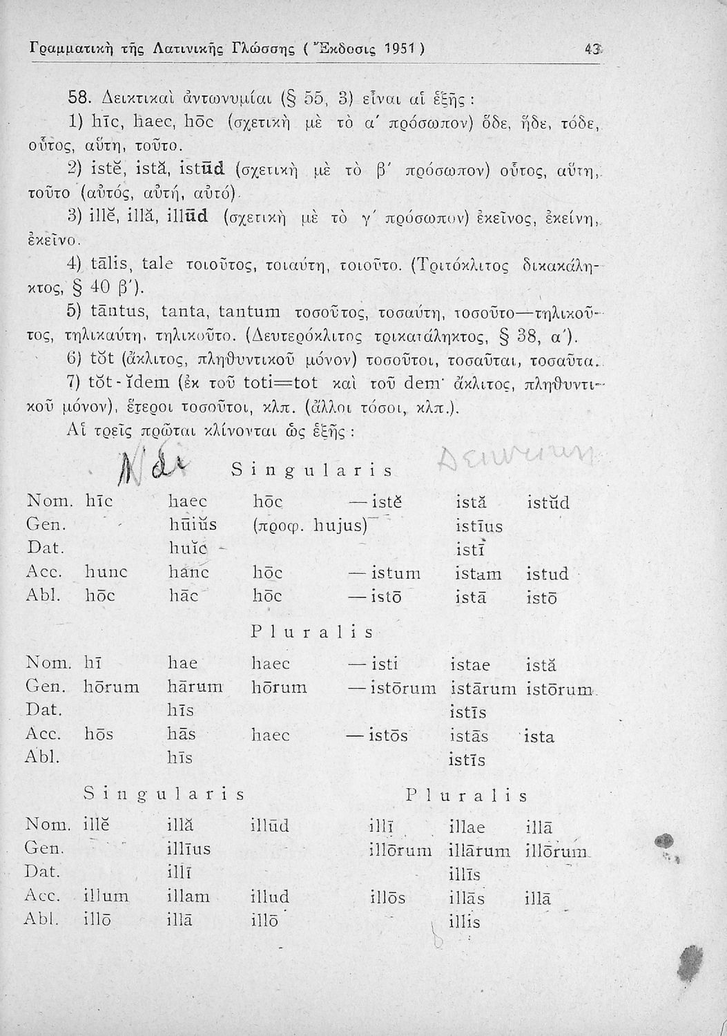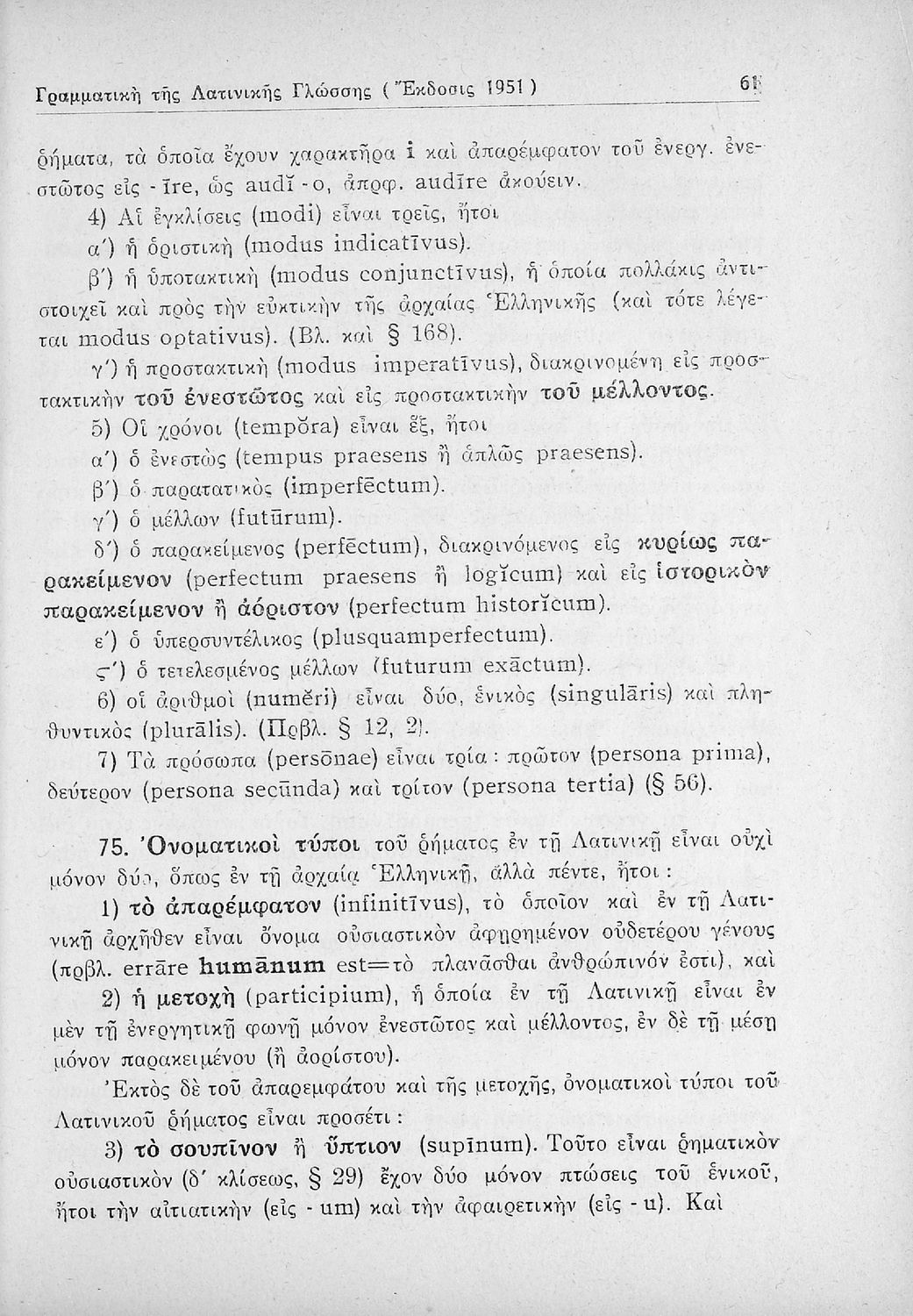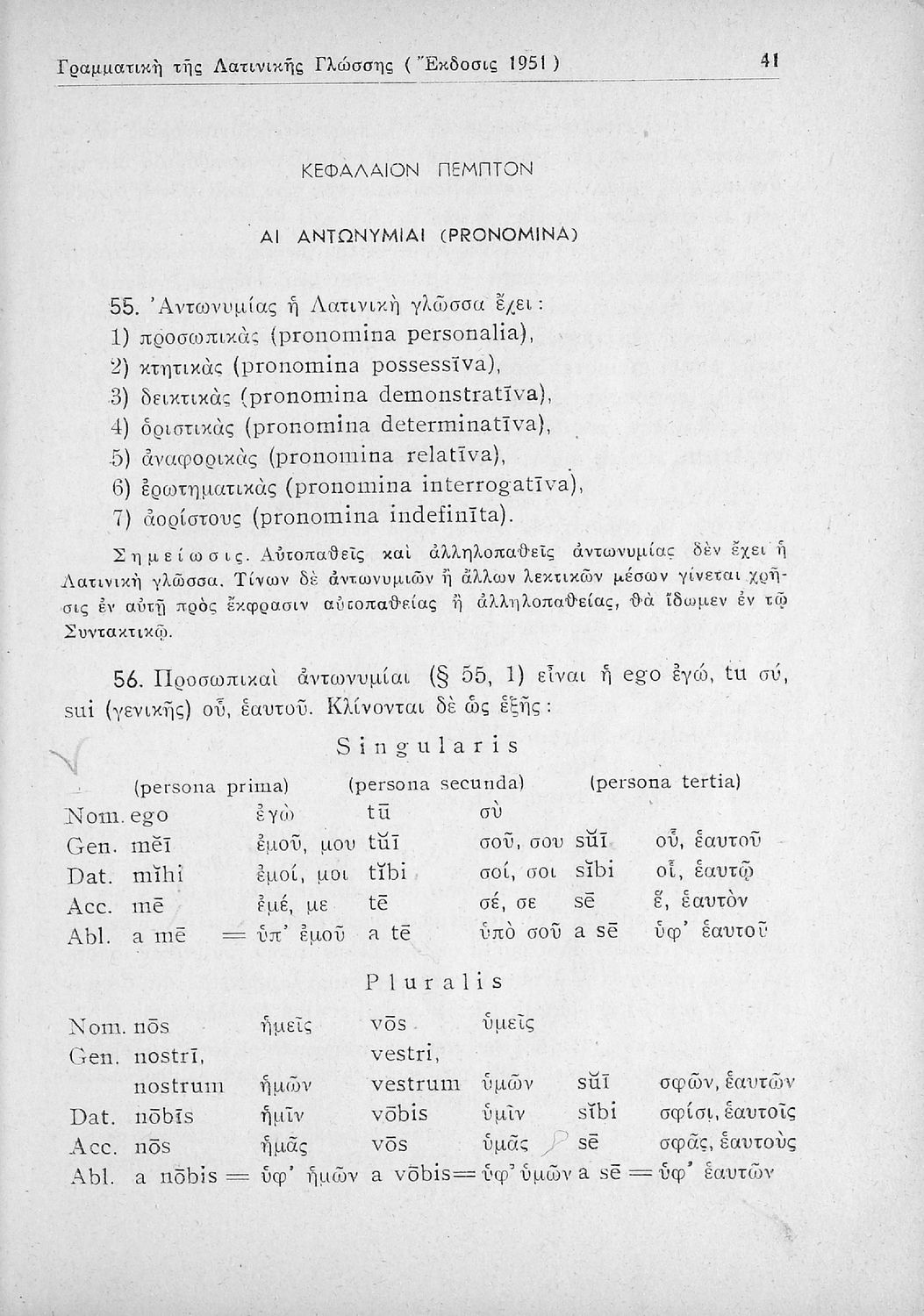 Σχολικό εγχειρίδιο Λατινικών Γυμνασίου που περιλαμβάνει γραμματική και συντακτικό και είναι χωρισμένο σε φθογγολογικό, τυπολογικό και ετυμολογικό μέρος.