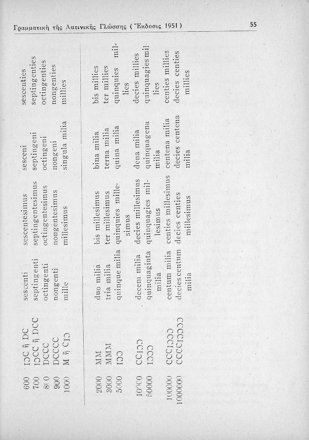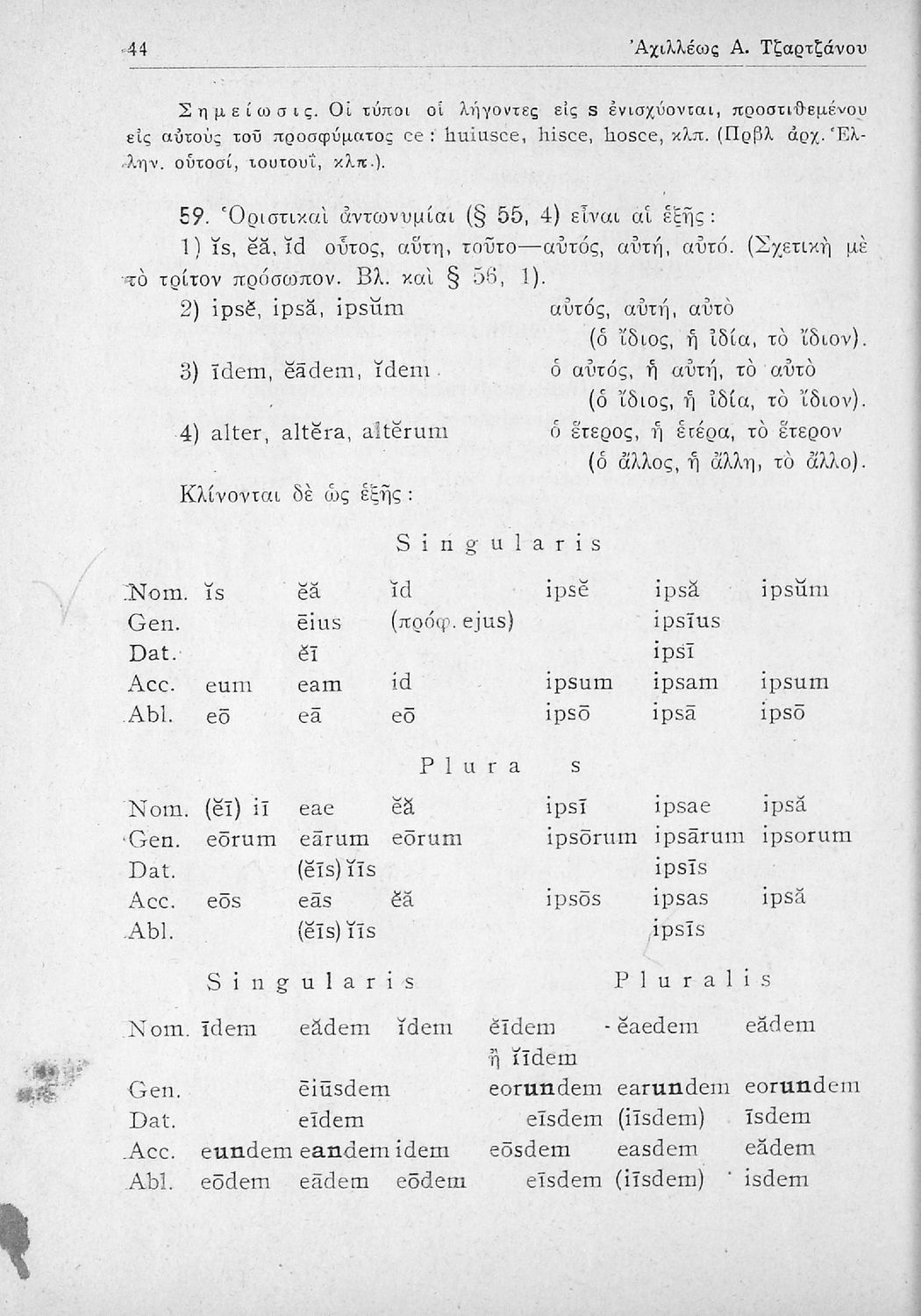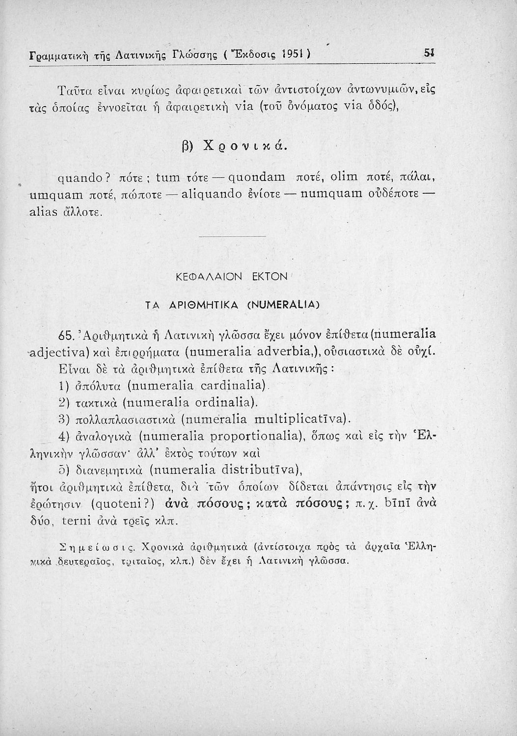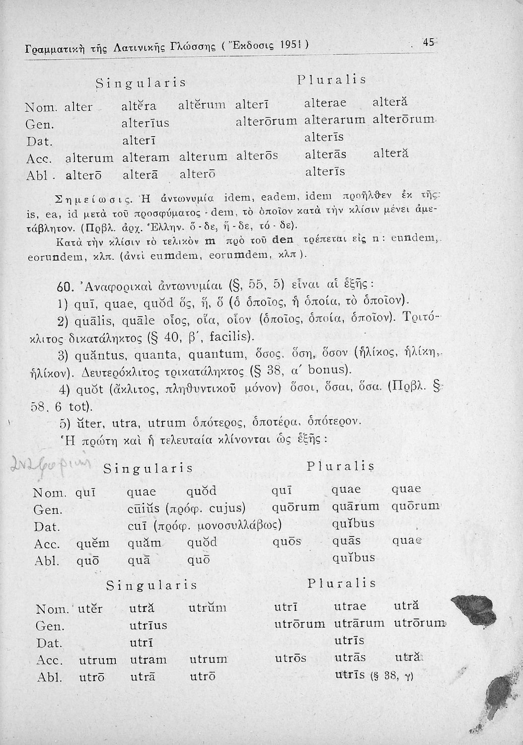 Σχολικό εγχειρίδιο Λατινικών Γυμνασίου που περιλαμβάνει γραμματική και συντακτικό και είναι χωρισμένο σε φθογγολογικό, τυπολογικό και ετυμολογικό μέρος.