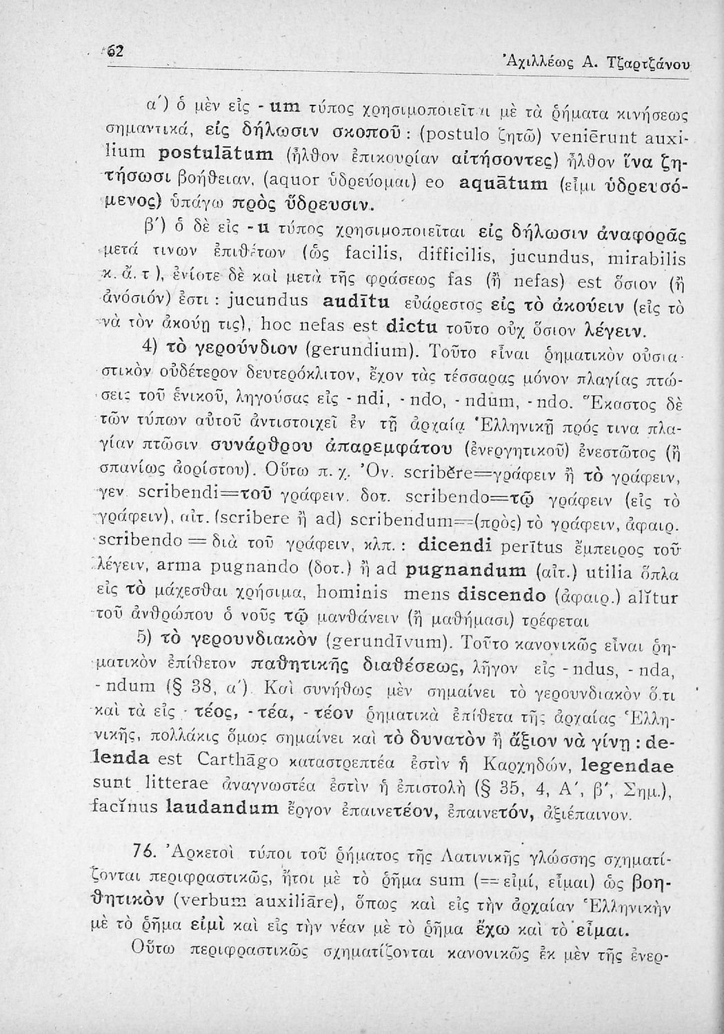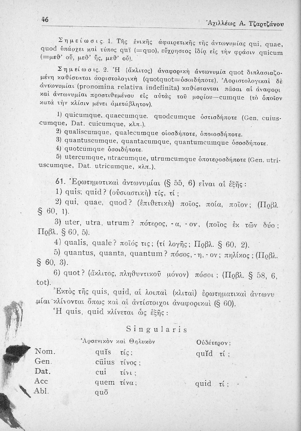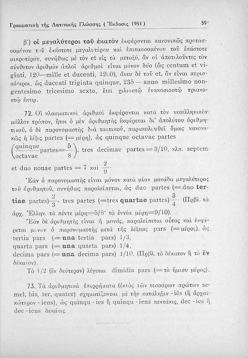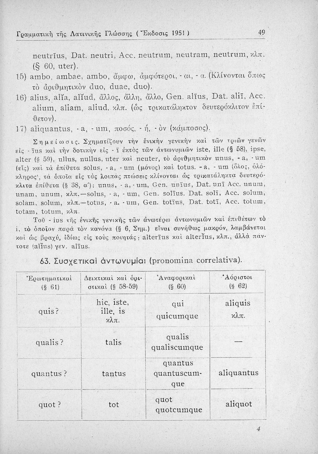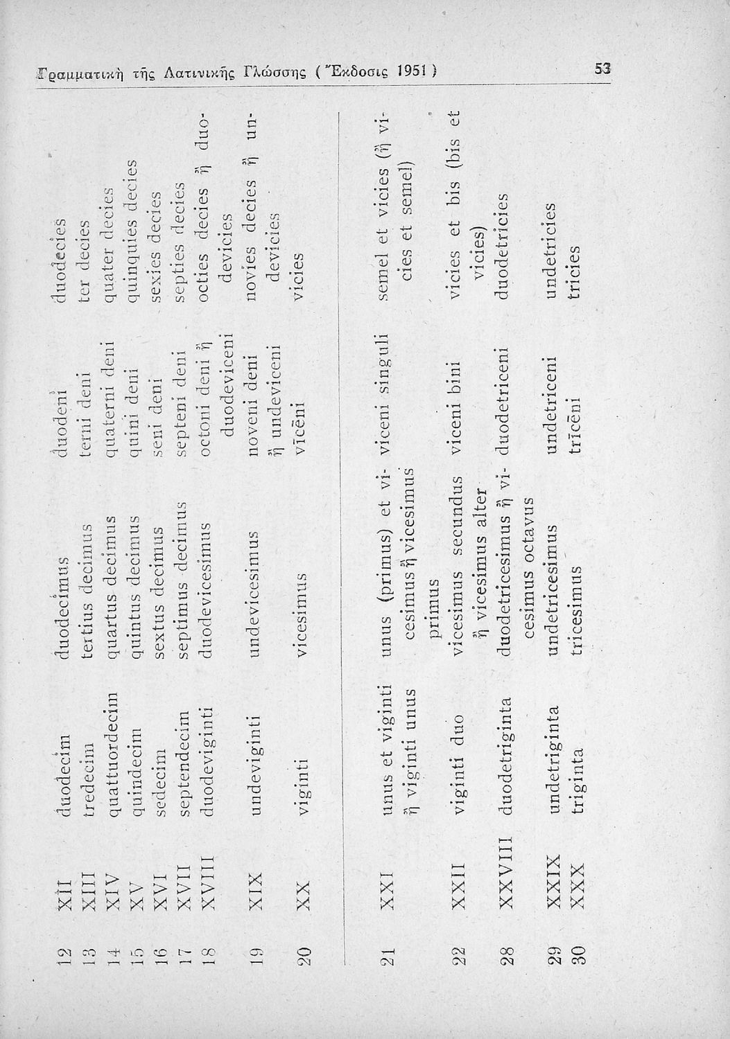 Σχολικό εγχειρίδιο Λατινικών Γυμνασίου που περιλαμβάνει γραμματική και συντακτικό και είναι χωρισμένο σε φθογγολογικό, τυπολογικό και ετυμολογικό μέρος.