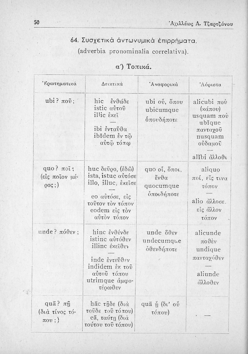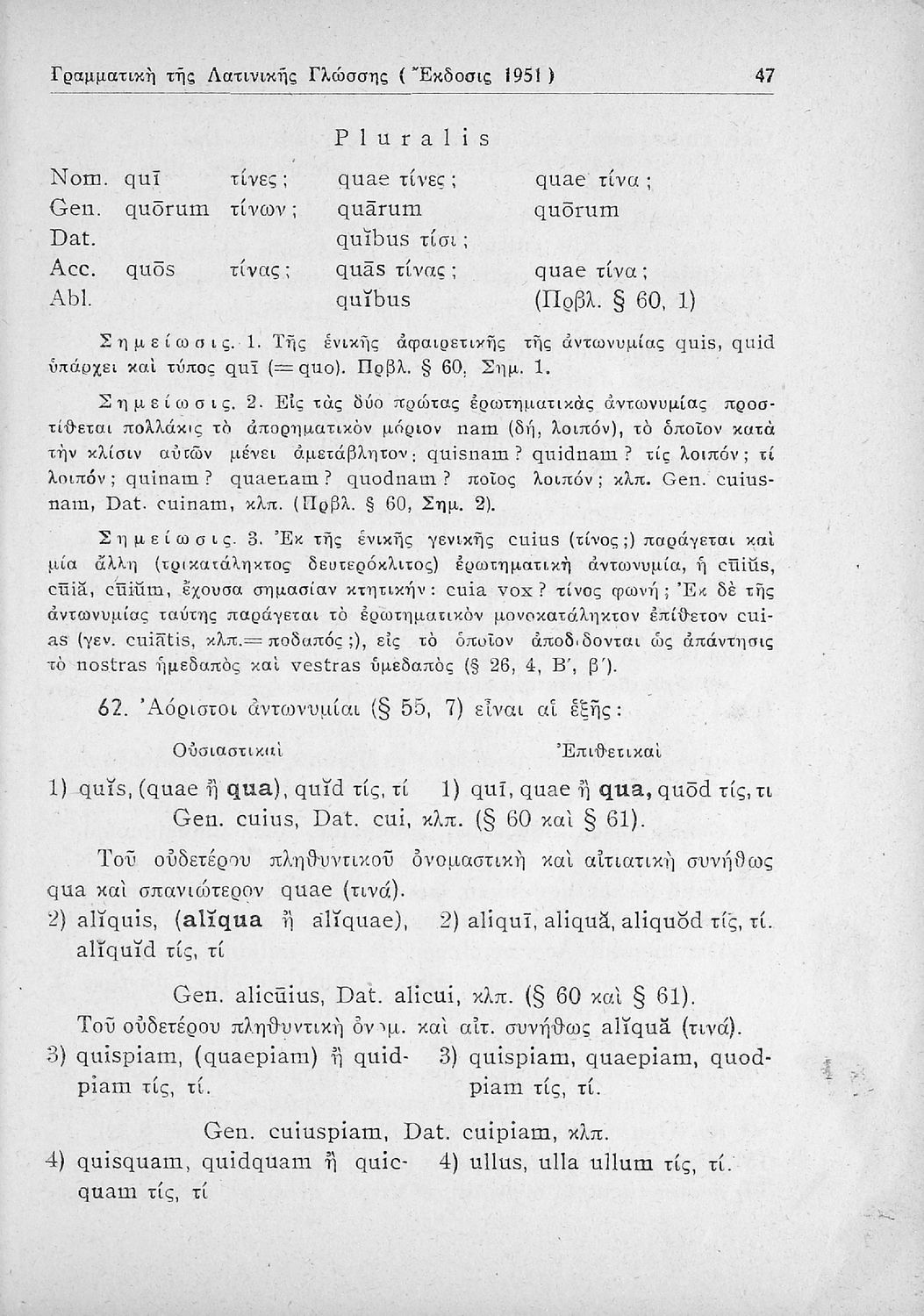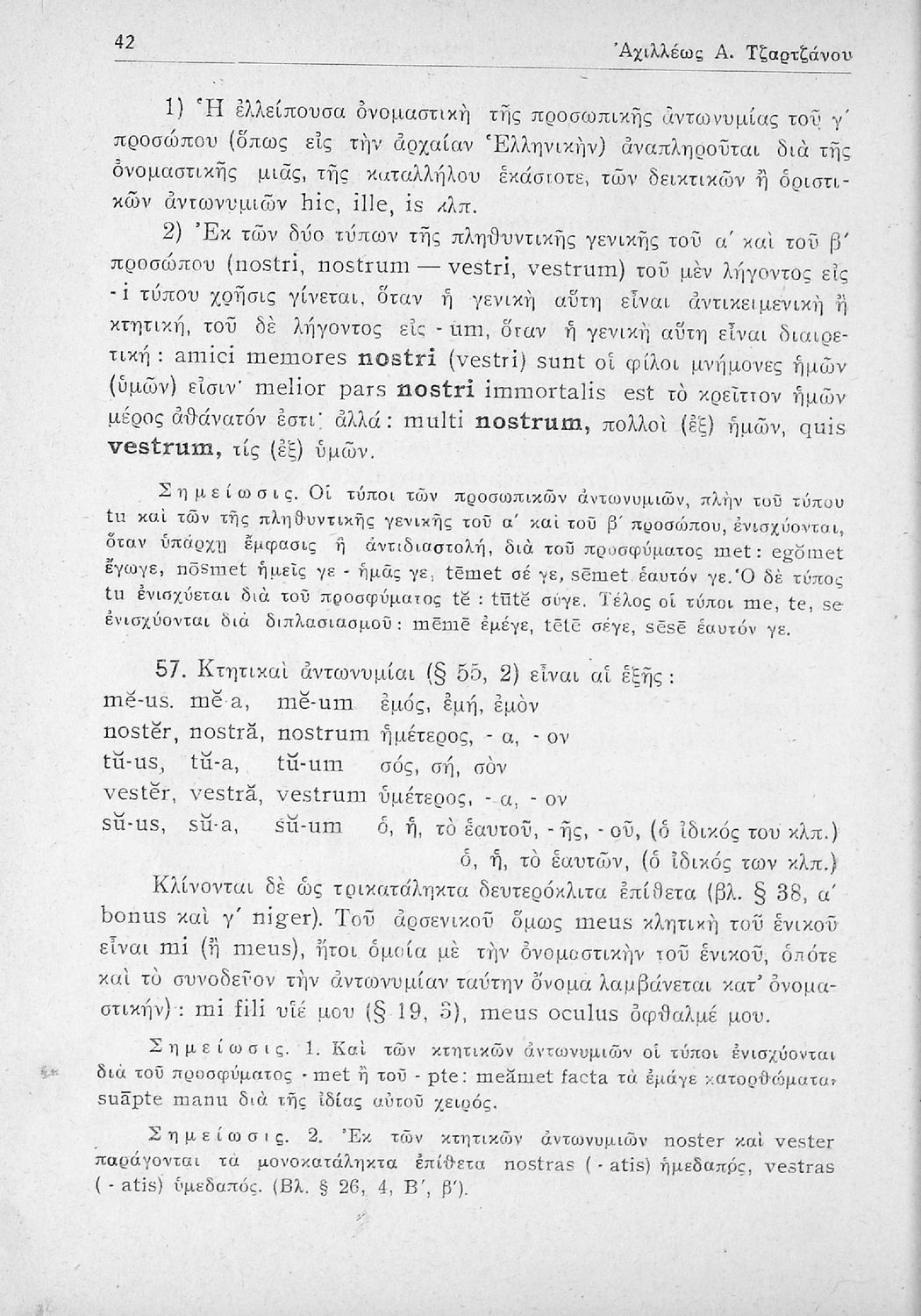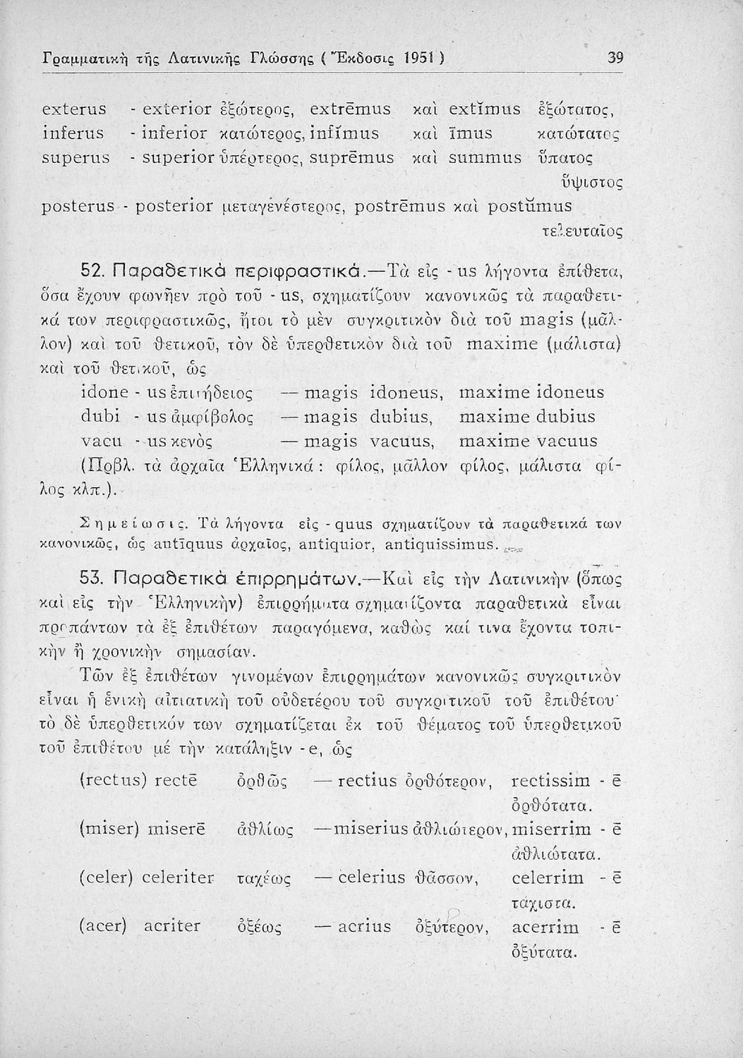 Σχολικό εγχειρίδιο Λατινικών Γυμνασίου που περιλαμβάνει γραμματική και συντακτικό και είναι χωρισμένο σε φθογγολογικό, τυπολογικό και ετυμολογικό μέρος.