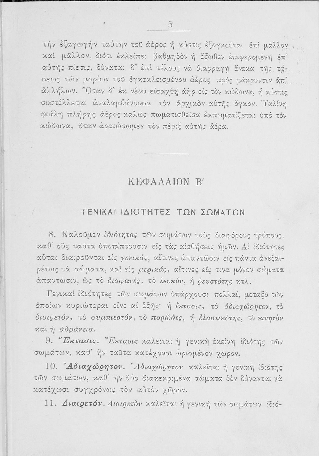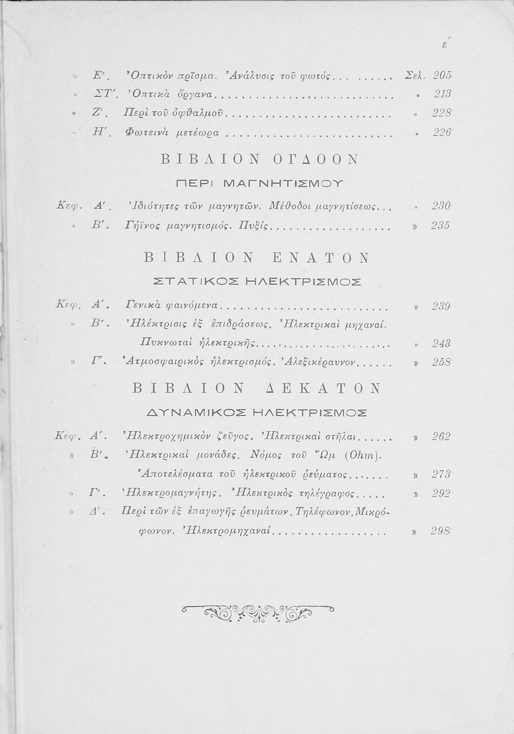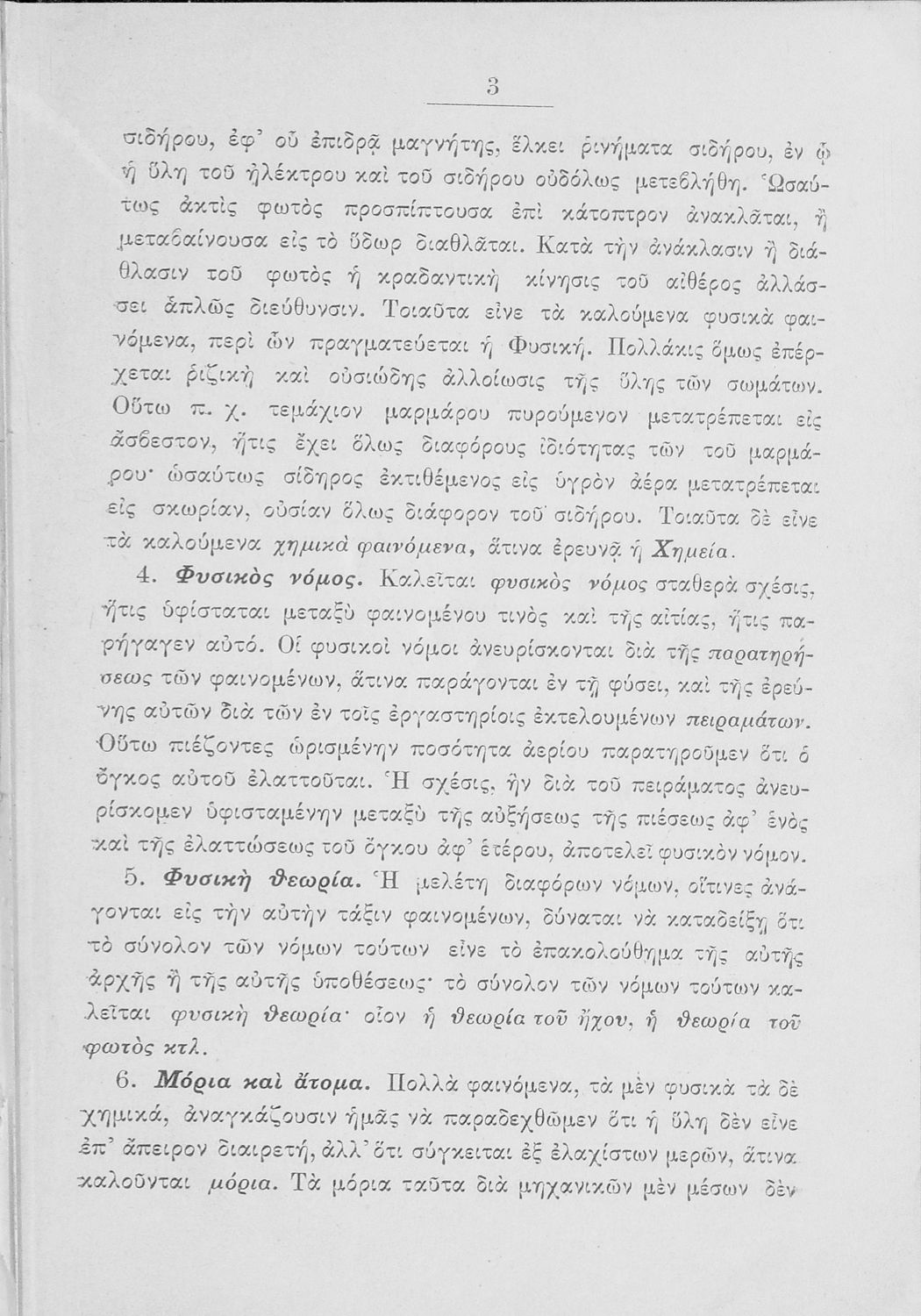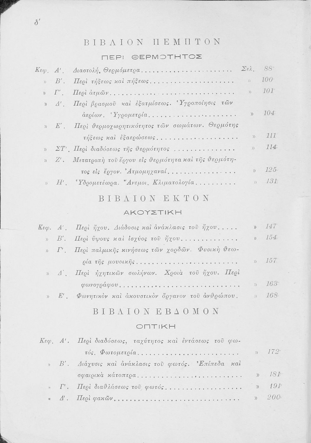 Σχολικό εγχειρίδιο για το μάθημα της Φυσικής. Παρέχει βασικές γνώσεις της φυσικής επιστήμης. Αναλύει τις ιδιότητες των σωμάτων, καθώς και της θερμότητας, του ηλεκτρισμού και του μαγνητισμού, την υδροστατική, την βαρύτητα και την αεροστατική. Περιέχει εικόνες και σχεδιαγράμματα τα οποία βοηθούν τη διδασκαλία.
