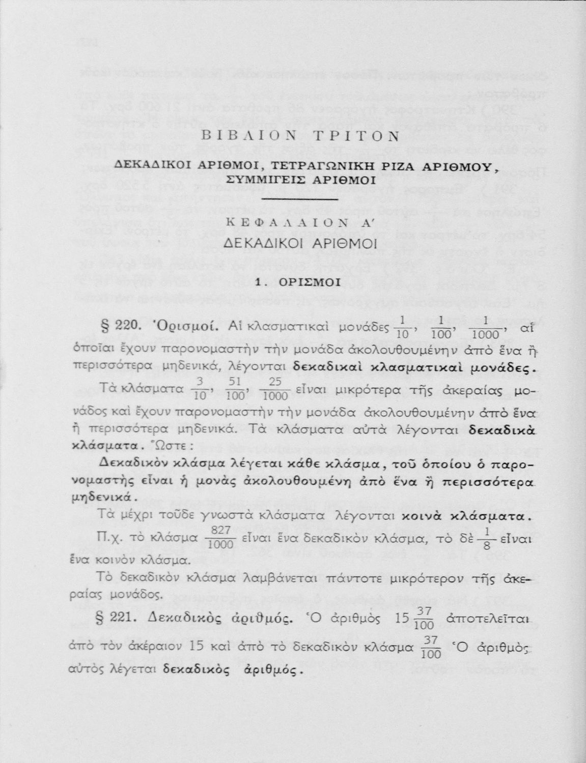 Βαθμίδα εκπαίδευσης: Δευτεροβάθμια Τάξη: Γυμνάσιο Μάθημα: Μαθηματικά Γλώσσα: Απλή καθαρεύουσα Παρουσίαση περιεχομένου: Σχολικό εγχειρίδιο Αριθμητικής Γυμνασίου που εστιάζει στις αριθμητικές πράξεις, τα κλάσματα και τις μεθόδους και είναι χωρισμένο σε θεωρία και ασκήσεις με έντονο επιχειρηματικό προσανατολισμό. Περιλαμβάνει στοιχεία Θεωρητικής Αριθμητικής. |