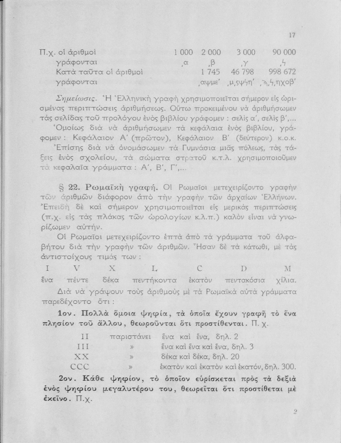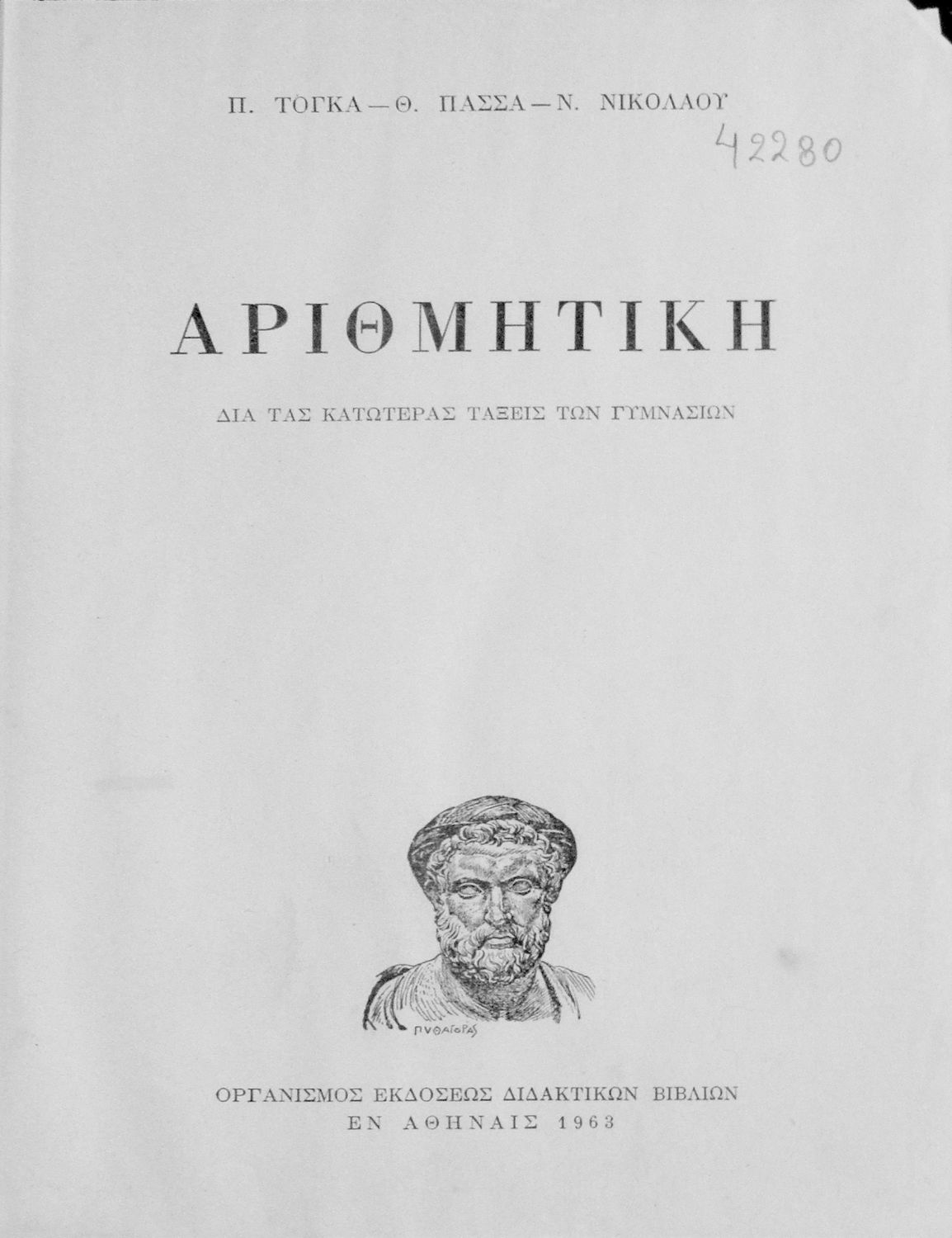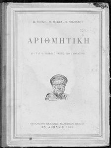 Κωδικός αναγνώρισης: 01-42280 Τίτλος: Αριθμητική δια τας κατωτέρας τάξεις των Γυμνασίων Συγγραφέας: Π. Τόγκας, Θ. Πασσάς, Ν. Νικολάου, Θ. Παντέλιος (επιμέλεια) Μέγεθος και υπόστρωμα: Σχολικό εγχειρίδιο, 20εκ., σκληρό εξώφυλλο, 275 σελίδες. |