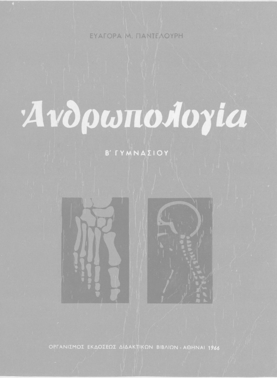 Κωδικός αναγνώρισης: 01-42284 Τίτλος: Ανθρωπολογία δια την Β΄ Τάξιν των Γυμνασίων Συγγραφέας: Ευαγόρας Μ. Παντελούρης Εικονογράφος: Ιωάννης Μηλιώνης Μέγεθος και υπόστρωμα: Σχολικό εγχειρίδιο, σκληρό εξώφυλλο, 107 σελίδες. Σκίτσα (ασπρόμαυρα). |