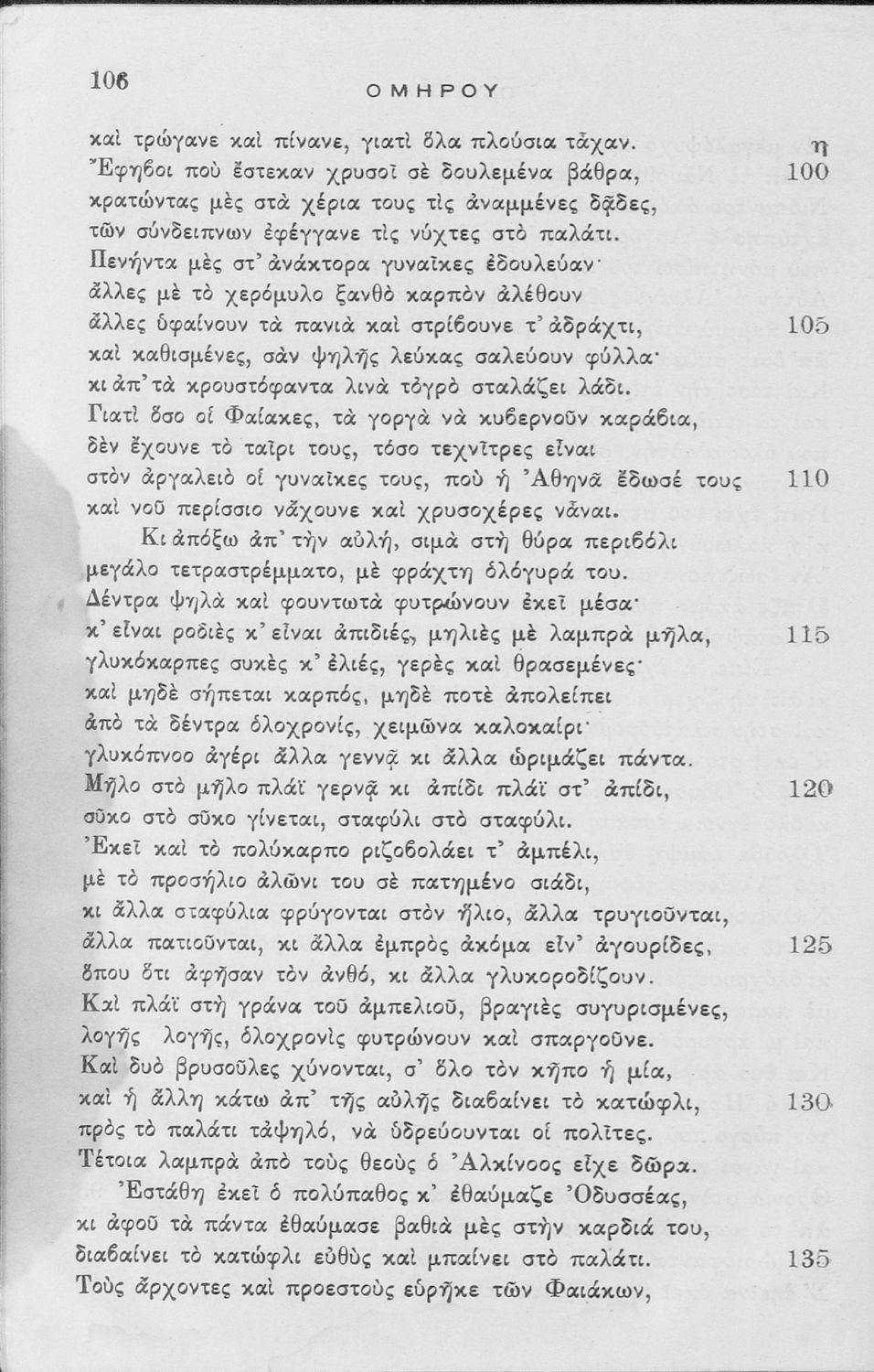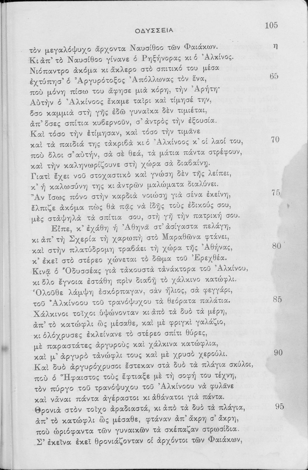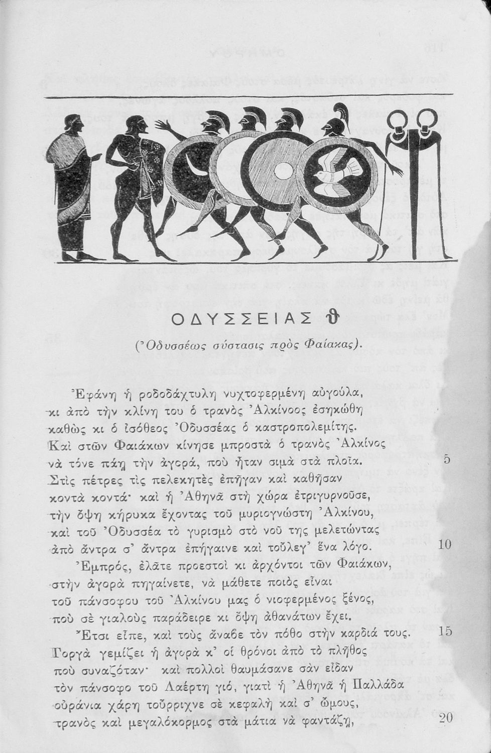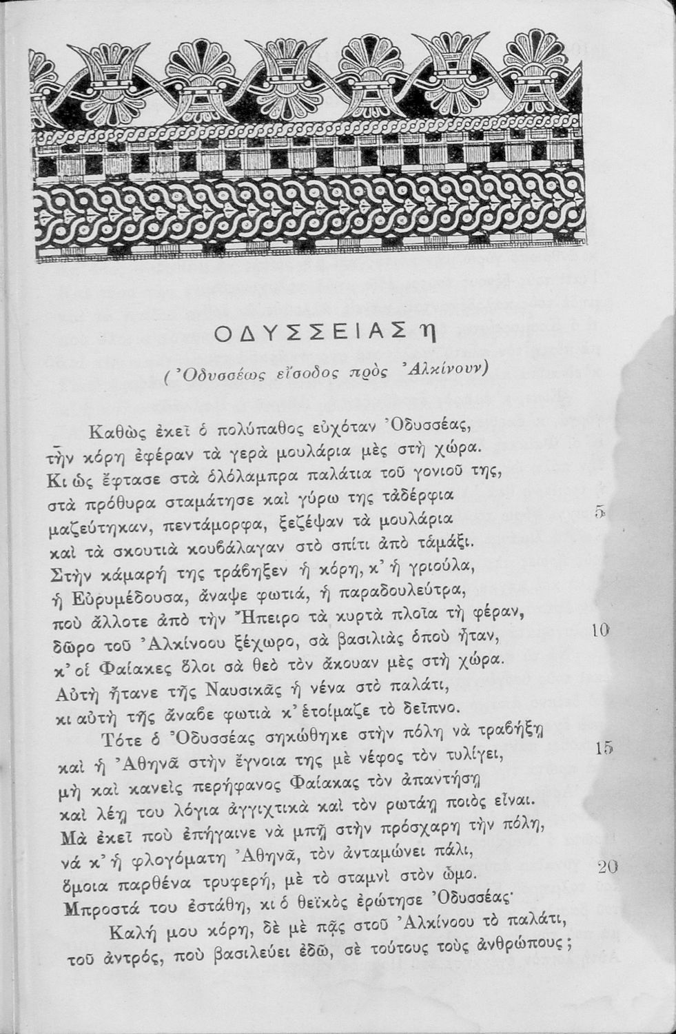 Σχολικό εγχειρίδιο για τις τρείς κατώτερες τάξεις Γυμνασίου και οι αντίστοιχες των λοιπών Σχολείων για το μάθημα των Αρχαίων Ελληνικών. Περιέχει τις ραψωδίες της Οδύσσειας και ερμηνευτικά, πραγματολογικά σχόλια, καθώς και γραμματικές παρατηρήσεις.