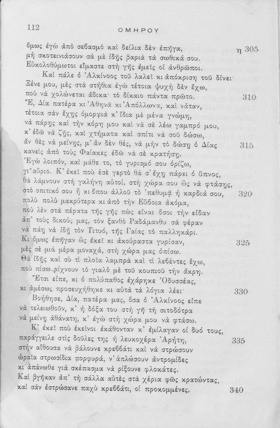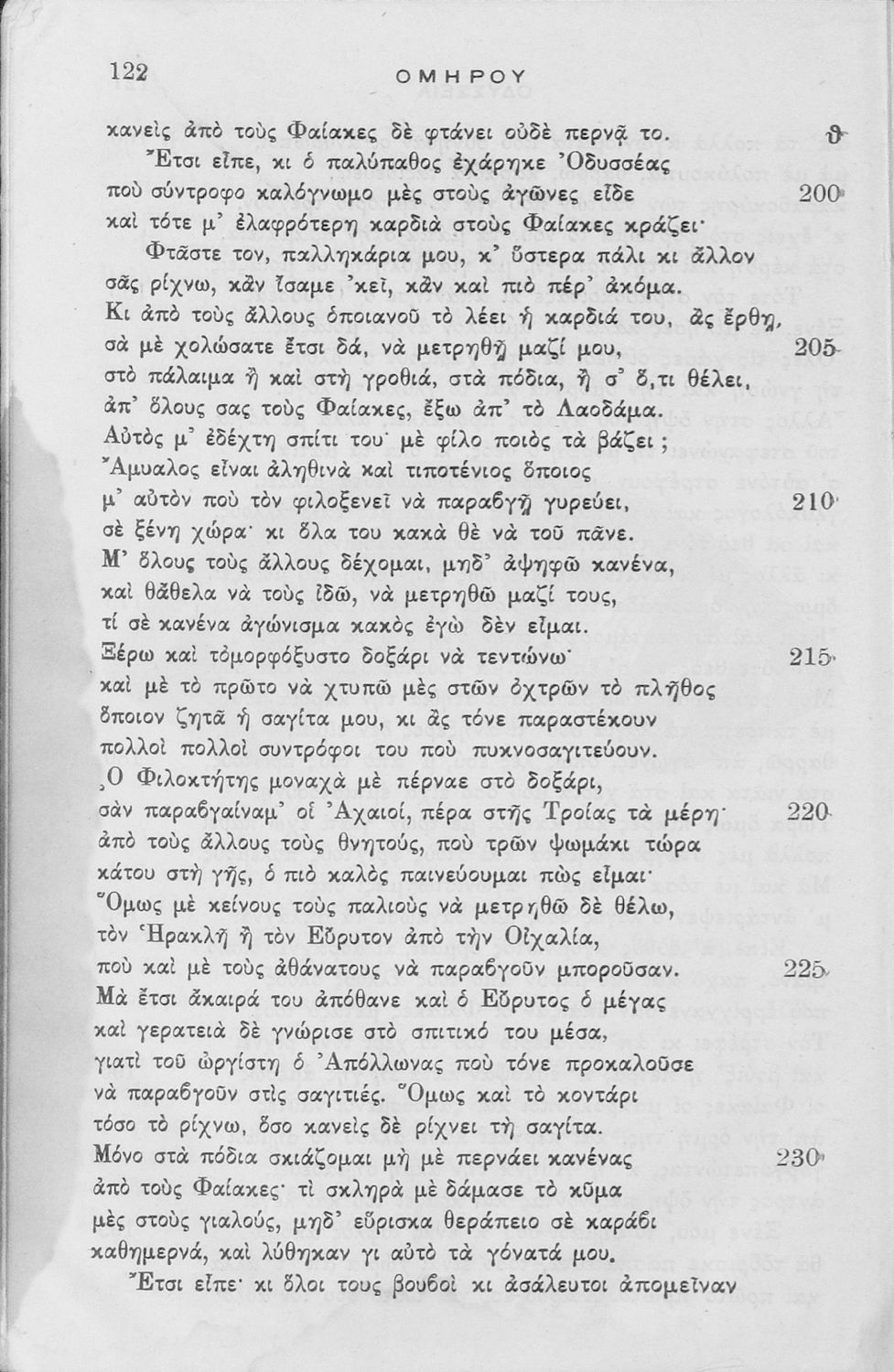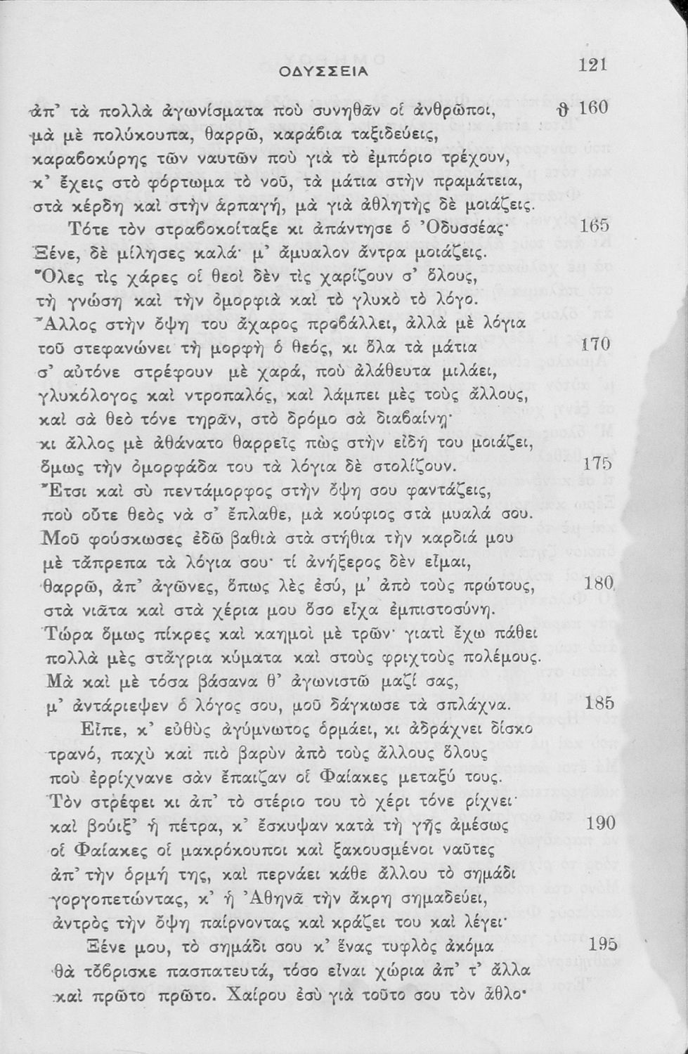 Σχολικό εγχειρίδιο για τις τρείς κατώτερες τάξεις Γυμνασίου και οι αντίστοιχες των λοιπών Σχολείων για το μάθημα των Αρχαίων Ελληνικών. Περιέχει τις ραψωδίες της Οδύσσειας και ερμηνευτικά, πραγματολογικά σχόλια, καθώς και γραμματικές παρατηρήσεις.