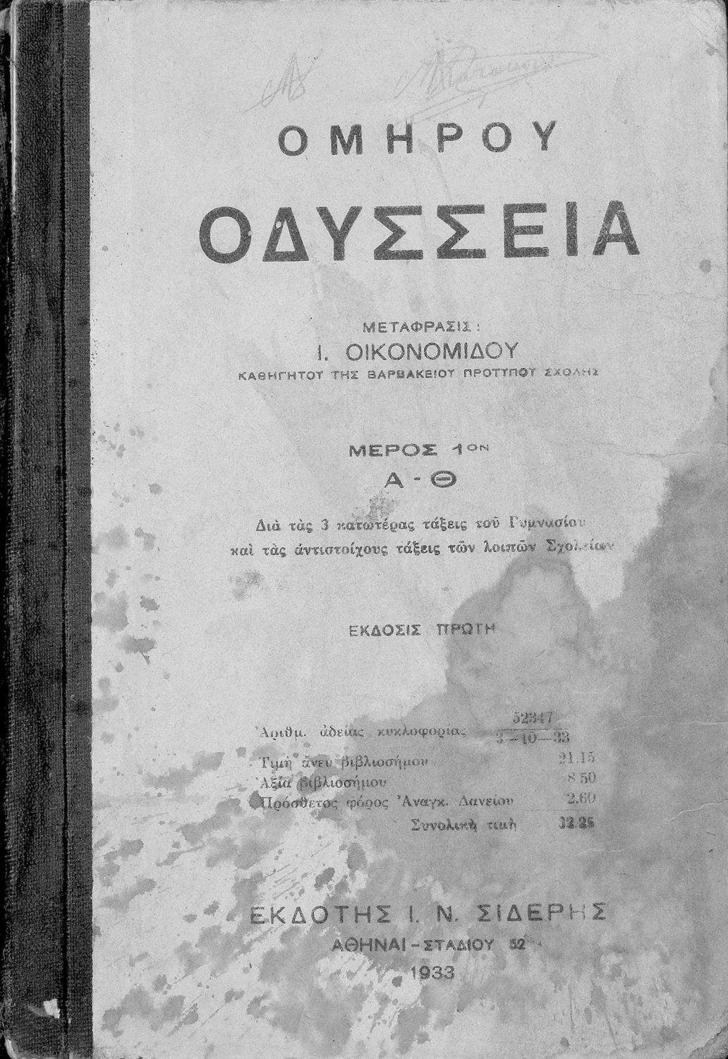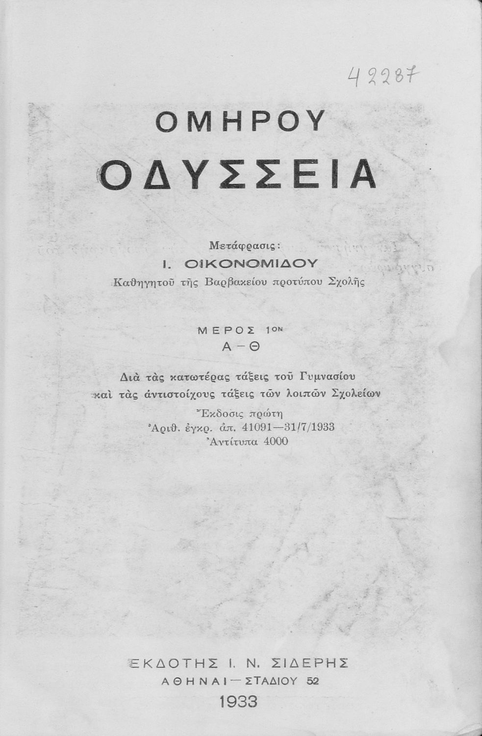 Τίτλος: Ομήρου Οδύσσεια Μέρος 1ο (Α-Θ). Δια τας κατωτέρας Τάξεις του Γυμνασίου και τας αντιστοίχους τάξεις των λοιπών Σχολείων
