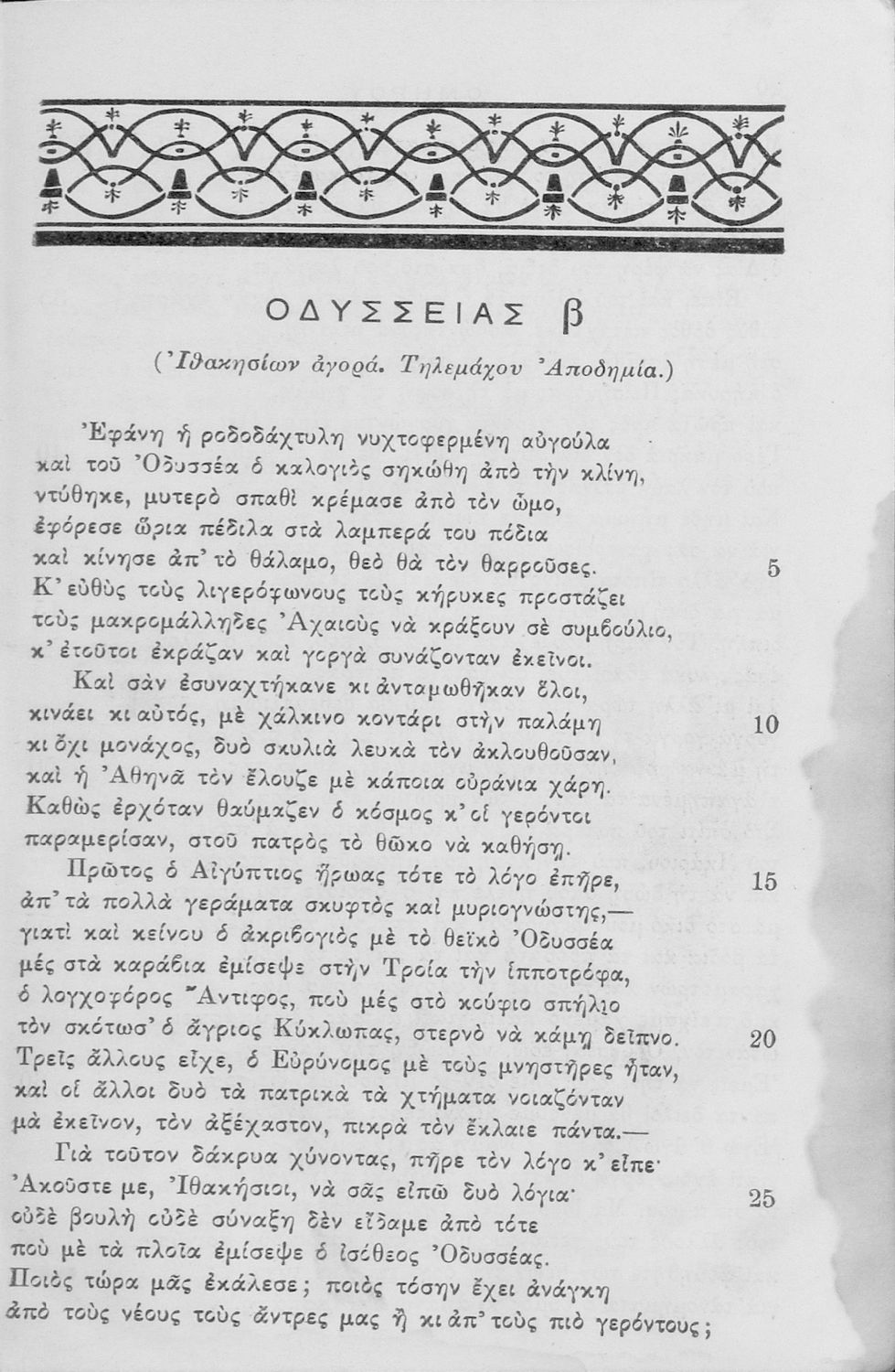 Σχολικό εγχειρίδιο για τις τρείς κατώτερες τάξεις Γυμνασίου και οι αντίστοιχες των λοιπών Σχολείων για το μάθημα των Αρχαίων Ελληνικών. Περιέχει τις ραψωδίες της Οδύσσειας και ερμηνευτικά, πραγματολογικά σχόλια, καθώς και γραμματικές παρατηρήσεις.