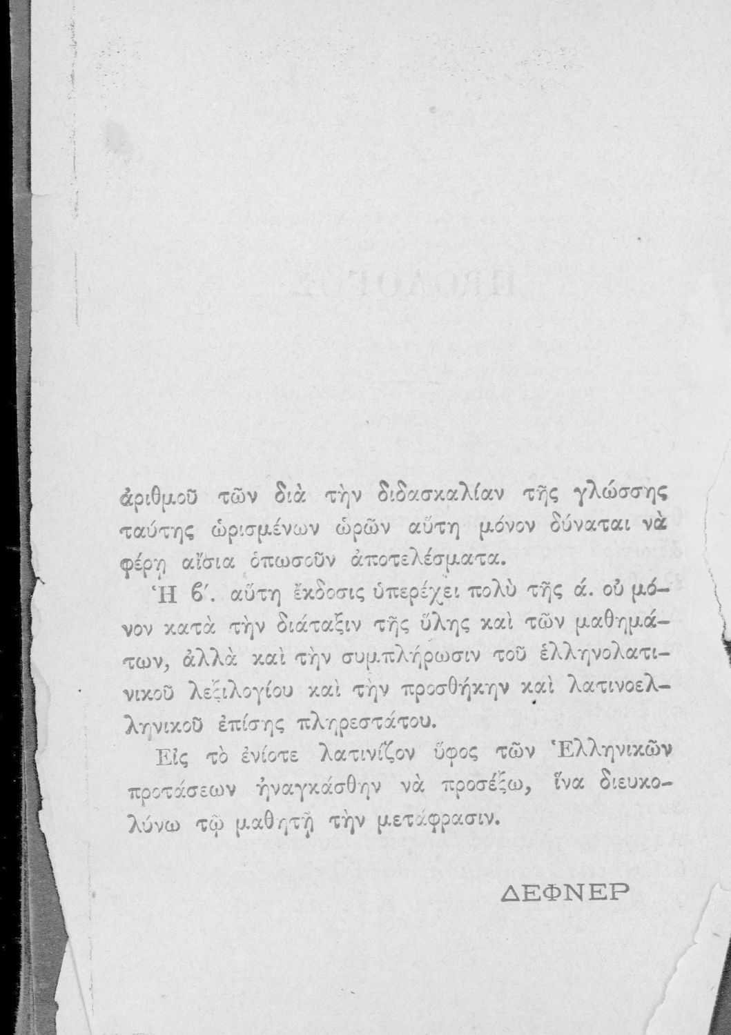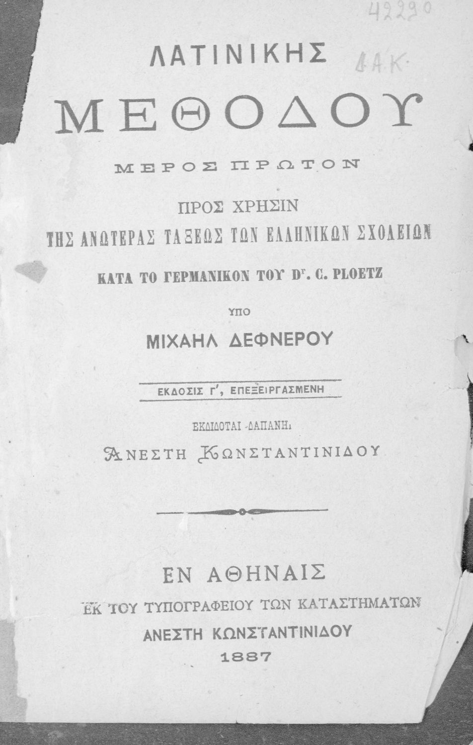 Κωδικός αναγνώρισης: 01-42290a Τίτλος: Λατινικής μεθόδου προς χρήσιν της ανωτέρας τάξεως των Ελληνικών Σχολείων κατά το γερμανικόν του Dr. C. Ploetz Συγγραφέας: Μιχαήλ Δέφνερ (Michael Deffner) Μέγεθος και υπόστρωμα: Σχολικό εγχειρίδιο, 16εκ., σκληρό εξώφυλλο, 280 σελίδες. |
