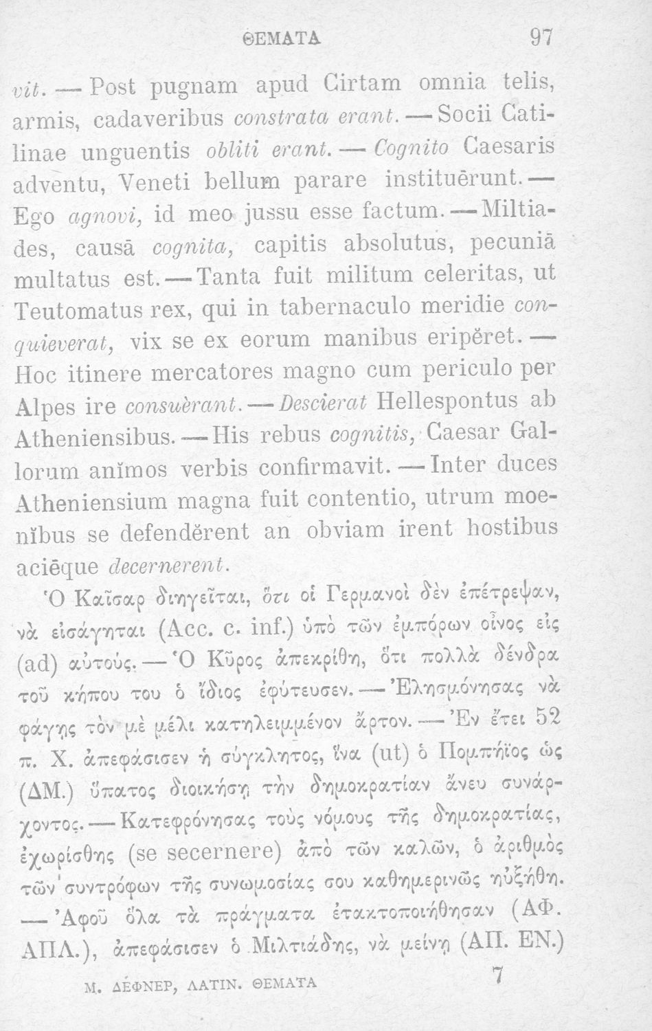 Κωδικός αναγνώρισης: 01-42290b Τίτλος: Λατινικής μεθόδου μέρος δεύτερον Θέματα προς χρήσιν της Α΄ τάξεως των Γυμνασίων κατά το γερμανικόν του Dr. C. Ploetz Συγγραφέας: Μιχαήλ Δέφνερ (Michael Deffner) Μέγεθος και υπόστρωμα: Σχολικό εγχειρίδιο, 16εκ., σκληρό εξώφυλλο, 218 σελίδες. |