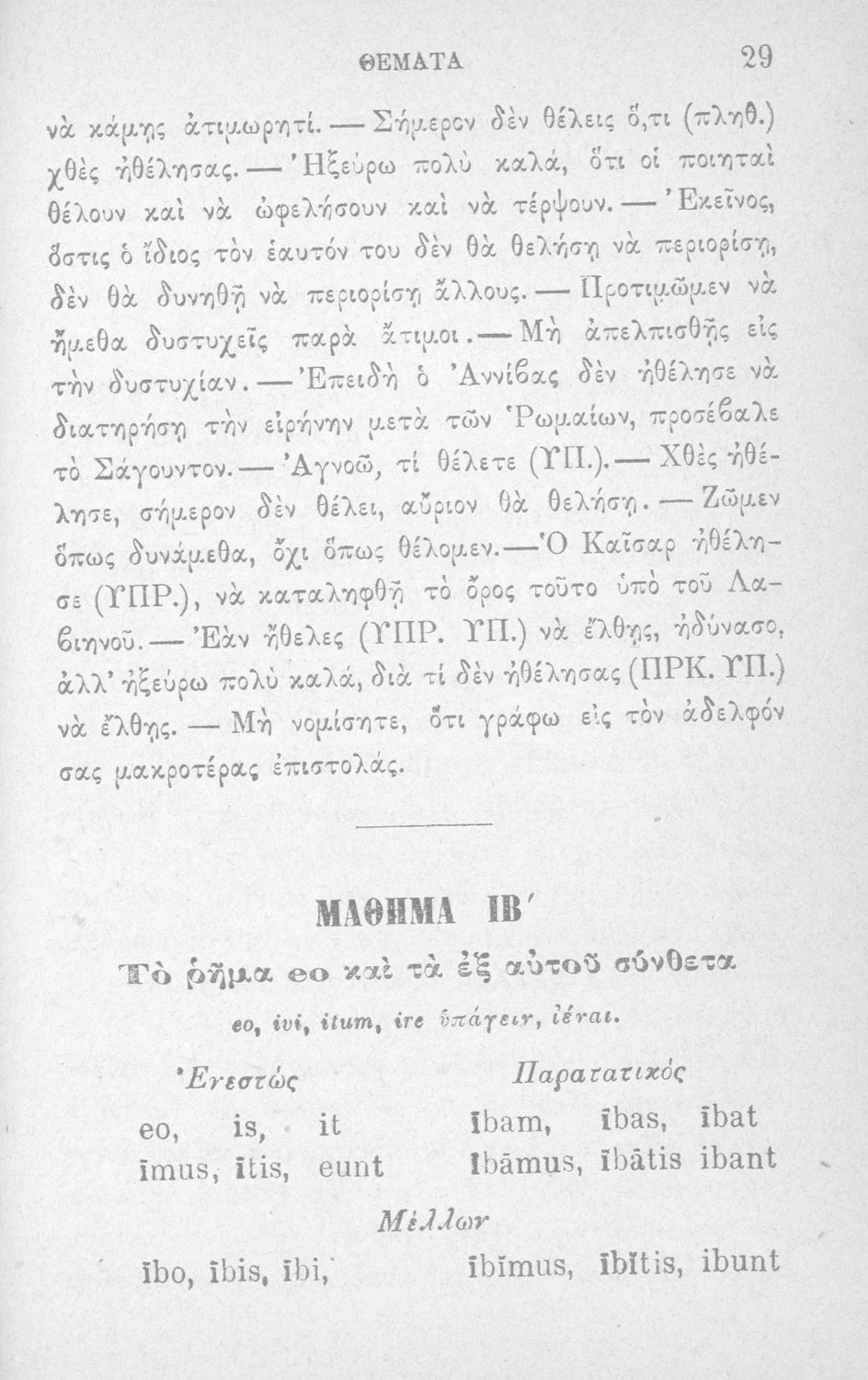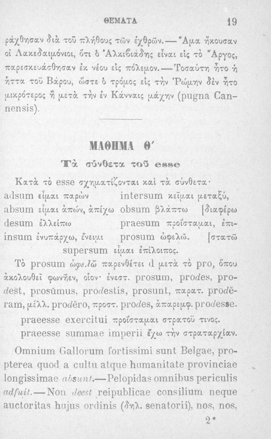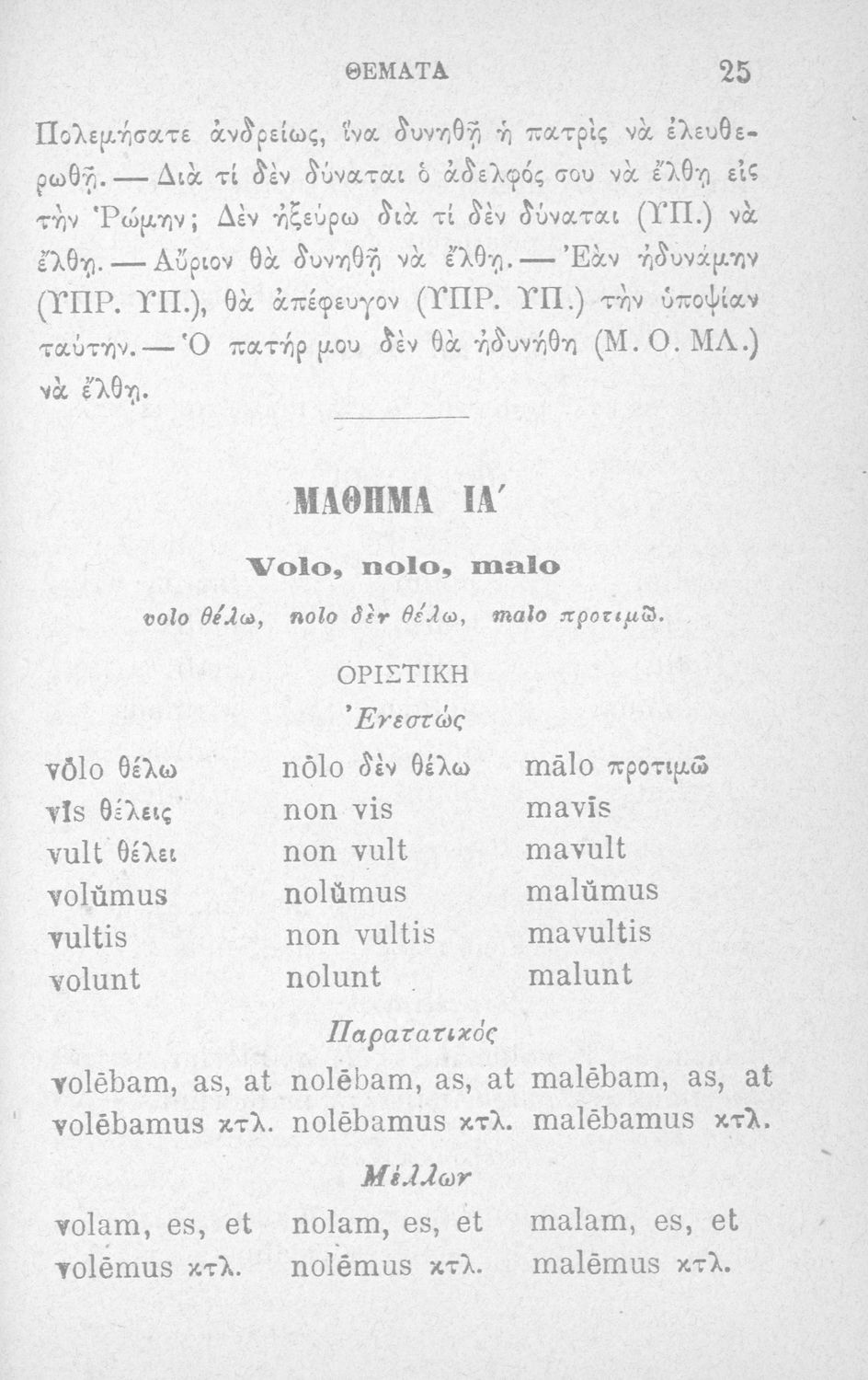 Σχολικό εγχειρίδιο Λατινικών που περιλαμβάνει γραμματική, συντακτικό, κείμενα και λεξιλόγιο.