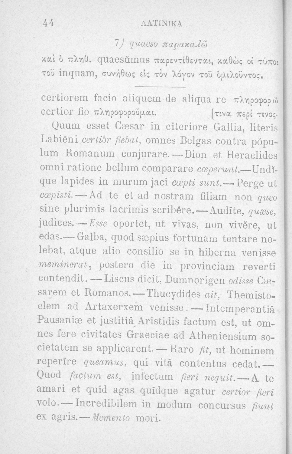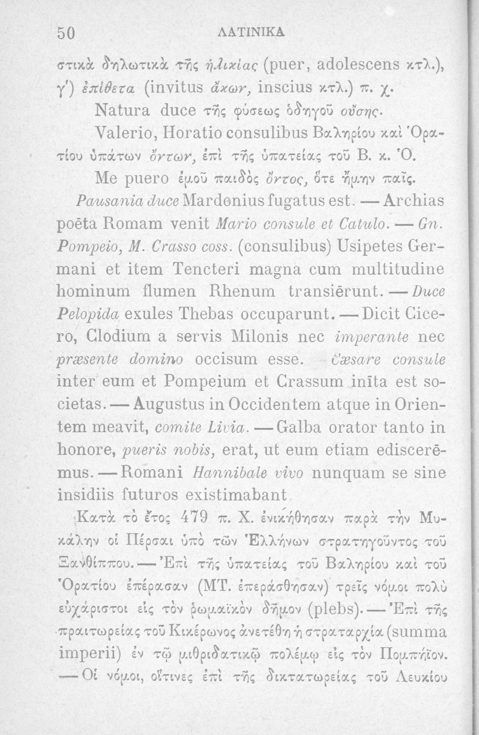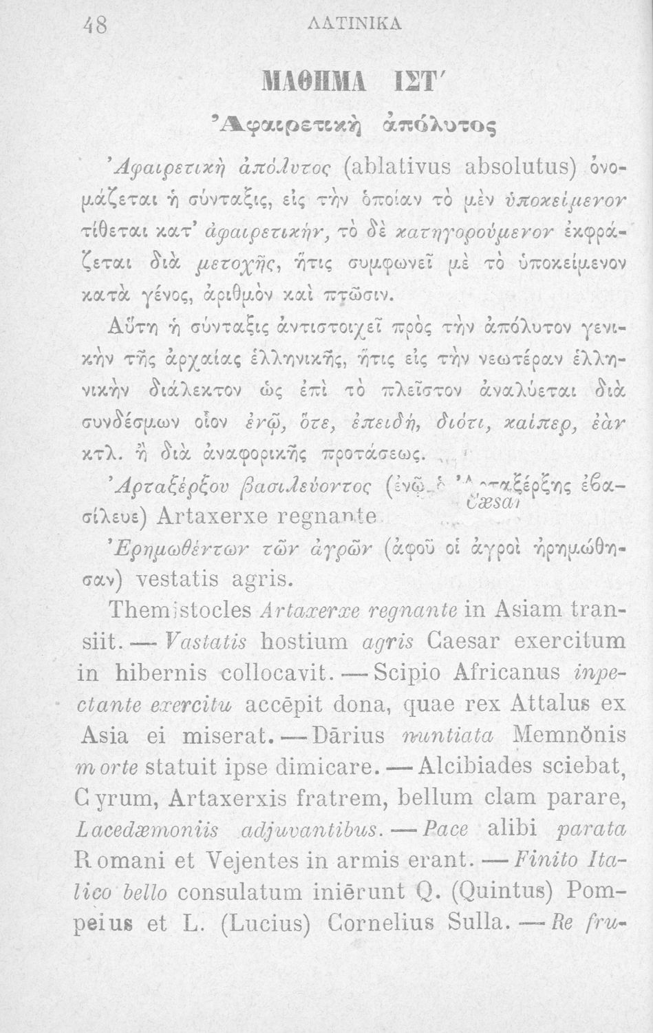 Σχολικό εγχειρίδιο Λατινικών που περιλαμβάνει γραμματική, συντακτικό, κείμενα και λεξιλόγιο.