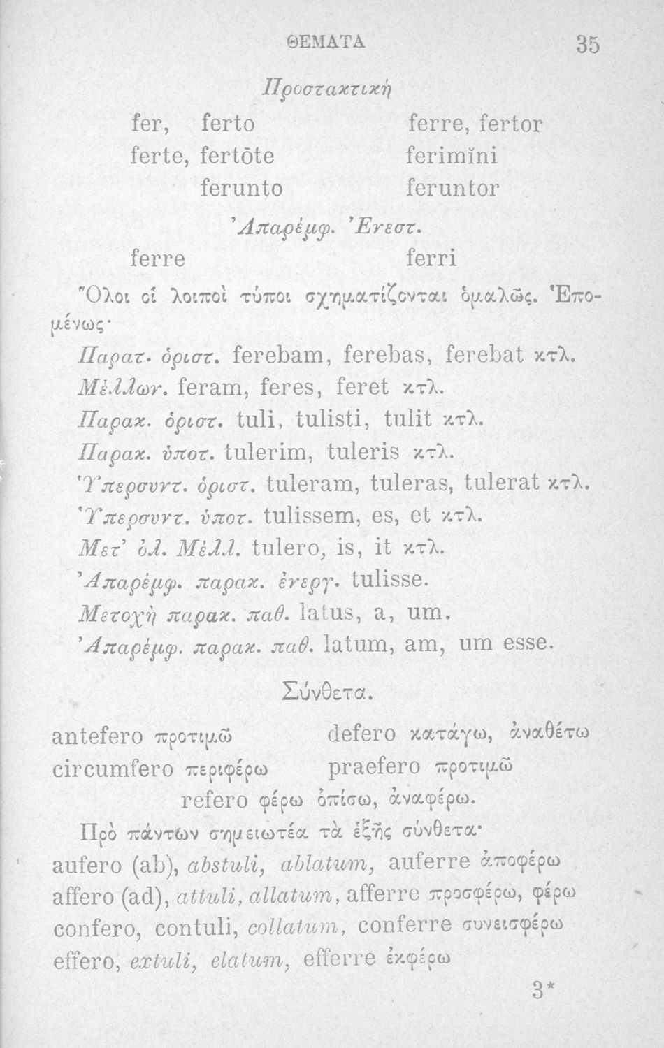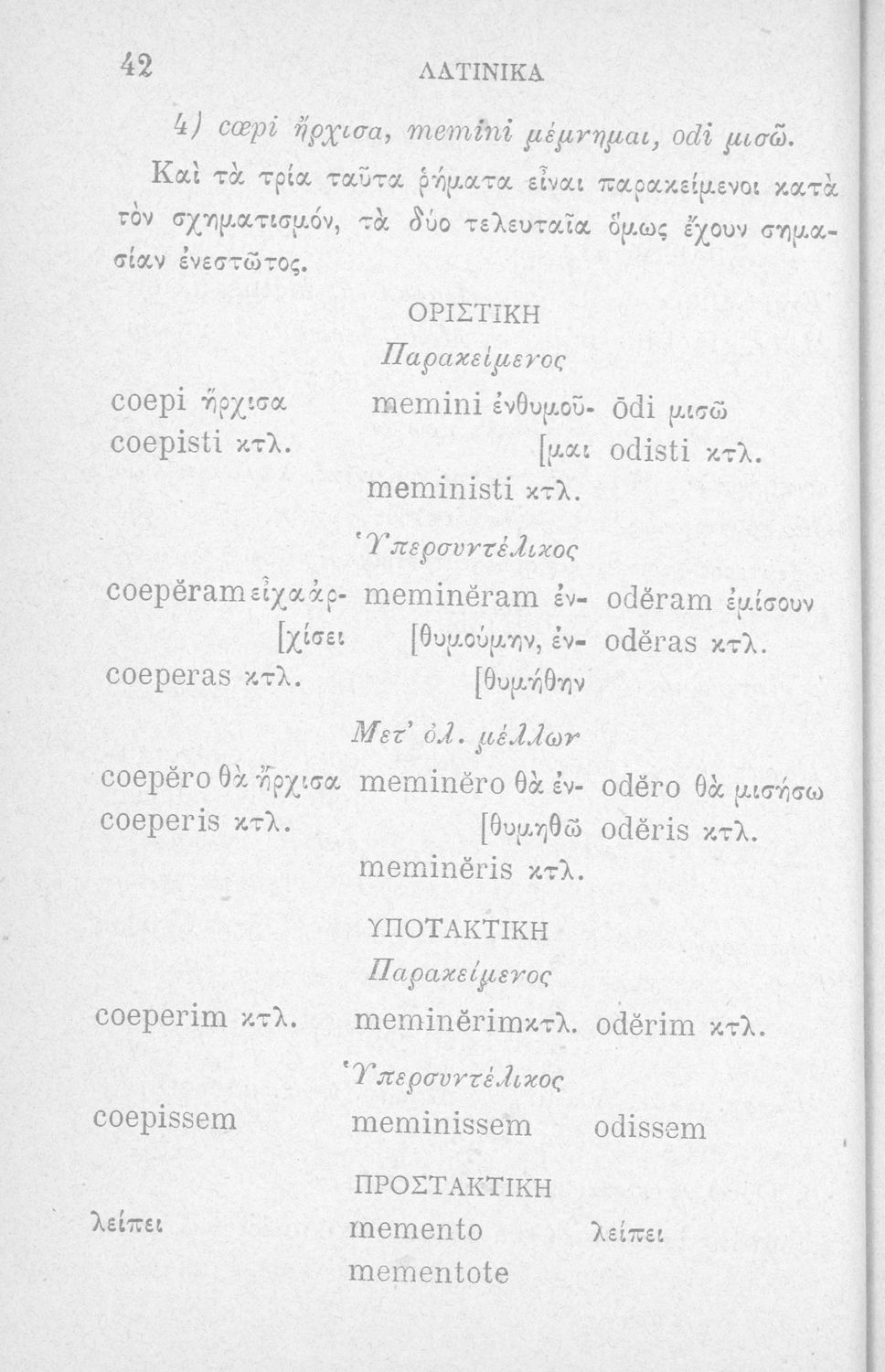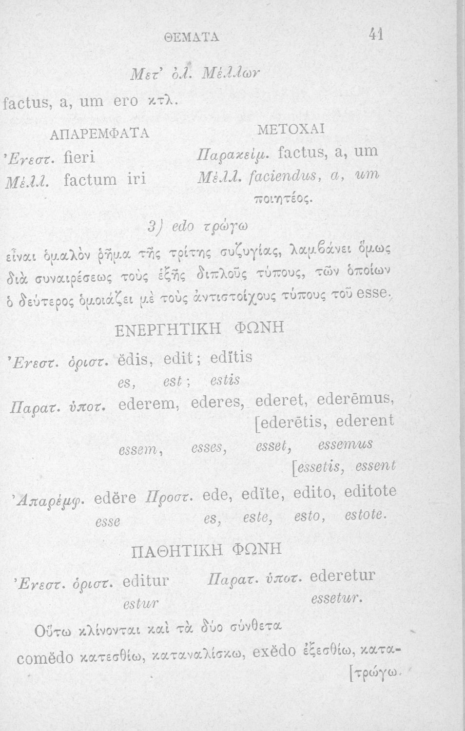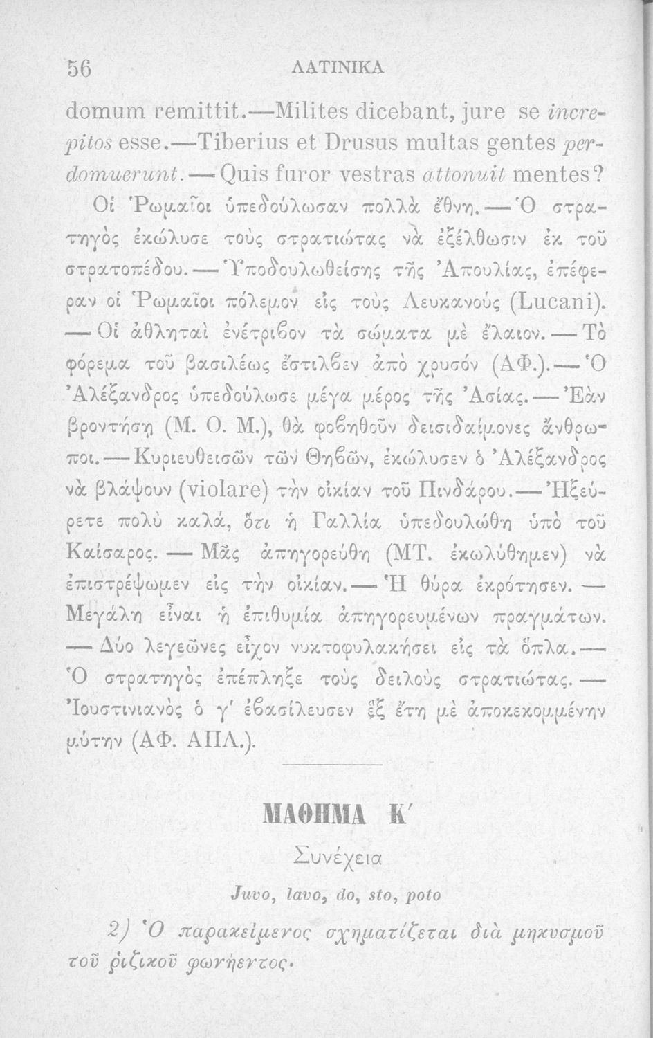 Σχολικό εγχειρίδιο Λατινικών Α΄, Β΄, Γ' Γυμνασίου που περιλαμβάνει γραμματική και συντακτικό και είναι χωρισμένο σε φθογγολογικό, τυπολογικό και ετυμολογικό μέρος.