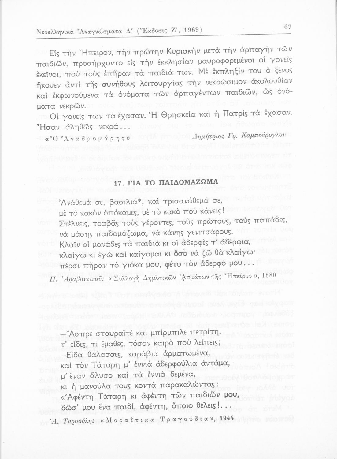 Σχολικό εγχειρίδιο Νέων Ελληνικών Δ΄ Γυμνασίου Θηλέων που περιλαμβάνει πεζά, ποιήματα και δημοτικά τραγούδια εμπνευσμένα από την σύγχρονη ελληνική ιστορία και την οικογενειακή και θρησκευτική ζωή. Περιέχει και