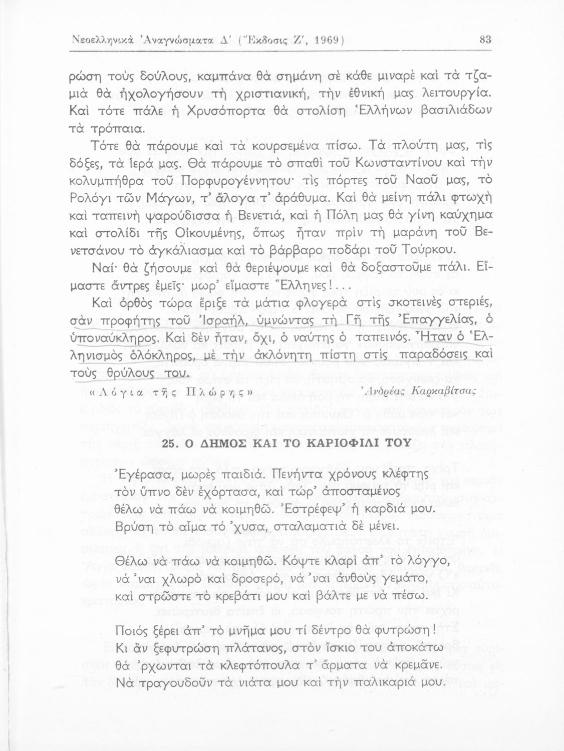 Σχολικό εγχειρίδιο Νέων Ελληνικών Δ΄ Γυμνασίου Θηλέων που περιλαμβάνει πεζά, ποιήματα και δημοτικά τραγούδια εμπνευσμένα από την σύγχρονη ελληνική ιστορία και την οικογενειακή και θρησκευτική ζωή. Περιέχει και