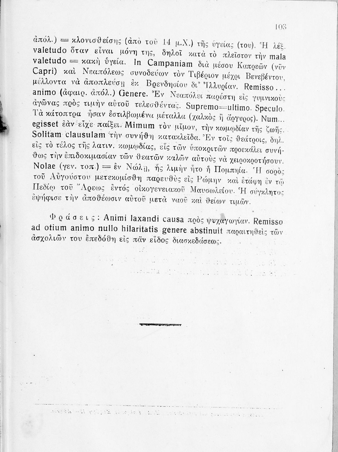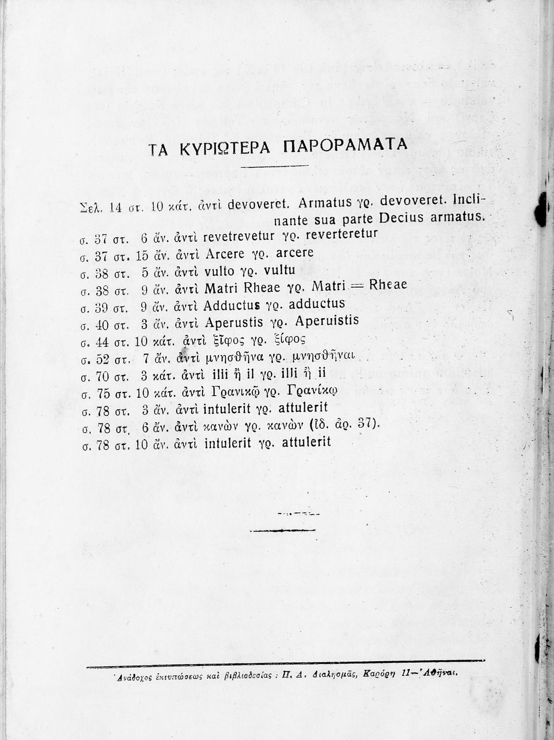 Βαθμίδα εκπαίδευσης: Δευτεροβάθμια Μάθημα: Λατινικά Γλώσσα: Καθαρεύουσα Παρουσίαση περιεχομένου: Σχολικό εγχειρίδιο Λατινικών που περιέχει σύντομο βιογραφικό σημείωμα του Lhomond, 64 αποσπάσματα από το βιβλίο του, ερμηνευτικές σημειώσεις και λεξιλόγιο. Παρουσιάζει βίους επιφανών Ρωμαίων από το 753 π.Χ μέχρι το 14 μ.Χ. Ο επιμελητής ήταν καθηγητής της Λατινικής Φιλολογίας στο Πανεπιστήμιο Αθηνών. |