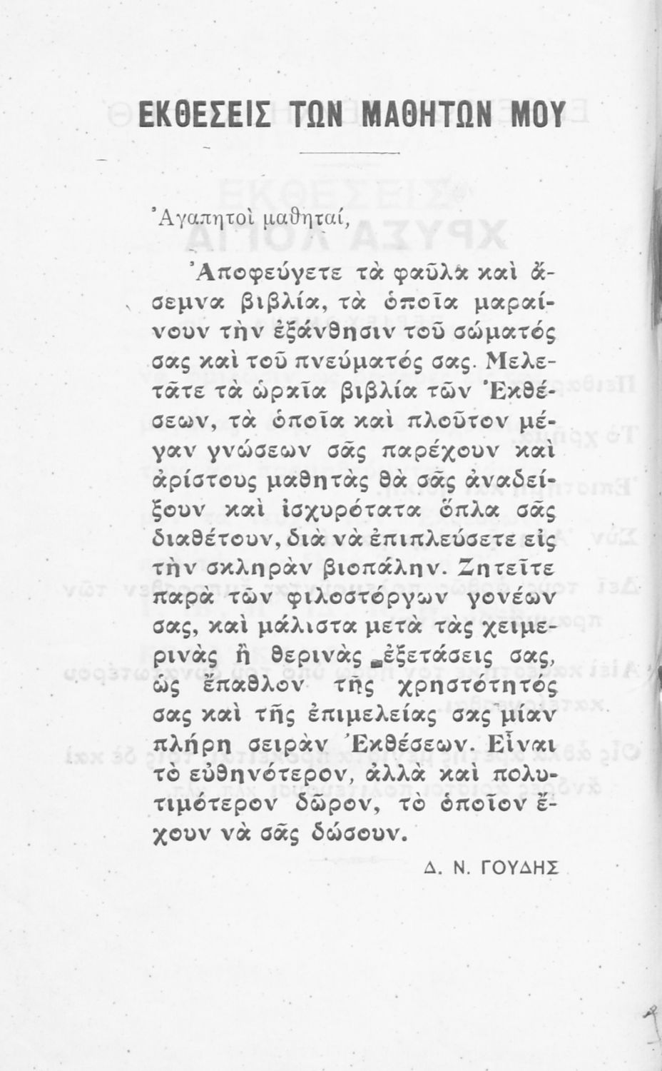 Σχολικό εγχειρίδιο Νεοελληνικών αναγνωσμάτων που περιλαμβάνει πεζά και ποιήματα Ελλήνων συγγραφέων με θέματα από την εθνική ζωή. Περιέχει και παράρτημα με βιογραφίες των συγγραφέων και λεξιλόγιο.