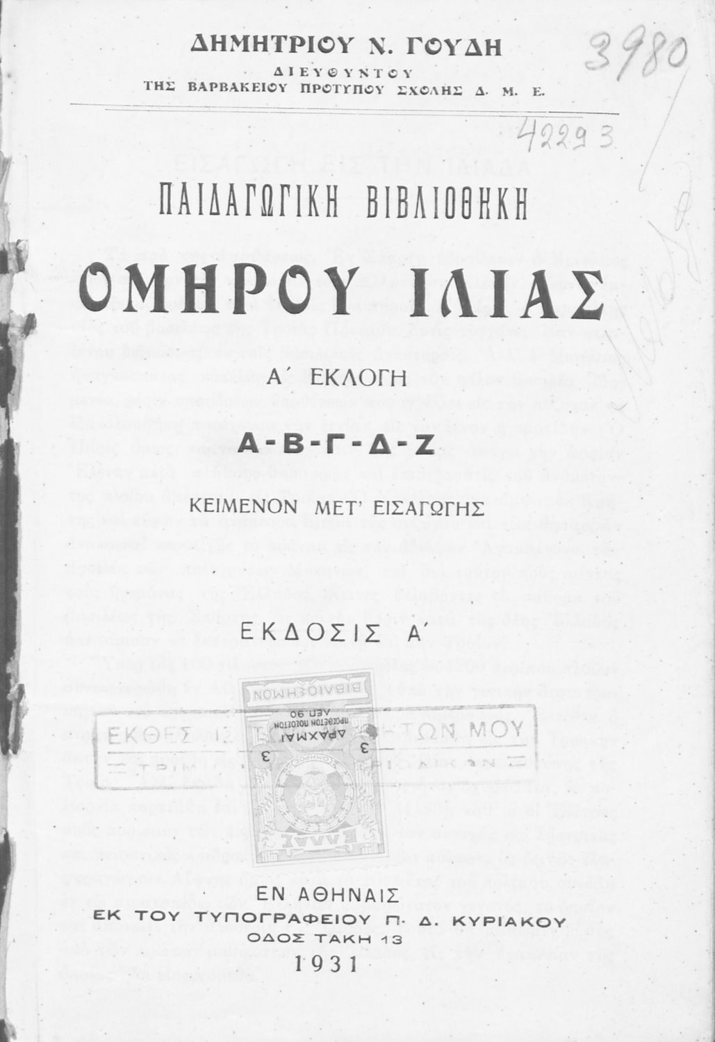 Εκδότης: Τυπογραφείο Π.Δ. Κυριάκου Έτος έκδοσης: 1931 Τόπος έκδοσης: Αθήνα Έκδοση: 1η |