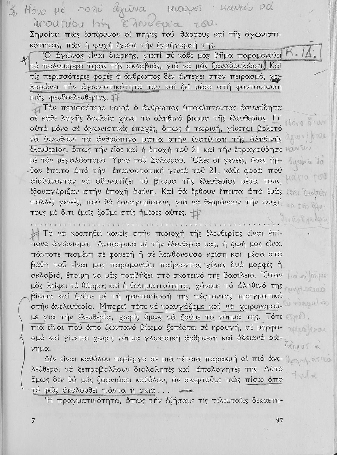 Σχολικό εγχειρίδιο Νέων Ελληνικών Γ' Λυκείου που περιλαμβάνει πεζά και ποιήματα Ελλήνων και ξένων συγγραφέων εμπνευσμένα από τη θρησκευτική παράδοση, την αρχαία και σύγχρονη ελληνική ιστορία, και τις ηθικές αξίες. Περιέχει παράρτημα με βιογραφίες των συγγραφέων και λεξιλόγιο.