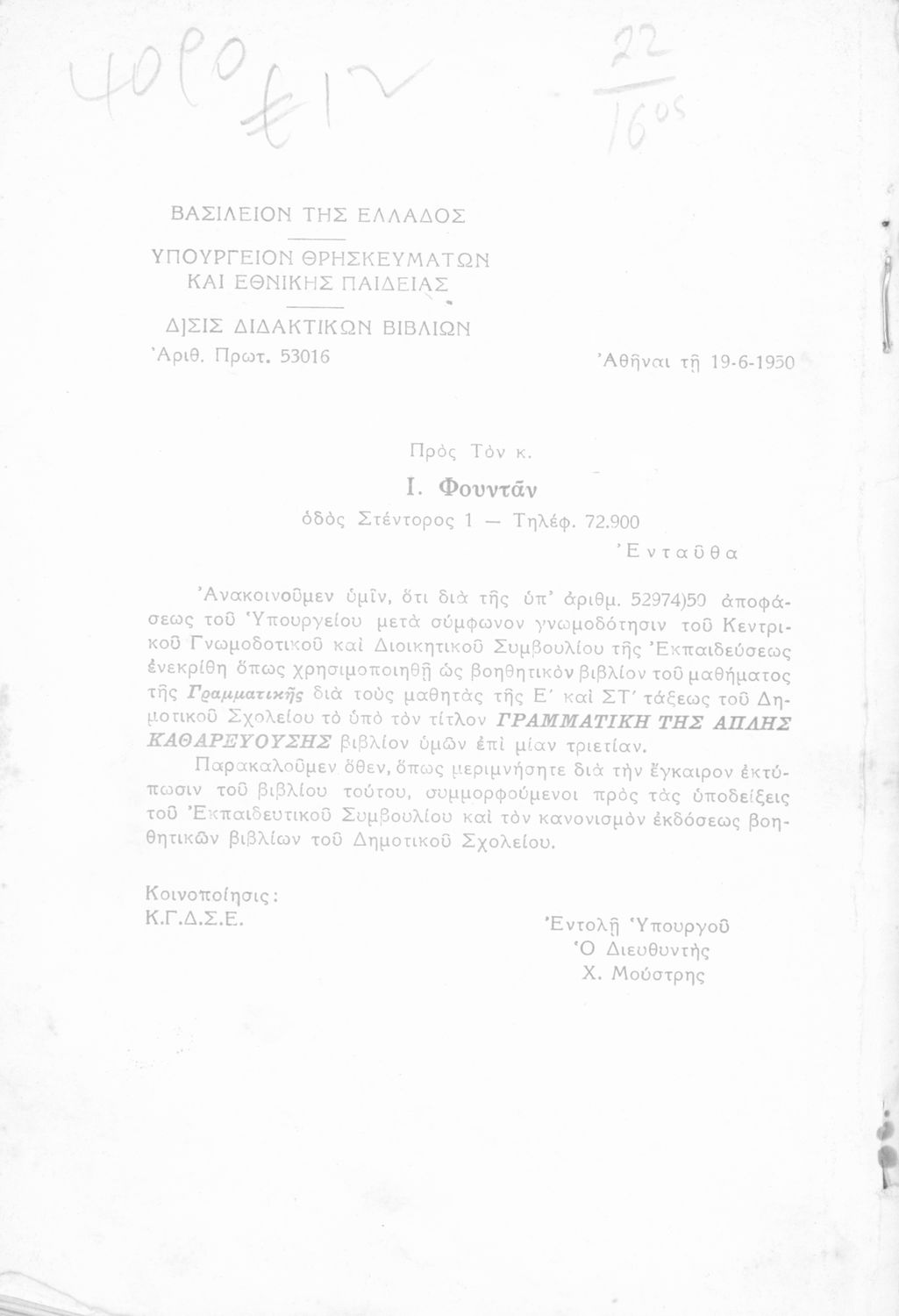 Υπουργική απόφαση / Σύμβαση: 53016/1950