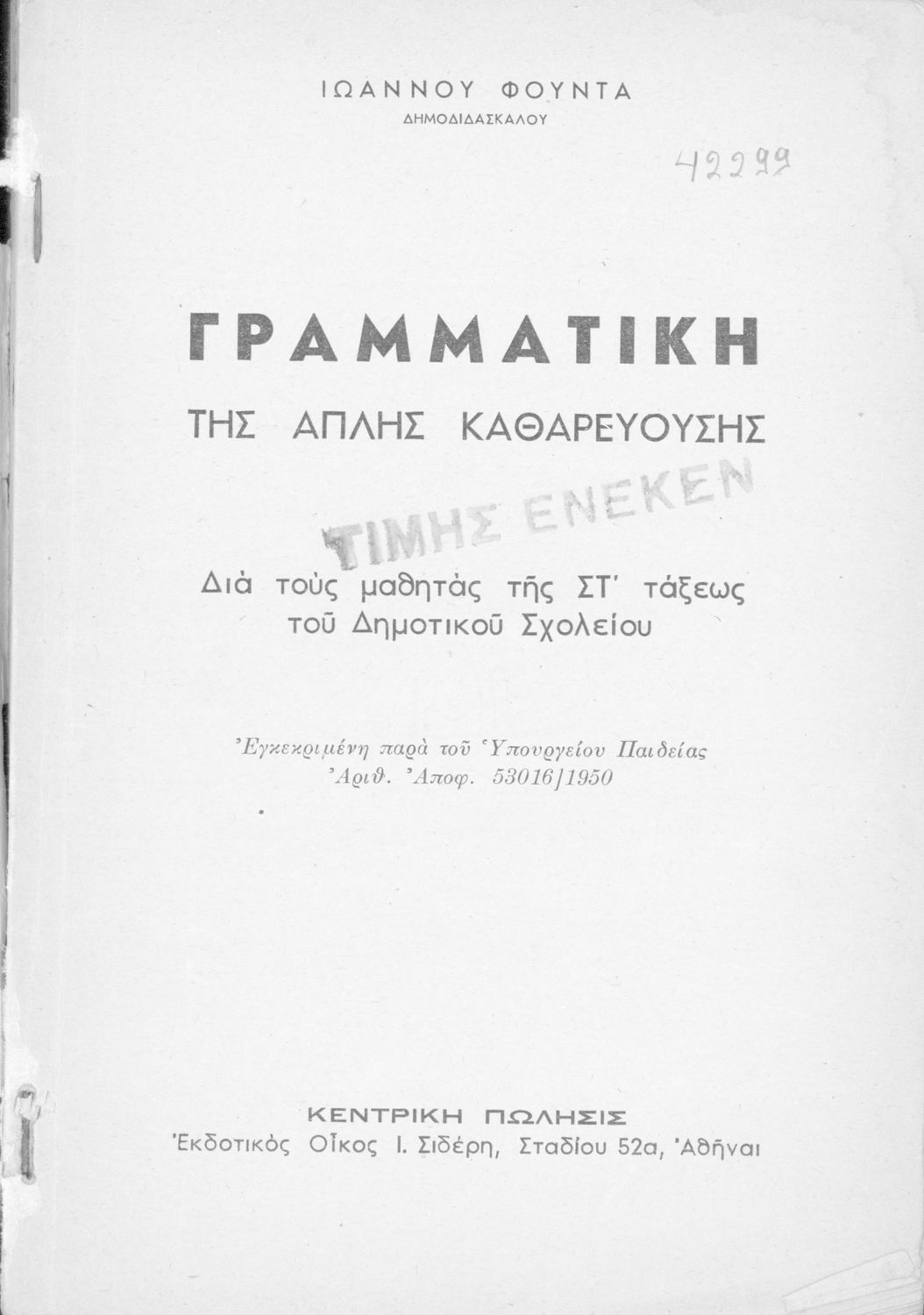 Εκδότης: Ιωάννης Ν. Σιδέρης Τόπος έκδοσης: Αθήνα Υπουργική απόφαση / Σύμβαση: 53016/1950 Έτος έγκρισης: 1950 |