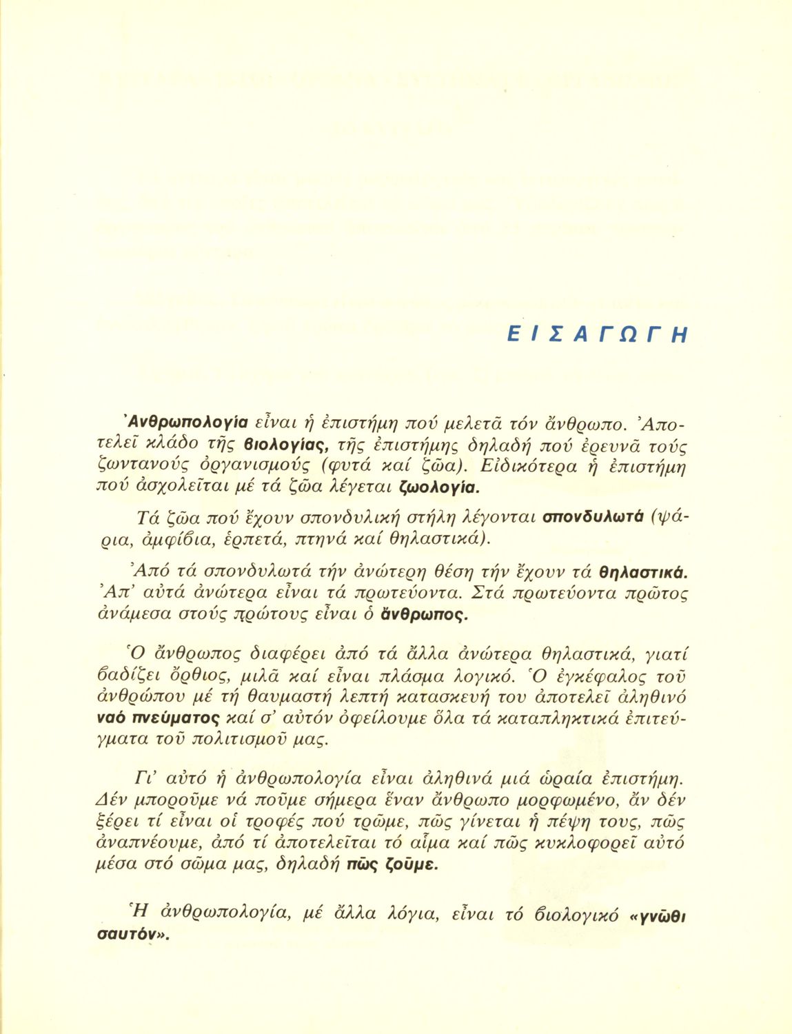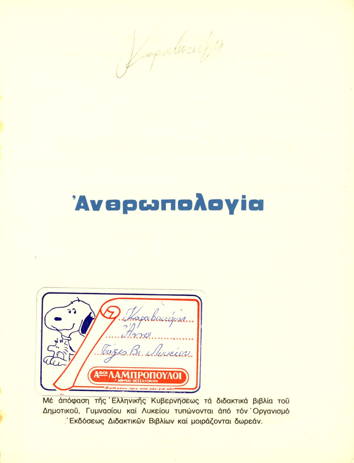 Σχολικό εγχειρίδιο Ανθρωπολογίας Β΄ Λυκείου που εστιάζει στην κατασκευή, ανάπτυξη και λειτουργία του ανθρώπινου οργανισμού και τη σχέση του ανθρώπου με το φυσικό περιβάλλον. Περιέχει και αναφορά στις ανθρώπινες φυλές.