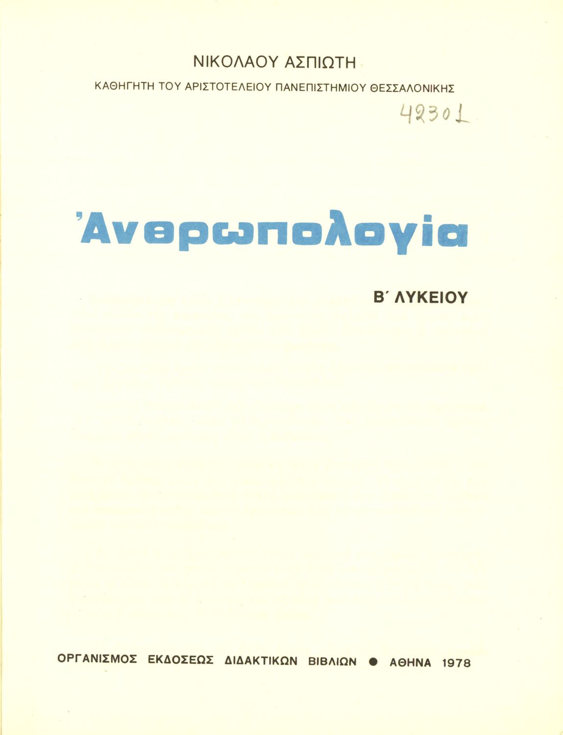Κωδικός αναγνώρισης: 01-42301 Τίτλος: Ανθρωπολογία Β΄ Λυκείου Συγγραφέας: Νικόλαος Ασπιώτης Μέγεθος και υπόστρωμα: Σχολικό εγχειρίδιο, μαλακό εξώφυλλο, 226 σελίδες. Σκίτσα (έγχρωμα). |