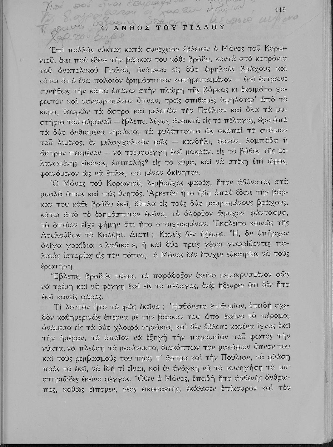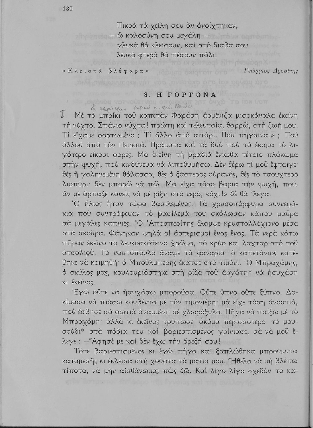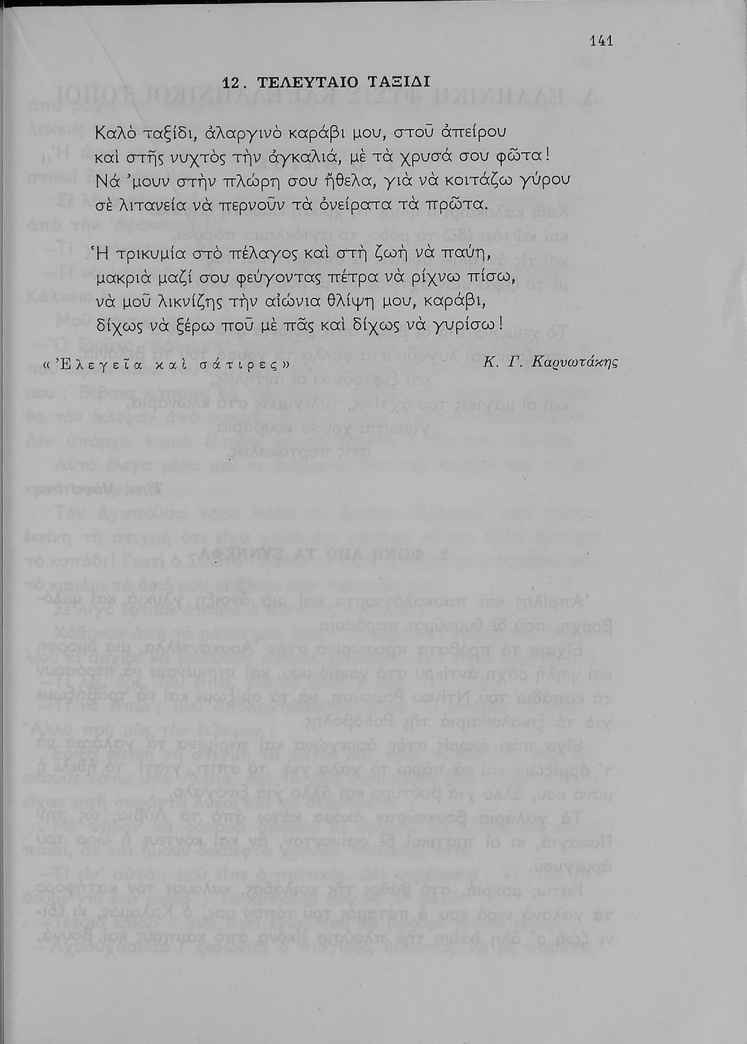 Σχολικό εγχειρίδιο Νέων Ελληνικών Δ΄ Γυμνασίου Θηλέων που περιλαμβάνει πεζά, ποιήματα και δημοτικά τραγούδια εμπνευσμένα από την σύγχρονη ελληνική ιστορία και την οικογενειακή και θρησκευτική ζωή. Περιέχει και