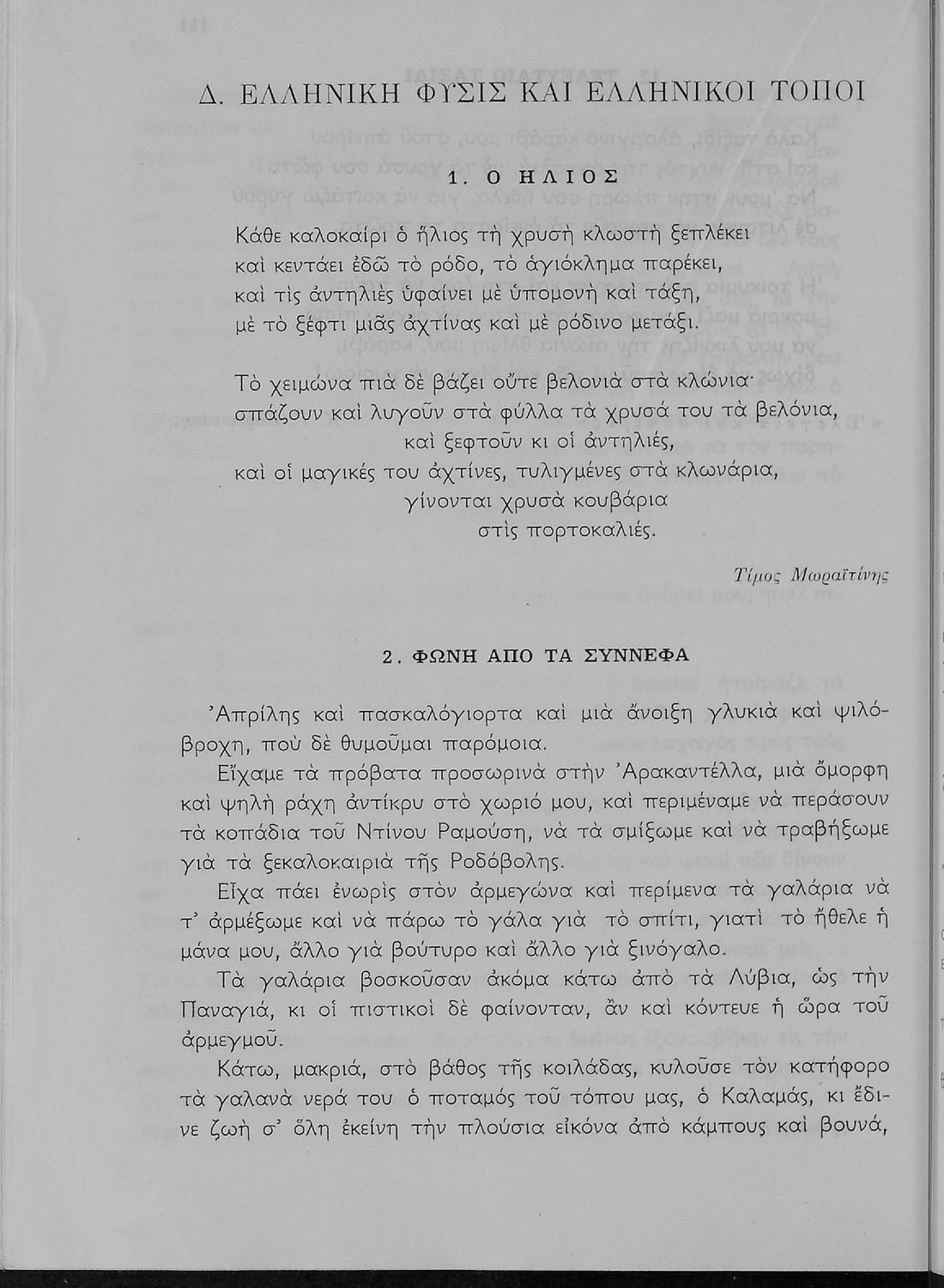 Σχολικό εγχειρίδιο Νέων Ελληνικών Δ' Γυμνασίου που περιλαμβάνει πεζά, ποιήματα και παροιμίες Ελλήνων συγγραφέων εμπνευσμένα από την θρησκευτική και κοινωνική ζωή, τη βυζαντινή ιστορία, την αρχαία και σύγχρονη ελληνική ιστορία, και την ελληνική φύση. Περιέχει παράρτημα με βιογραφίες των συγγραφέων και λεξιλόγιο.