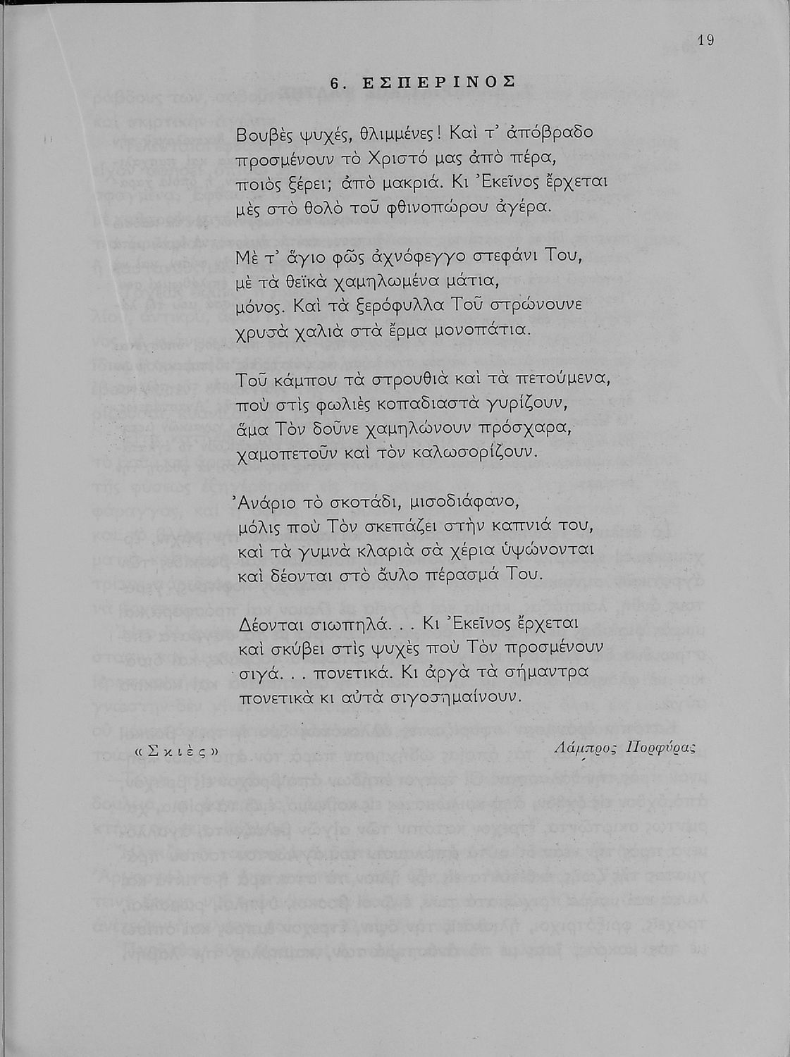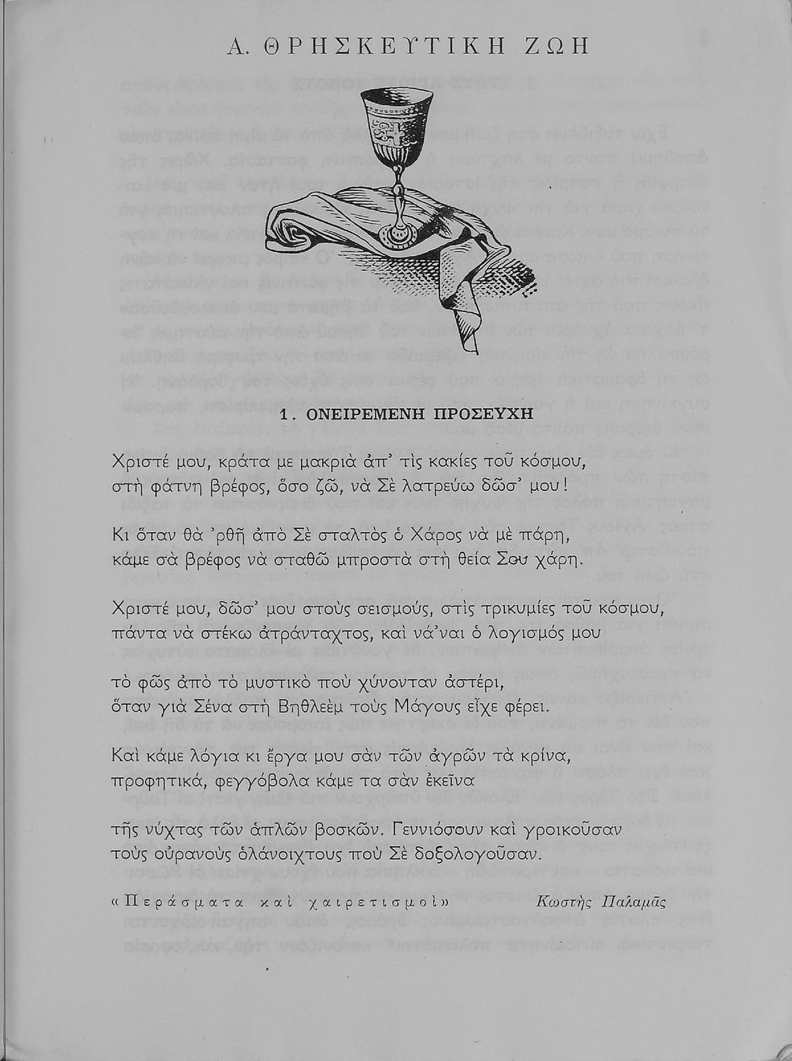 Σχολικό εγχειρίδιο Νέων Ελληνικών Δ΄ Γυμνασίου και Β΄ Αστικού Σχολείου που περιέχει πεζά και ποιήματα Ελλήνων συγγραφέων εμπνευσμένα από τη θρησκευτική και κοινωνική ζωή, την ελληνική μυθολογία, την αρχαία και
