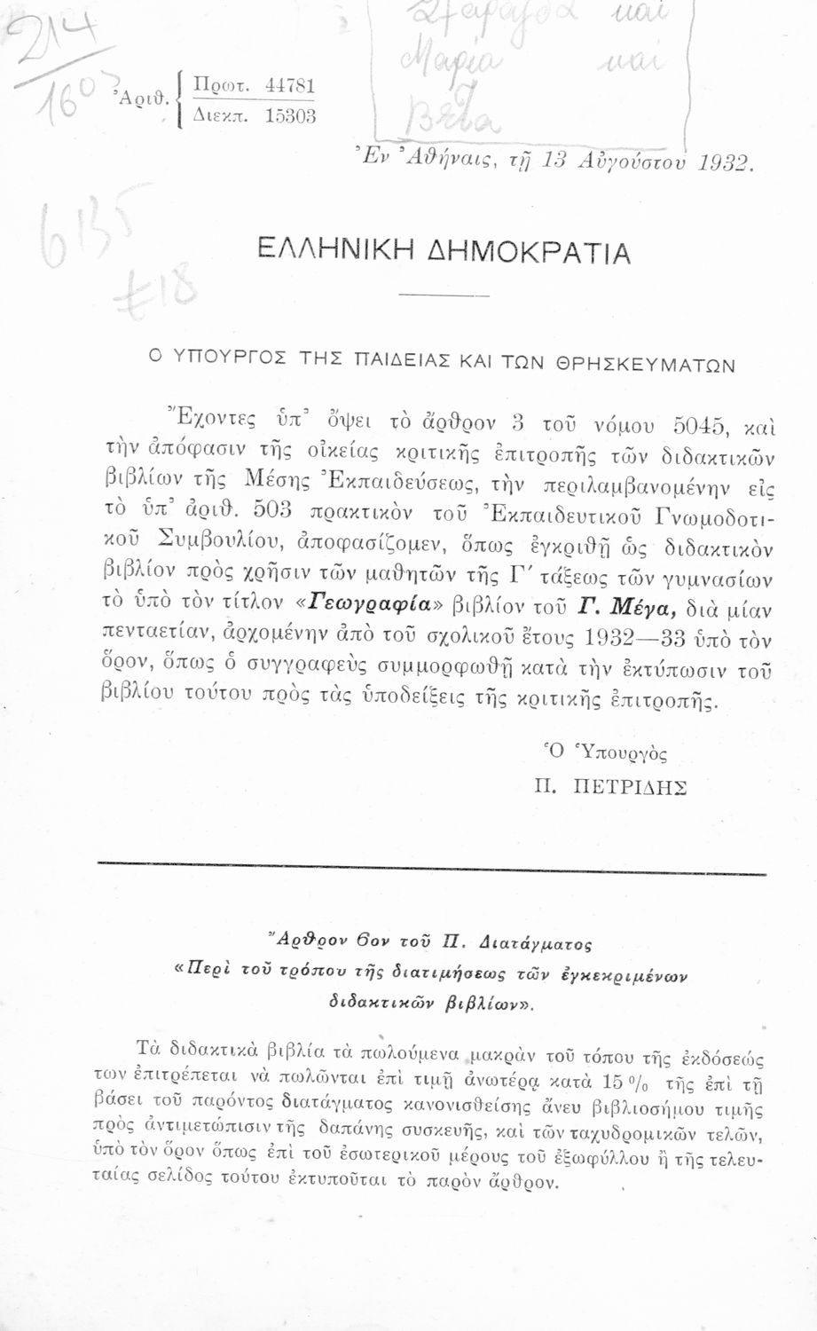 Υπουργική απόφαση / Σύμβαση: 44781/13-8-1932