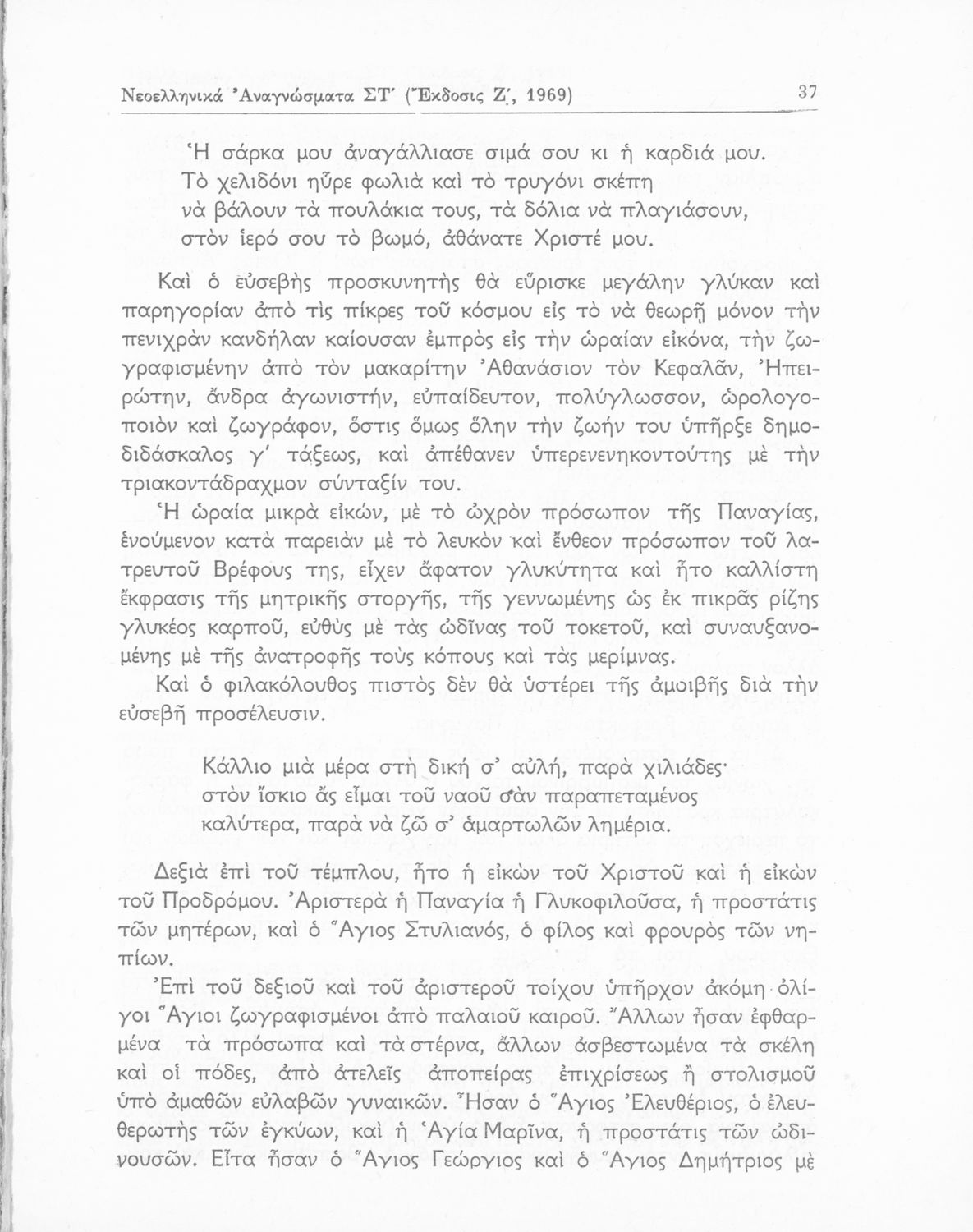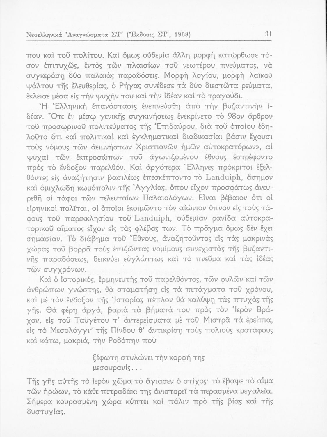Βαθμίδα εκπαίδευσης: Δευτεροβάθμια Τάξη: ΣΤ' Γυμνασίου Μάθημα: Νέα Ελληνικά Γλώσσα: Καθαρεύουσα Παρουσίαση περιεχομένου: Σχολικό εγχειρίδιο Νέων Ελληνικών για τη ΣΤ΄ Γυμνασίου. Περιέχει νεοελληνικά αναγνώσματα της εποχής με ποιήματα και κείμενα Ελλήνων και ξένων ποιητών και λογοτεχνών. Διαθέτει παράρτημα με λεξιλόγιο και βιογραφίες συγγραφέων. Στο βιβλίο υπάρχει το σύμβολο της επταετίας. |