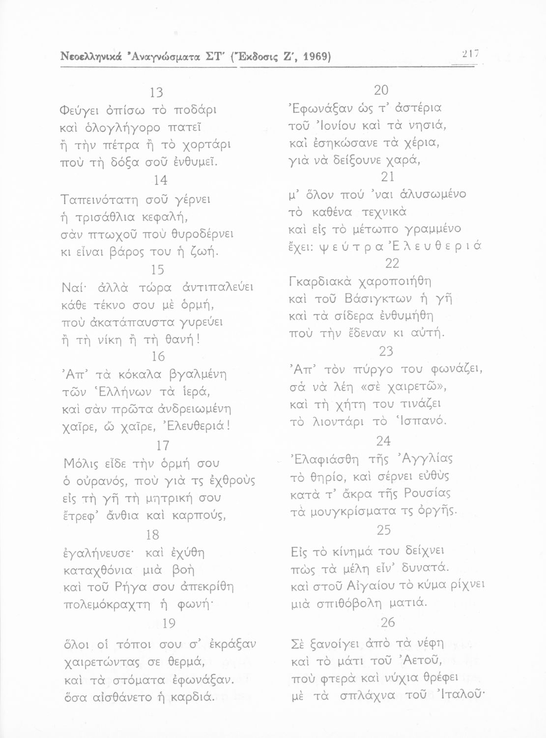 Σχολικό εγχειρίδιο Νέων Ελληνικών για τη ΣΤ΄ Γυμνασίου. Περιέχει νεοελληνικά αναγνώσματα της εποχής με ποιήματα και κείμενα Ελλήνων και ξένων ποιητών και λογοτεχνών. Διαθέτει παράρτημα με λεξιλόγιο και βιογραφίες συγγραφέων. Στο βιβλίο υπάρχει το σύμβολο της επταετίας.