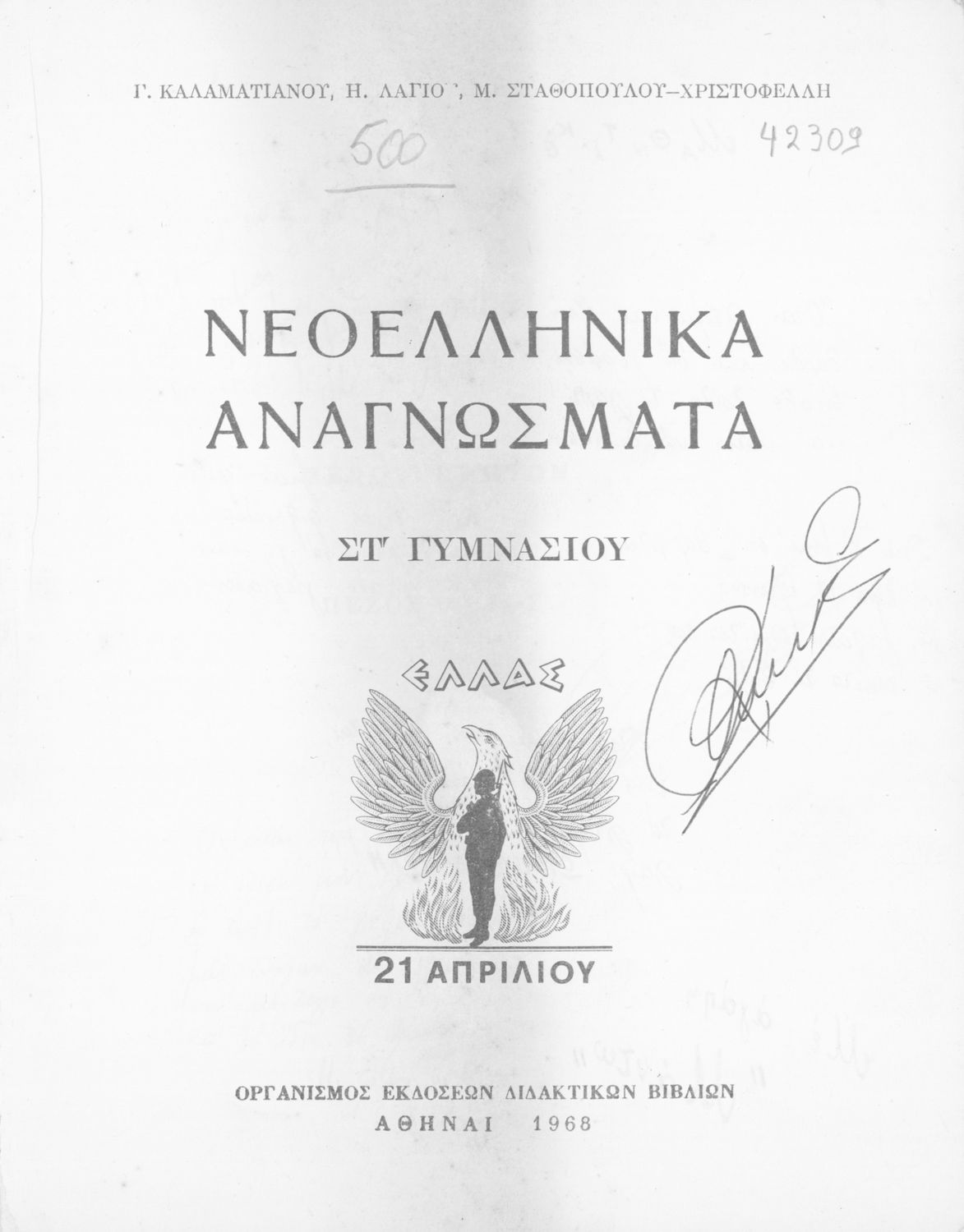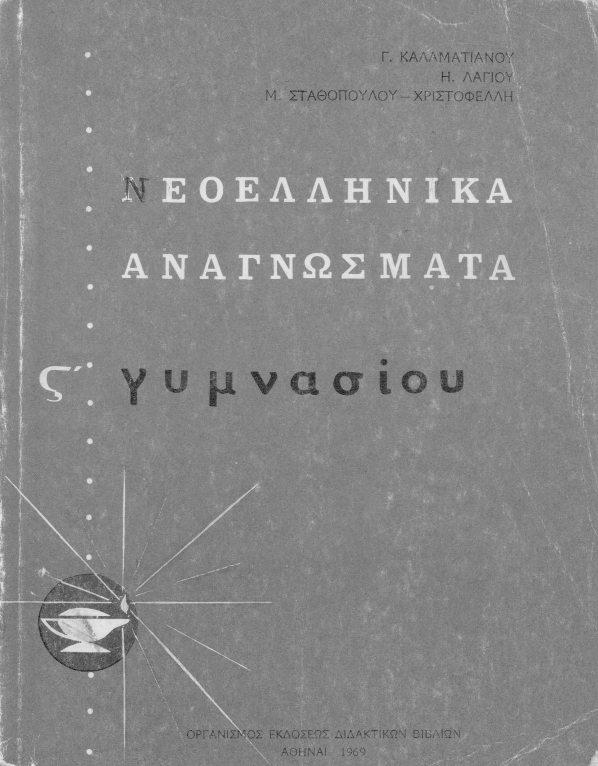Σχολικό εγχειρίδιο Νέων Ελληνικών ΣΤ΄ Γυμνασίου και Λυκείου που περιλαμβάνει κείμενα Ελλήνων και ξένων συγγραφέων με θέματα από την σύγχρονη ελληνική ιστορία και την οικογενειακή και θρησκευτική ζωή, και ...